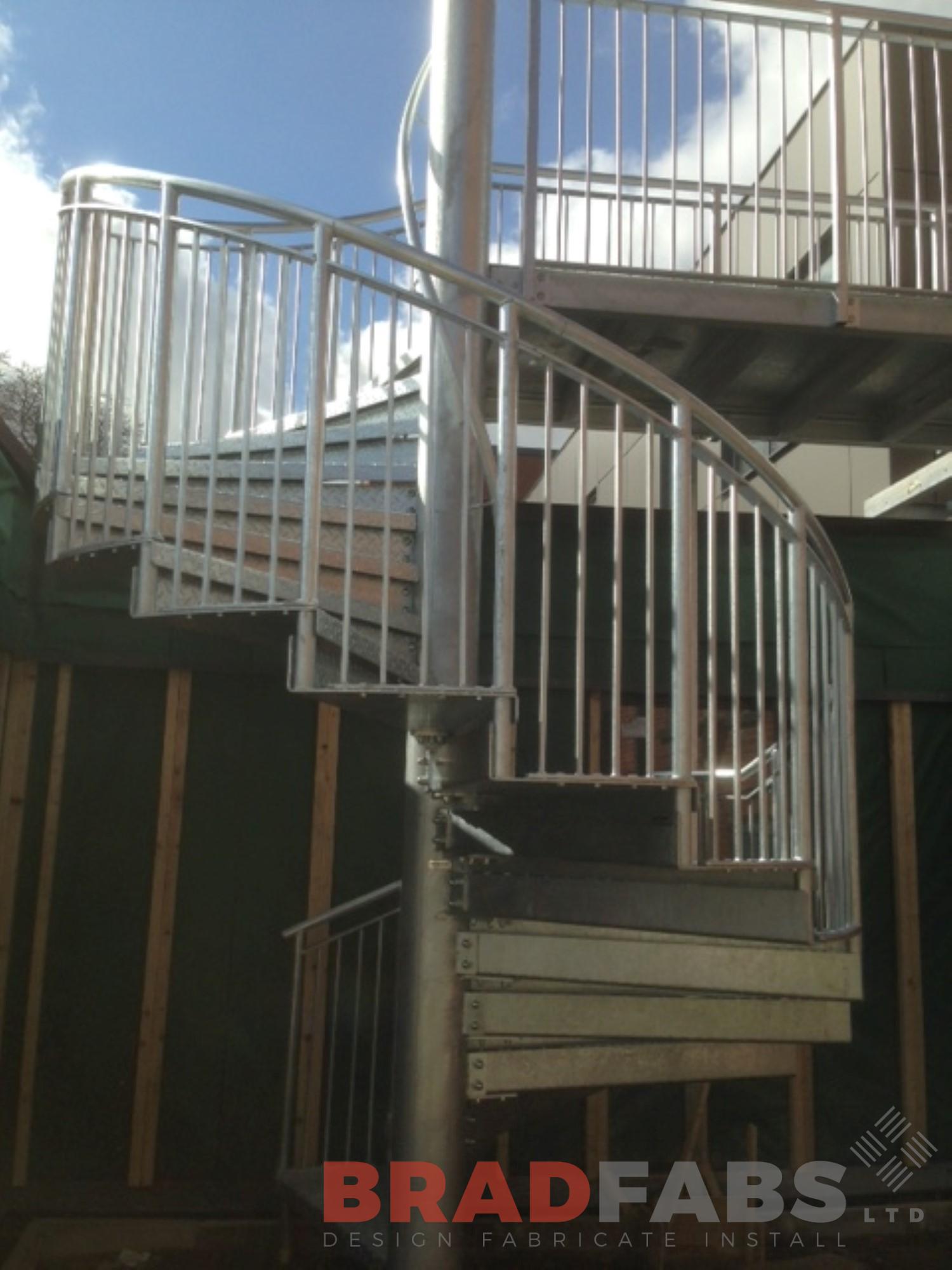 Bradfabs designed, manufactured and installed another spiral for Notre Damn in Leeds. This time they opted for a different design, in mild steel, galvanised spiral with vertical bar balustrade and a large landing.