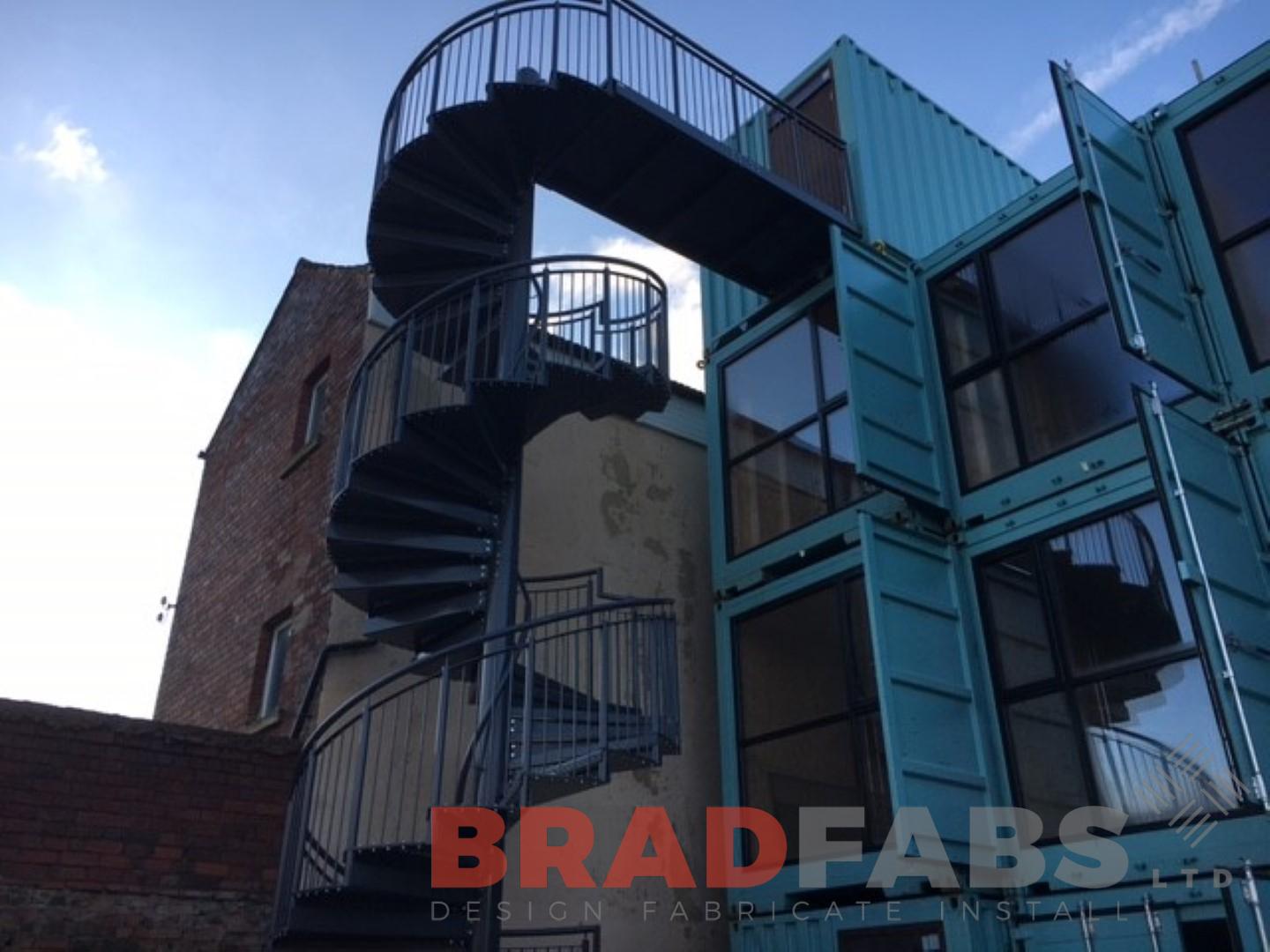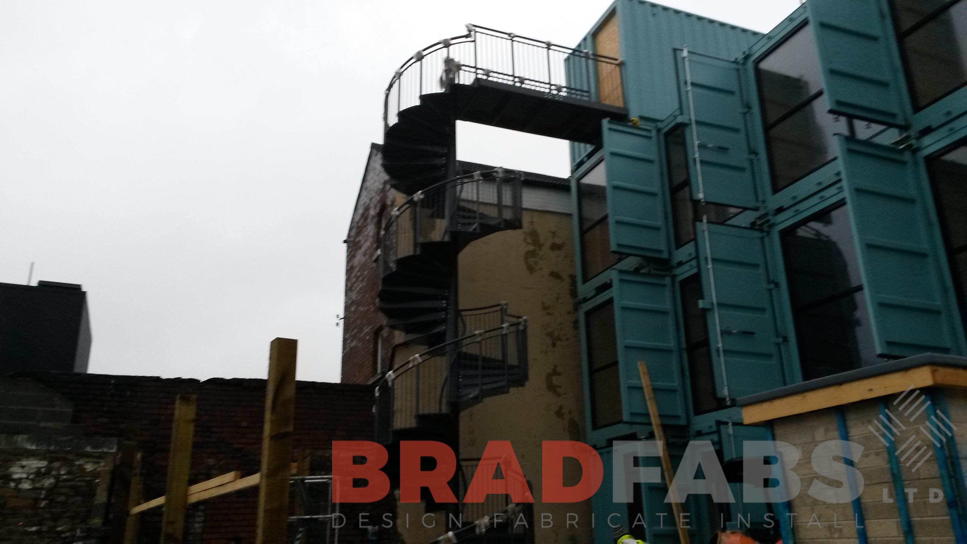 9m high mild steel, galvanised spiral staircase with 2000mm square landing with top and midrail balustrade to spiral and landing.