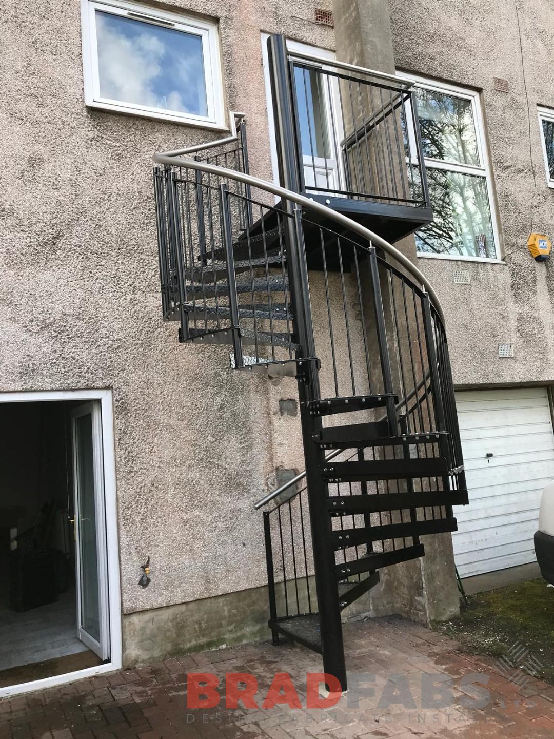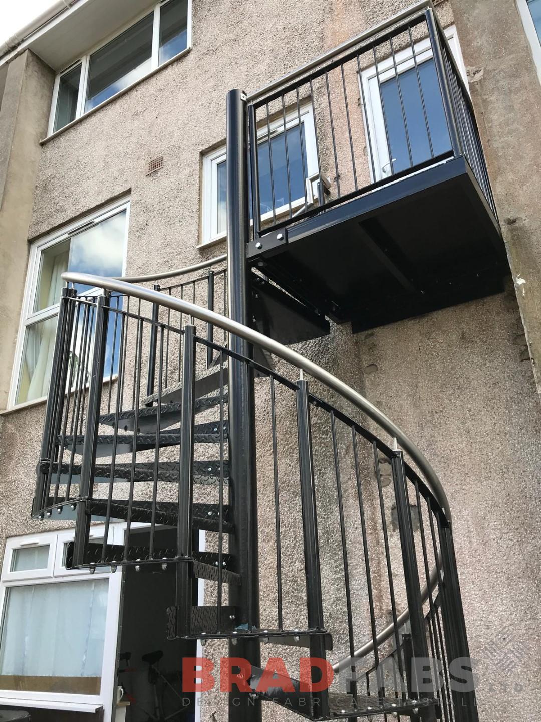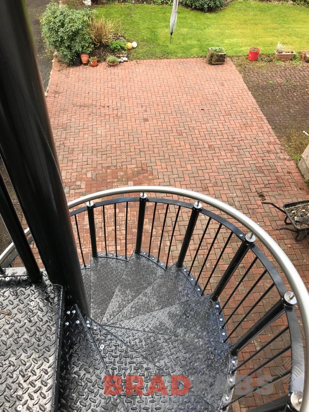 Bradfabs were appointed to design, manufacture and install an access spiral staircase. This one was designed in mild steel, galvanised and powder coated black with chequer plate treads, vertical bar balustrade and a small platform.