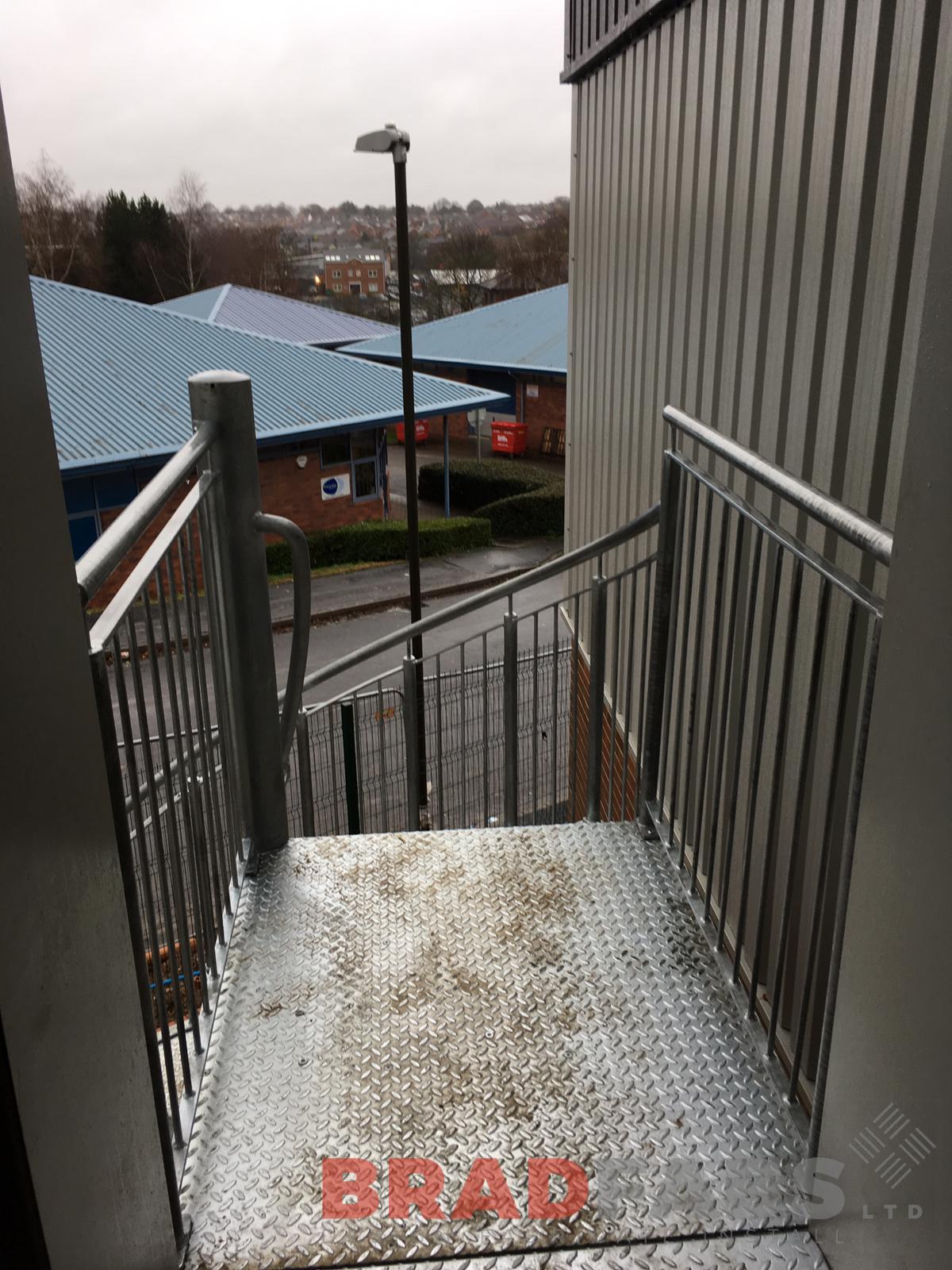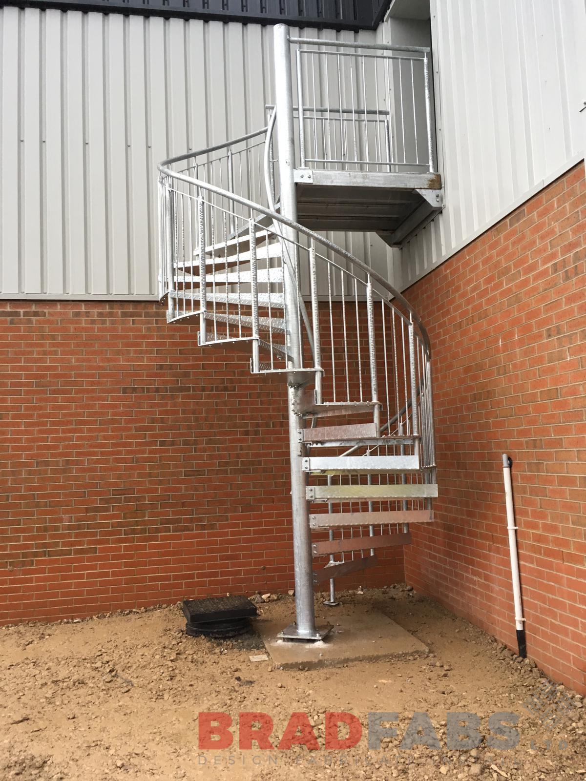 Bespoke spiral fire escape, manufactured in mild steel and galvanised, with vertical bar balustrade and tubular top rail, complete with durbar treads