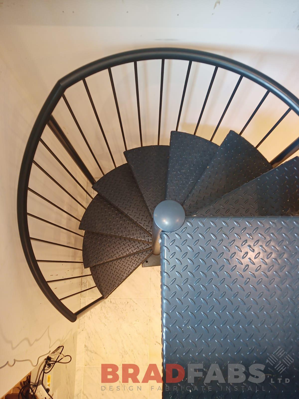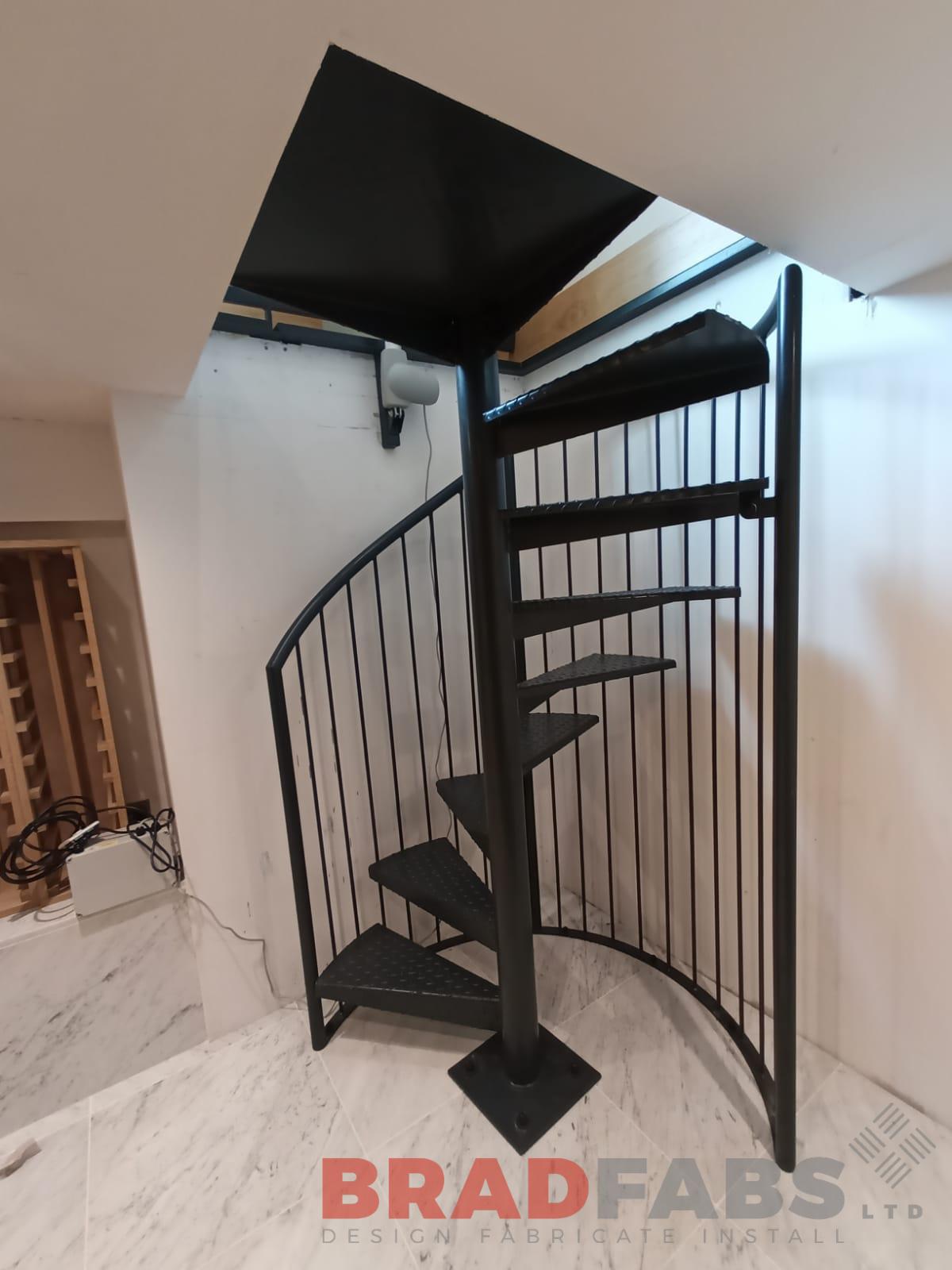 Bespoke internal spiral staircase, leading down from a cellar hatch, all designed, manufactured and installed by Bradfabs. Spiral staircase manufactured in mild steel and powder coated, with vertical bar balustrade and complete with durbar treads.