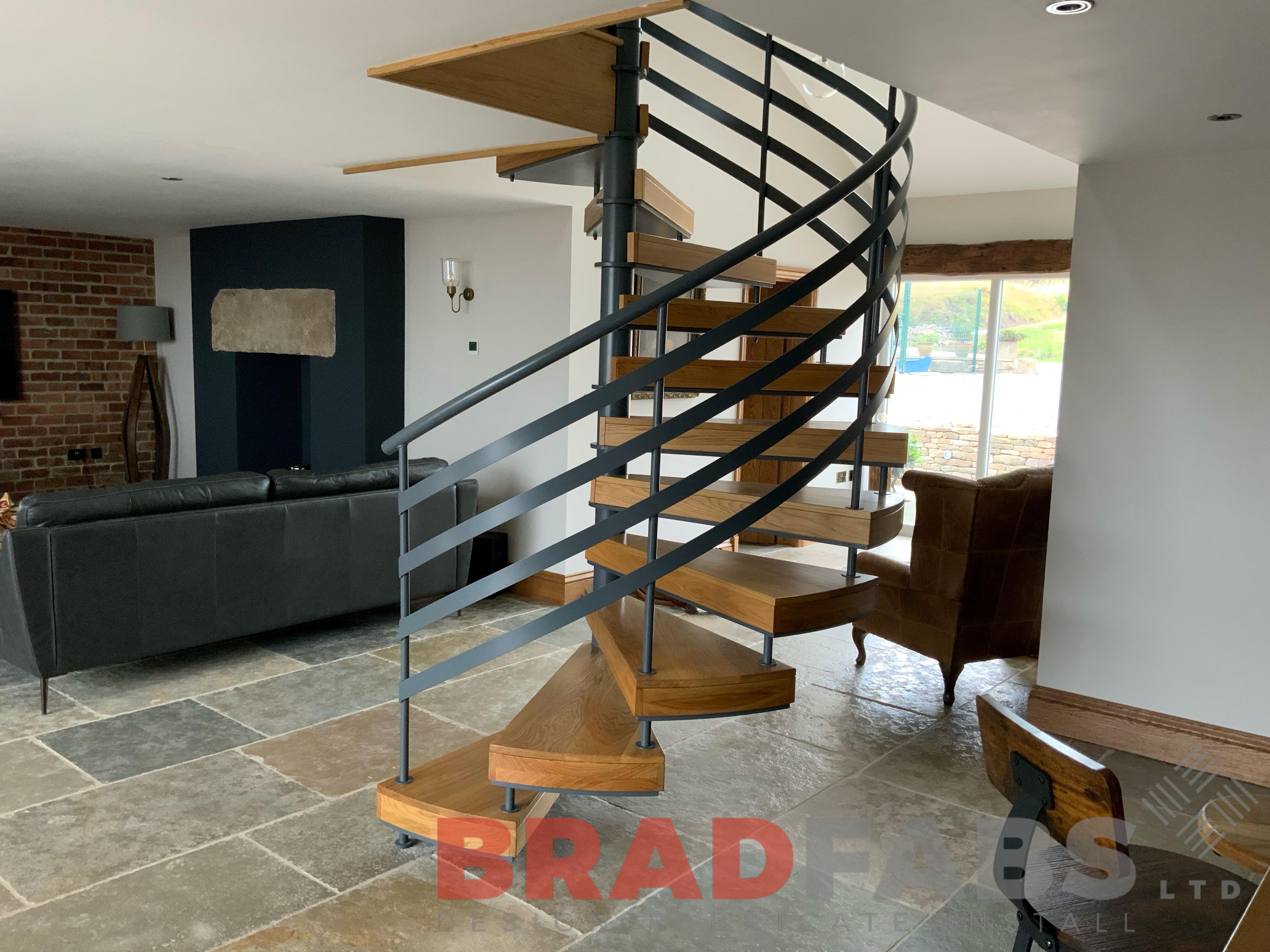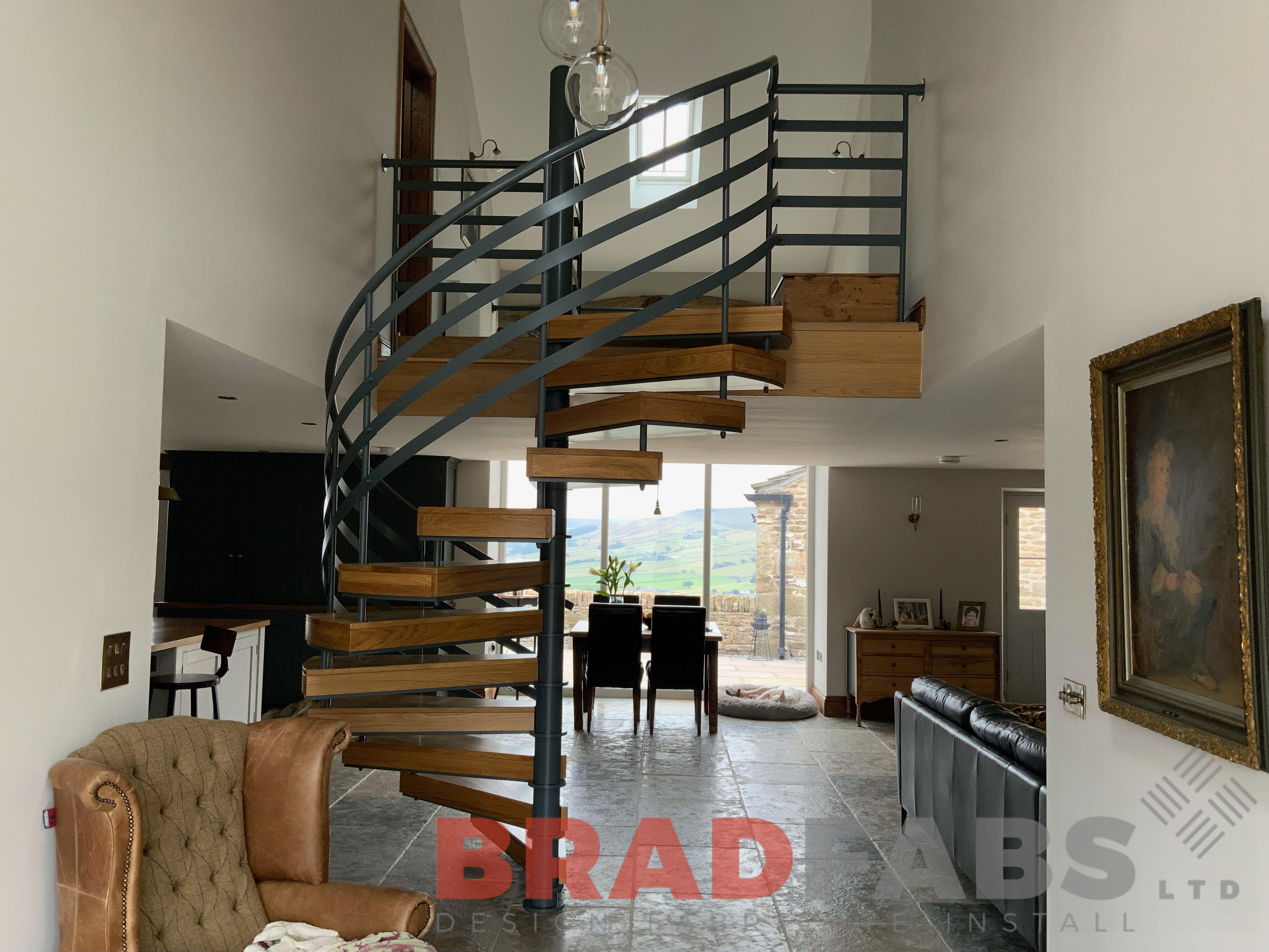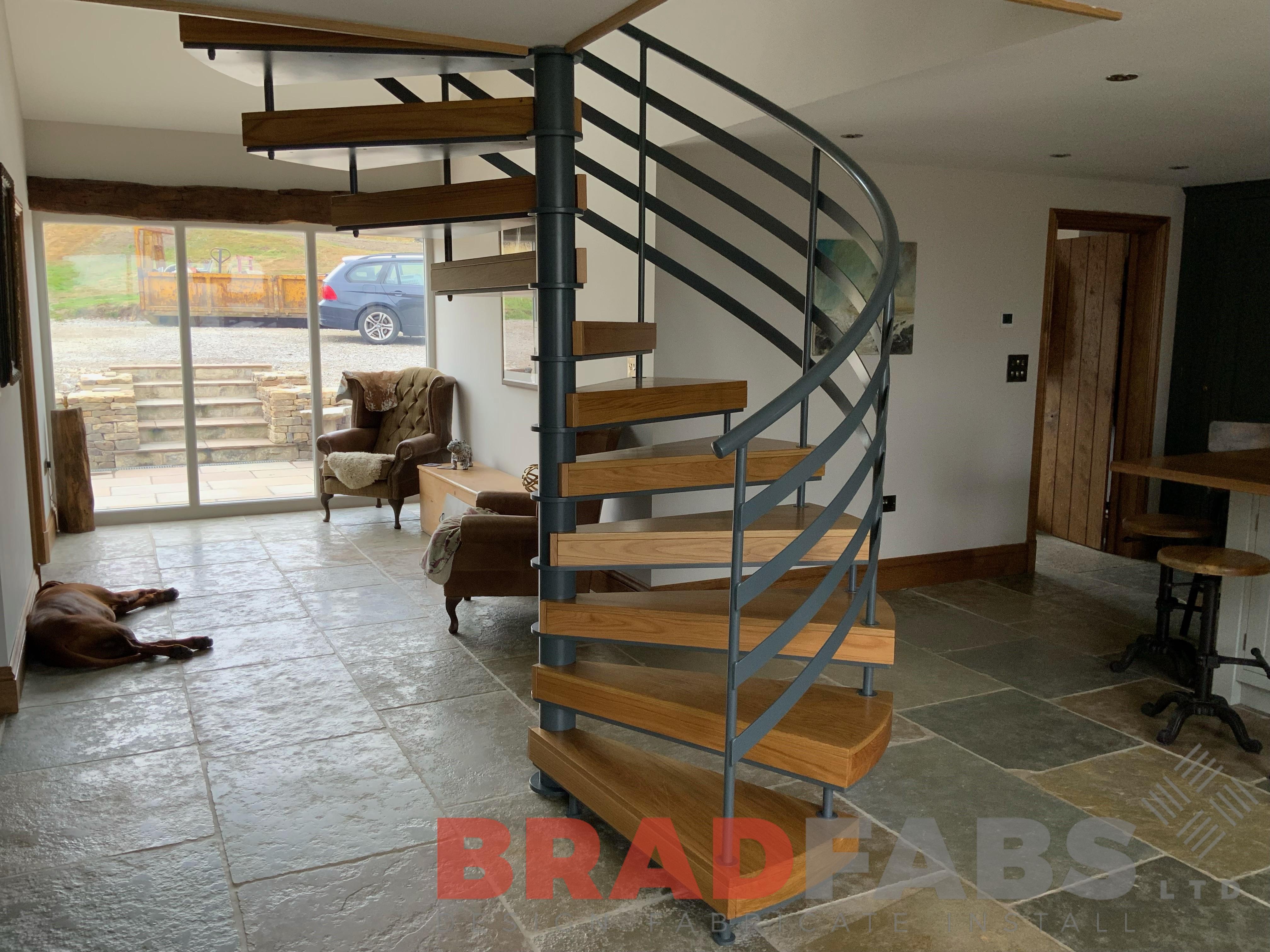 Internal spiral staircase rising 2.6m, with flat horizontal bar balustrade and complete with oak timber treads!