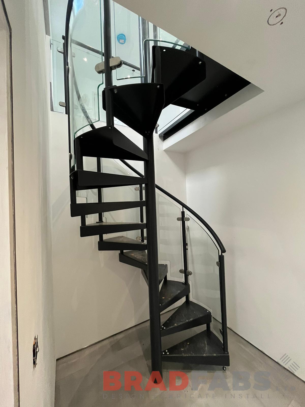 Internal spiral staircase with glass panel balustrade
