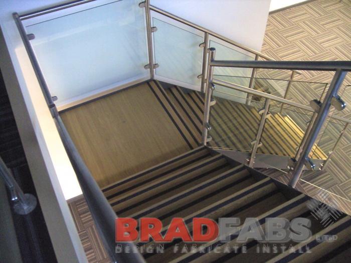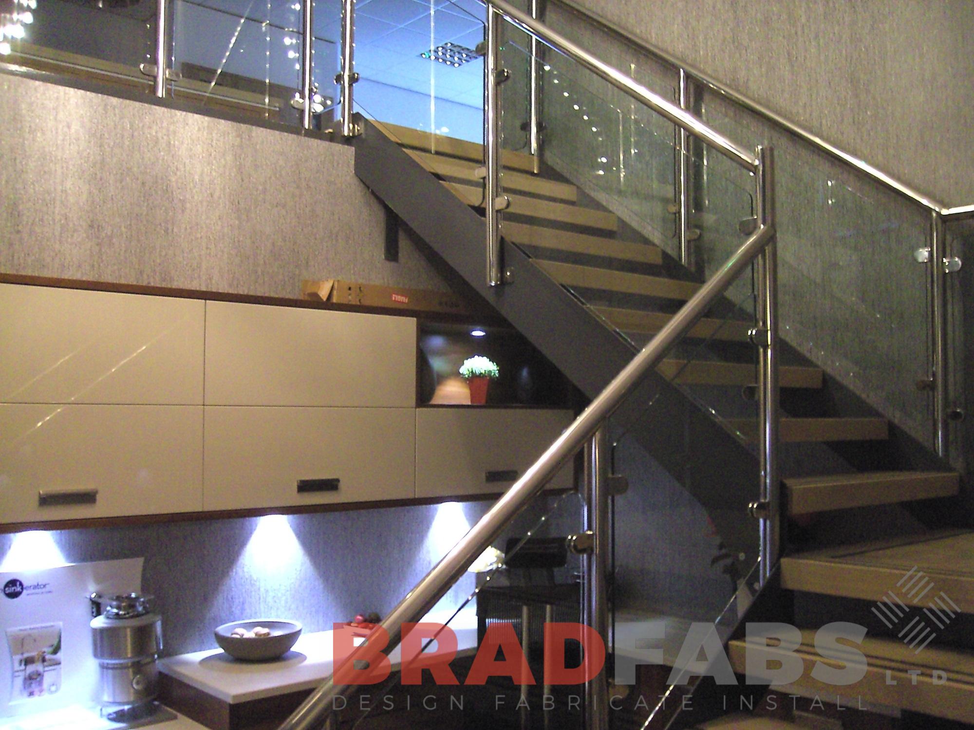 This straight staircase is designed and fabricated with powder coated grey mild steel staircase stringers, polished stainless steel handrails and toughened glass infill panels and is installed at showrooms in Leeds, West Yorkshire.