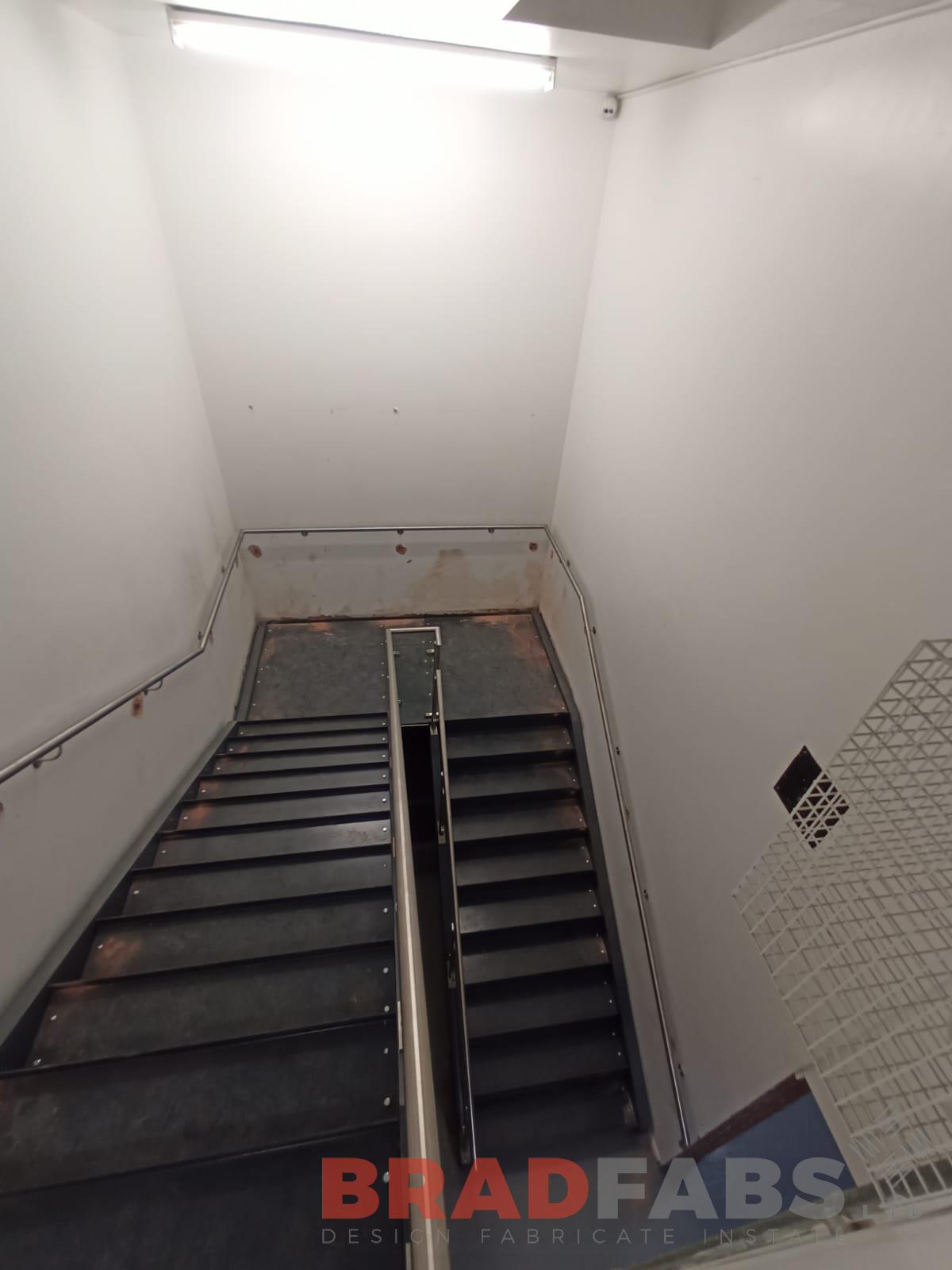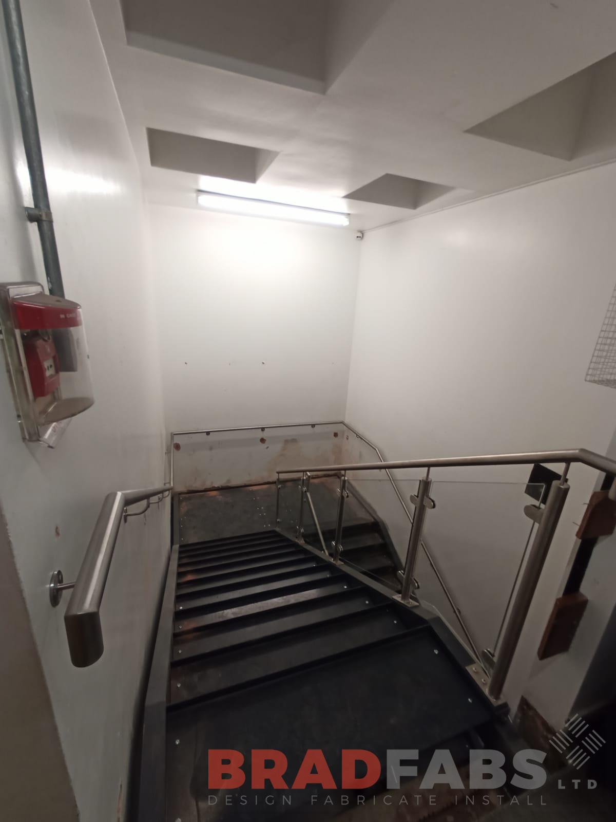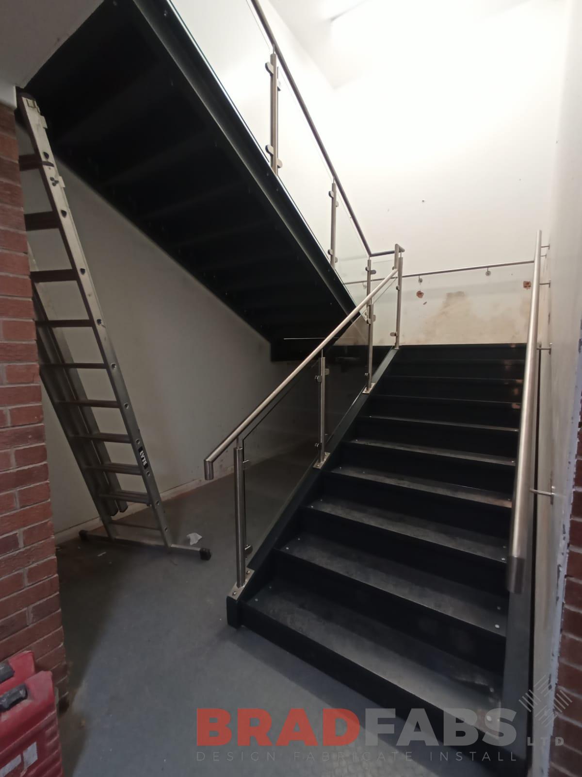 Internal two flight staircase with powder coated stringers and stainless steel and glass infill balustrade, complete with pan folded treads