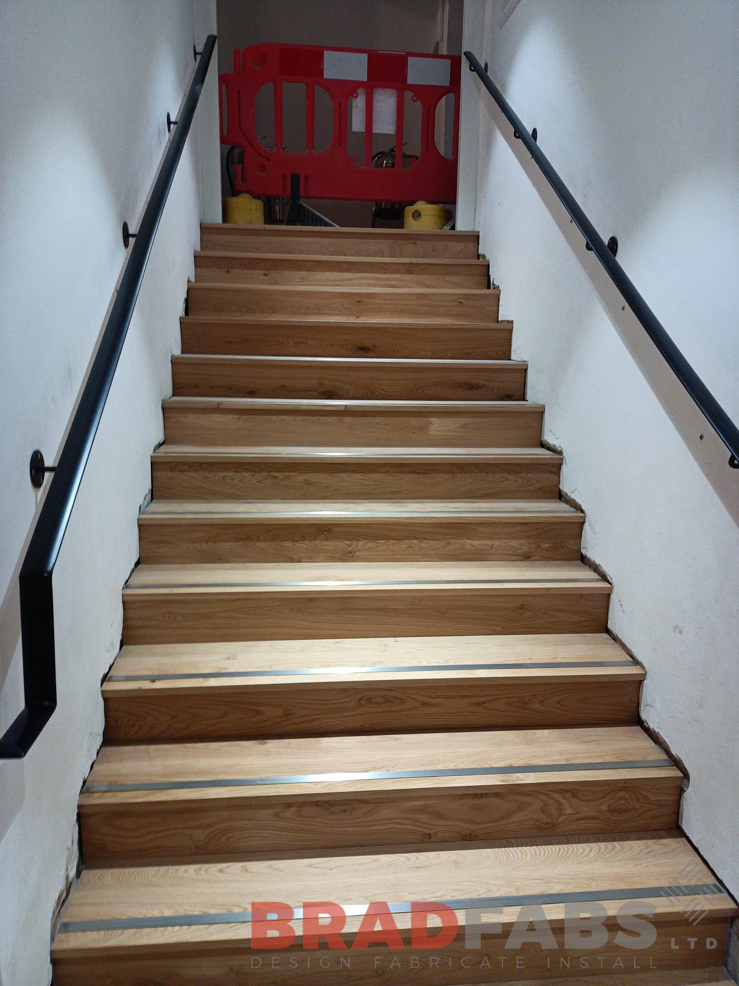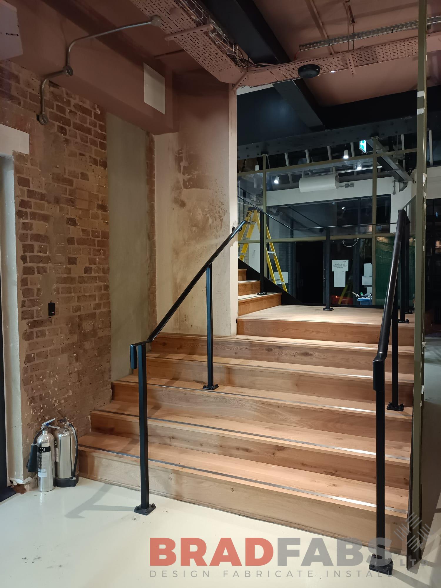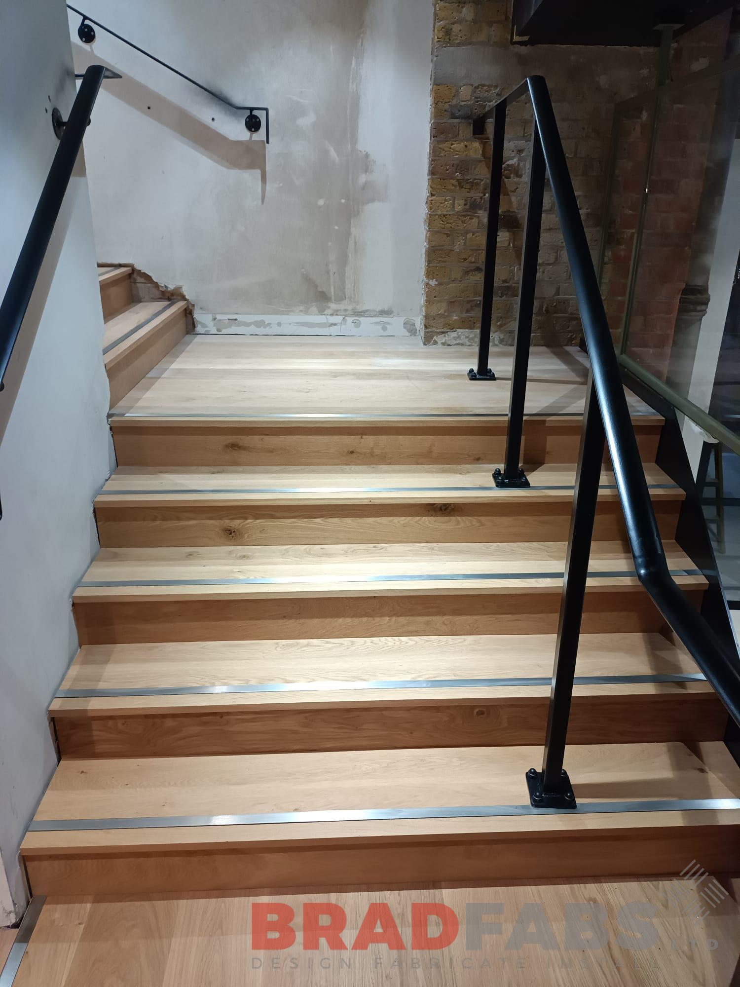 Large internal straight staircase with powder coated balustrade and timber treads with brass inlay strips