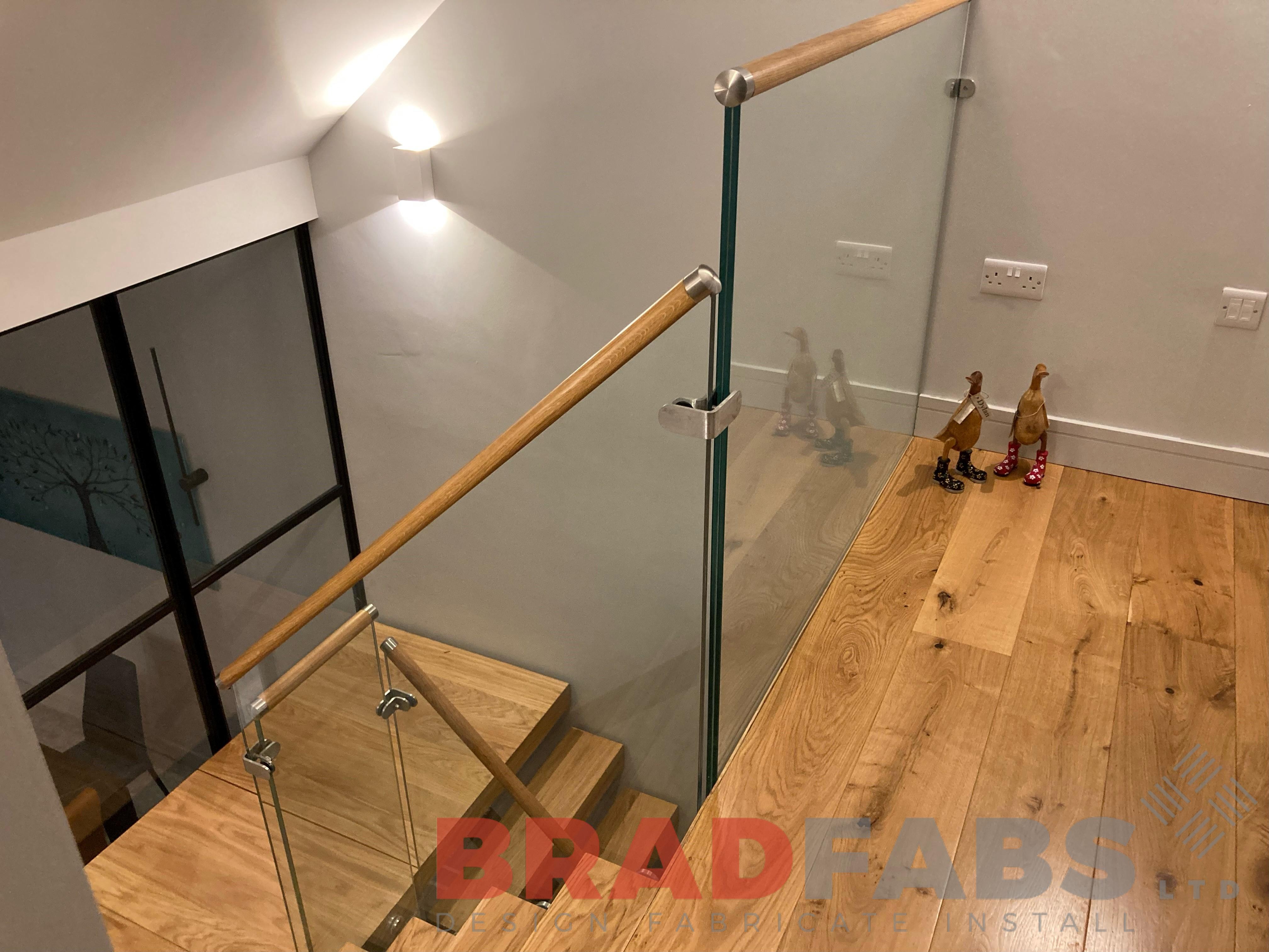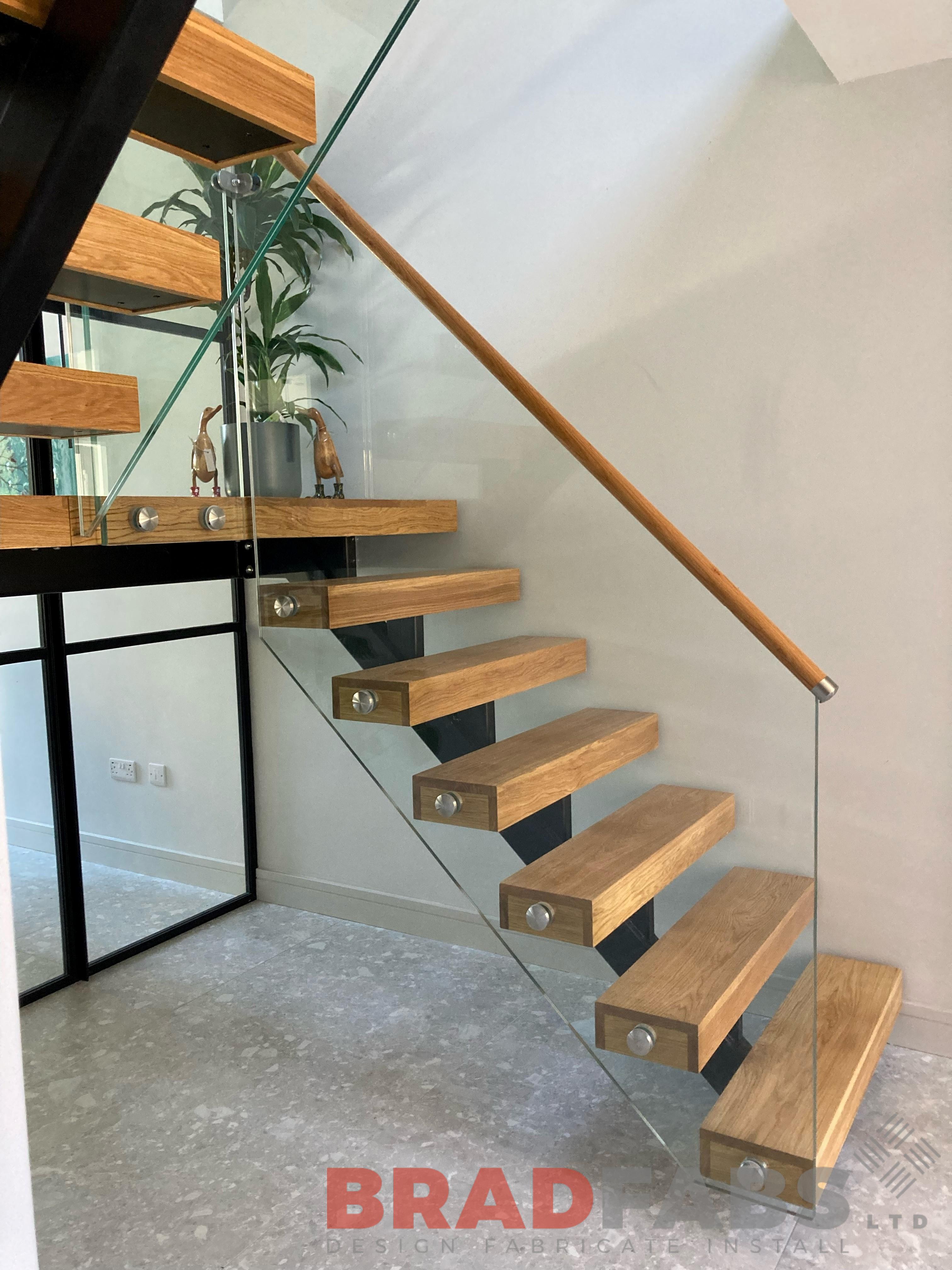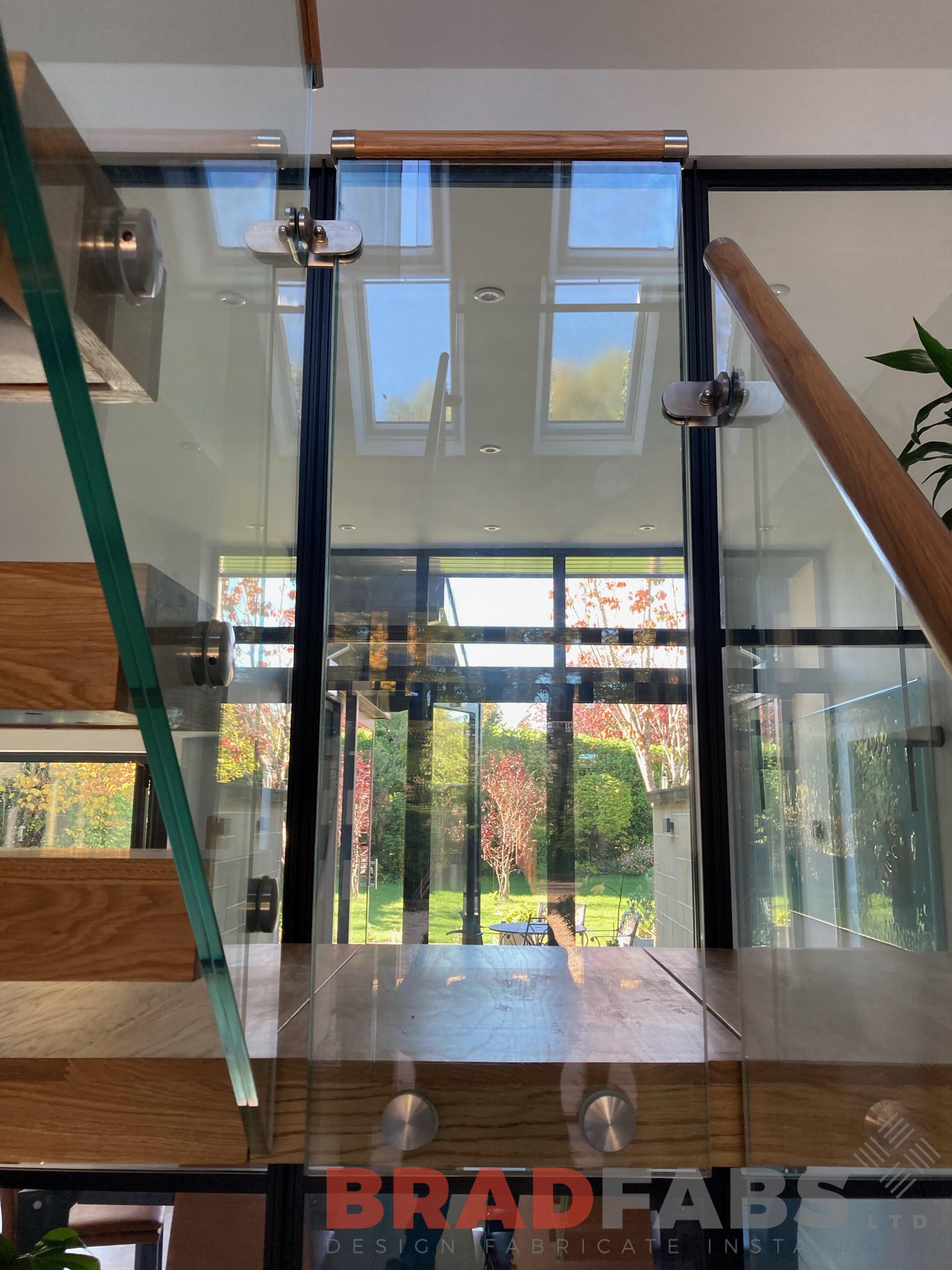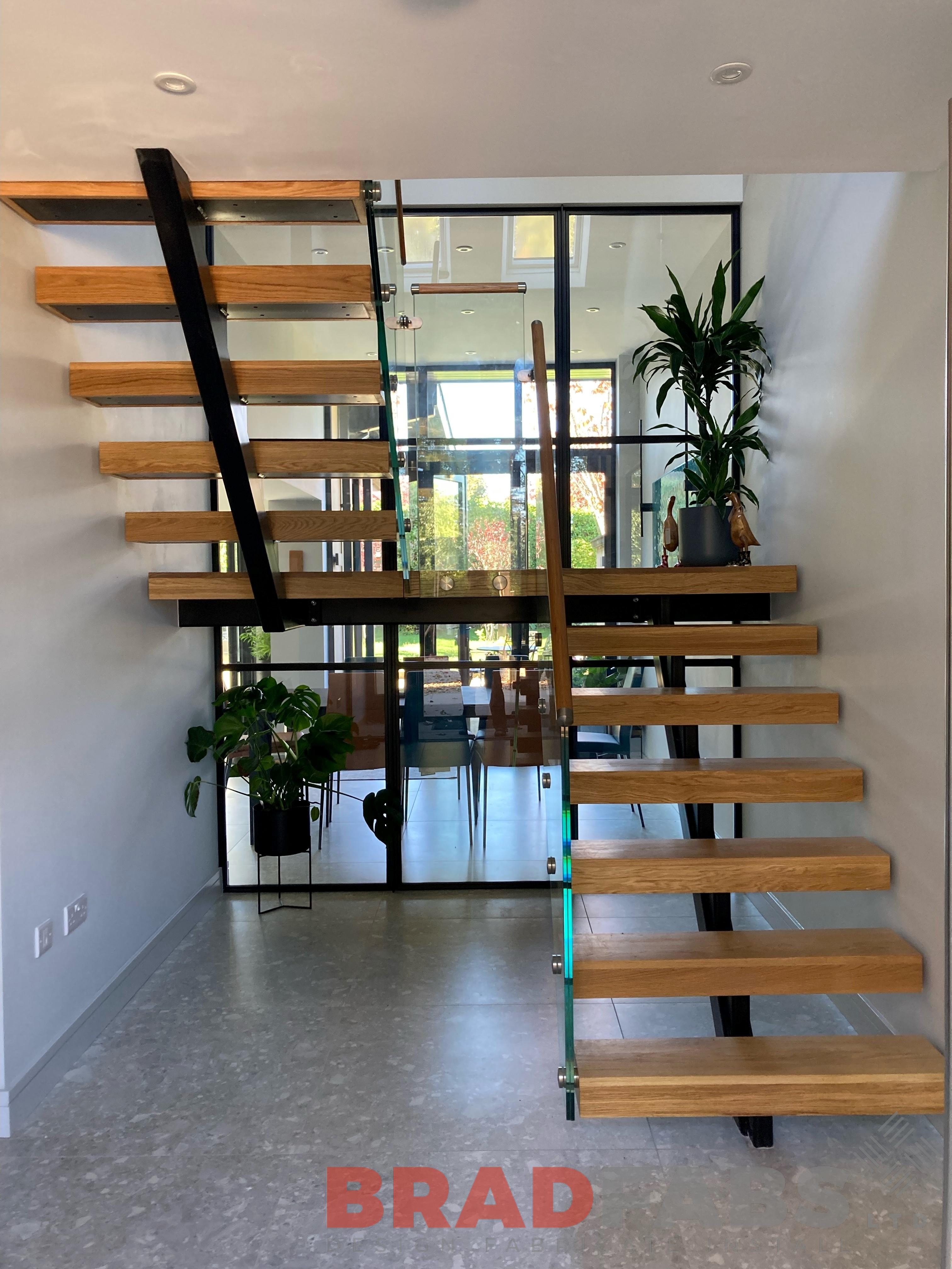 Single spine staircase with oak treads and infinity glass balustrade, complete with oak handrail to balustrade.