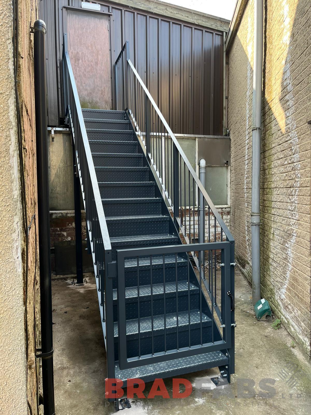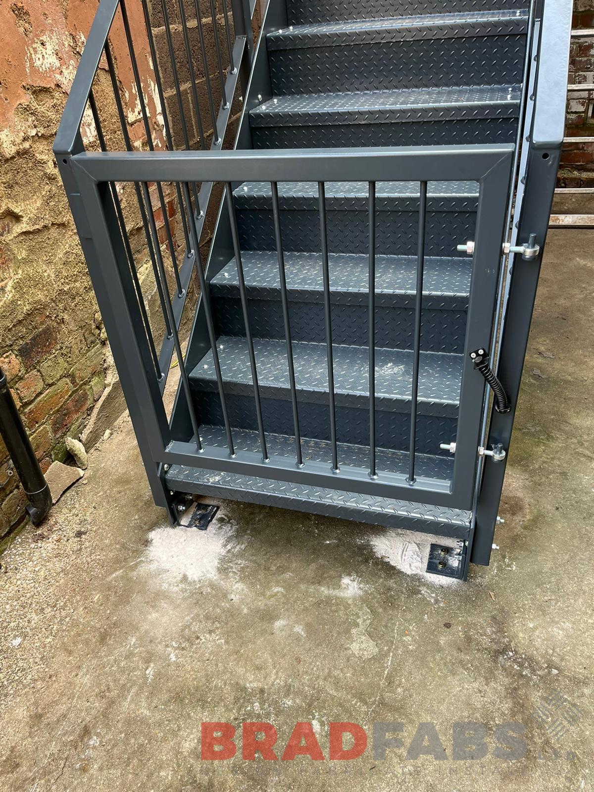 External straight staircase with gate. Manufactured in mild steel, galvanised and powder coated with vertical bar balustrade and flat balustrade top rail, complete with durbar treads
