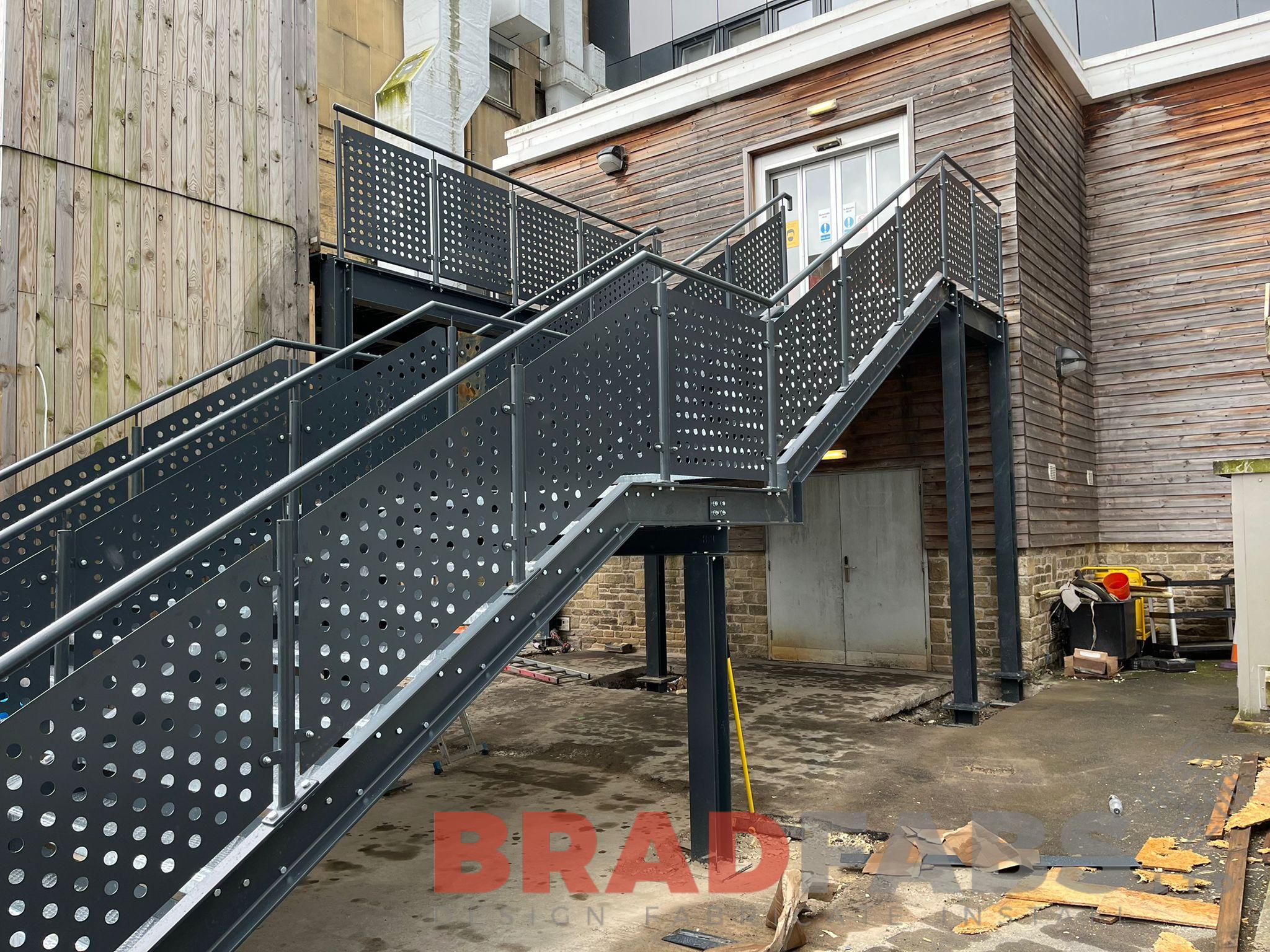 Large external staircase for a University, manufactured in mild steel, galvanised and powder coated with laser cut perforated panels and complete with BNOP5 flooring