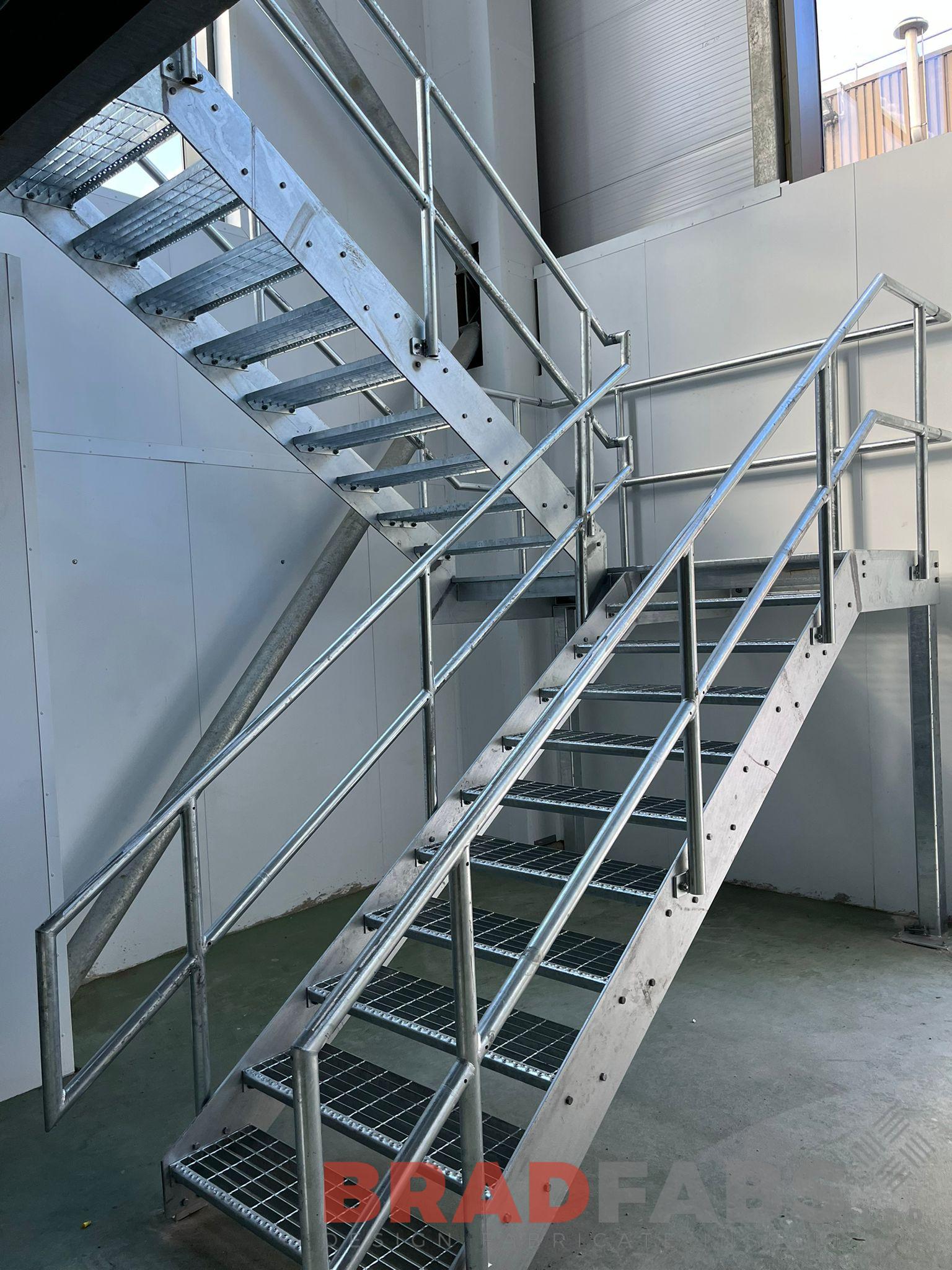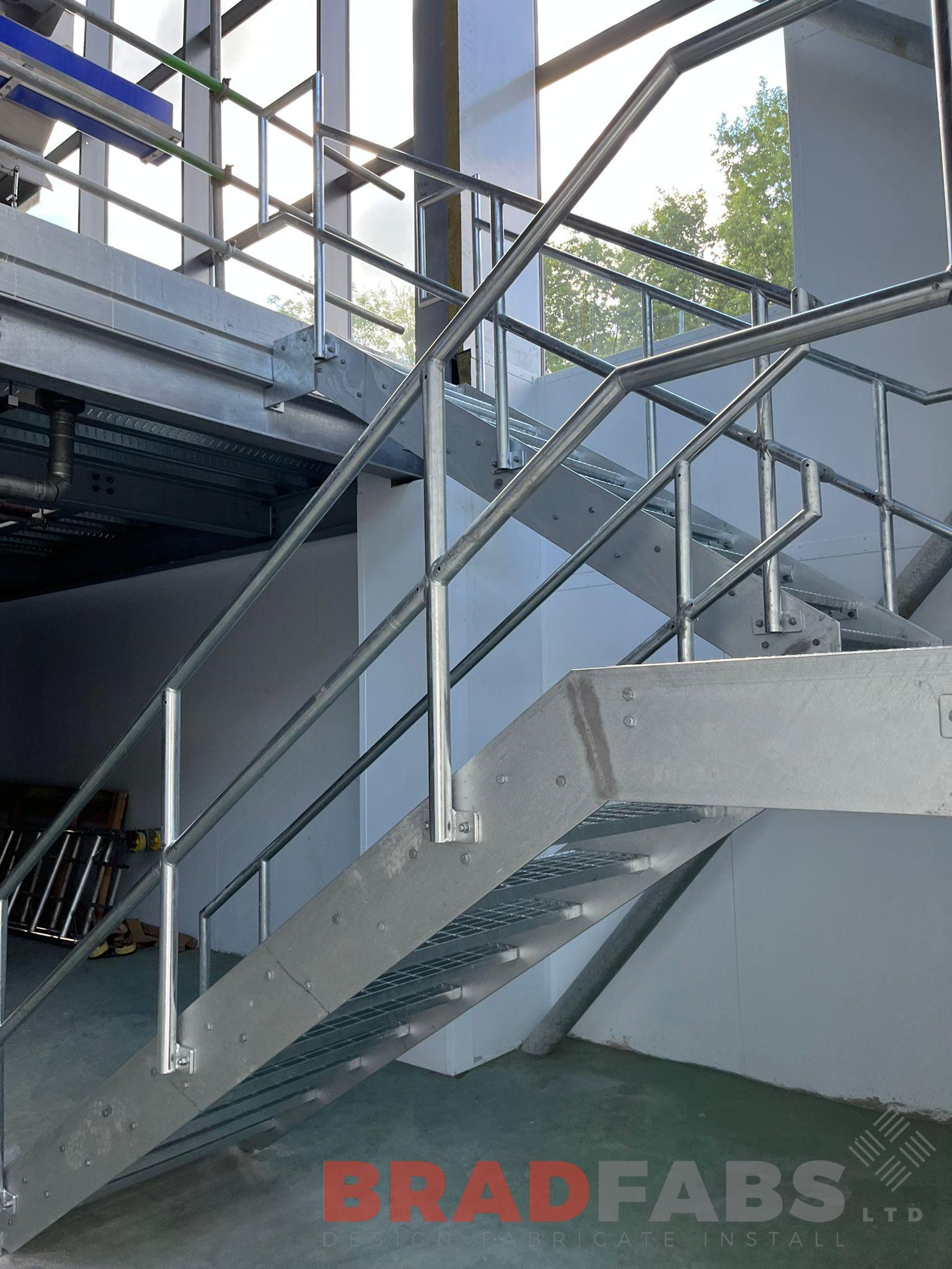 Internal two flight staircase for a commercial property, with top and mid rail balustrade and complete with open mesh treads