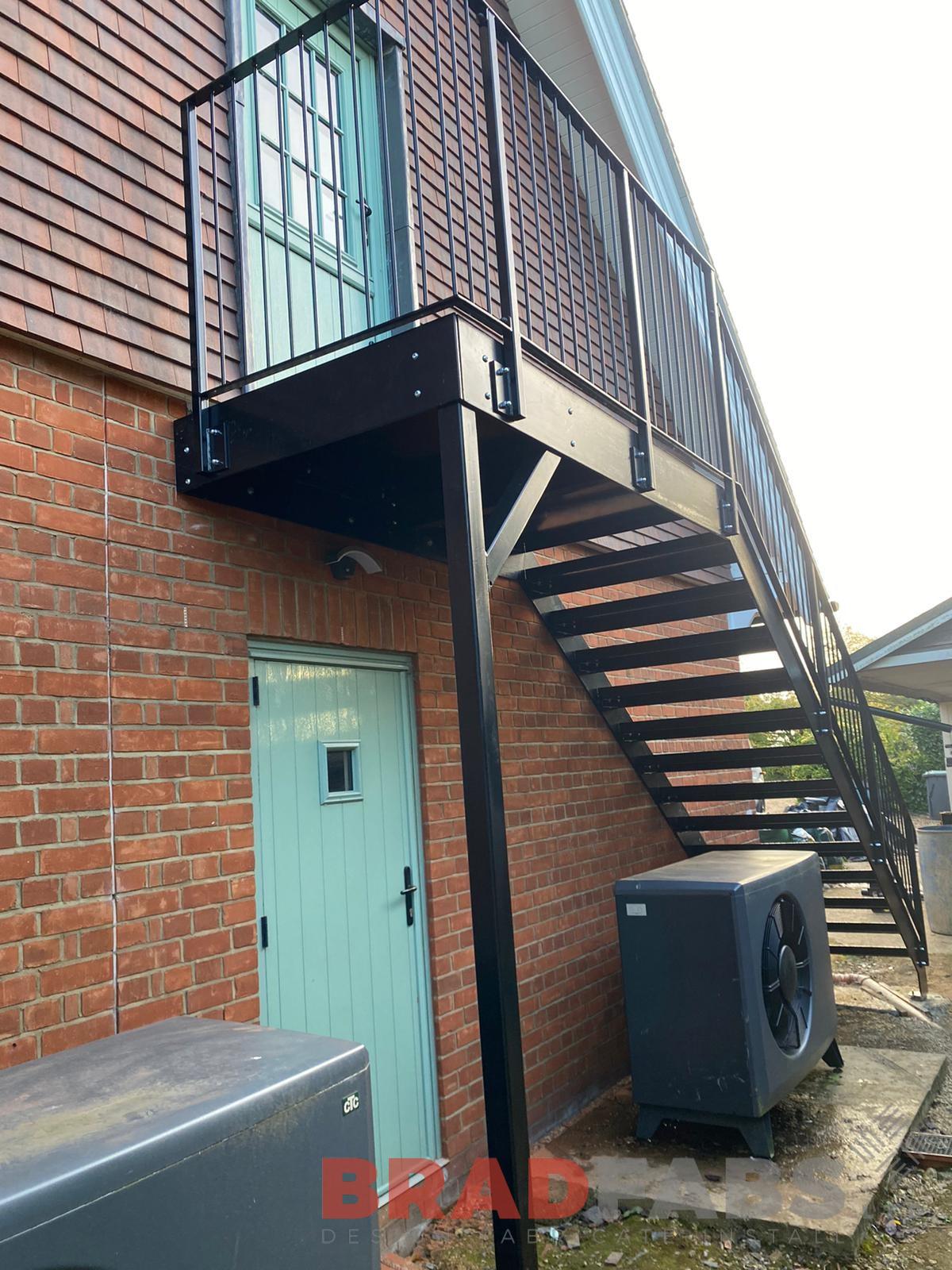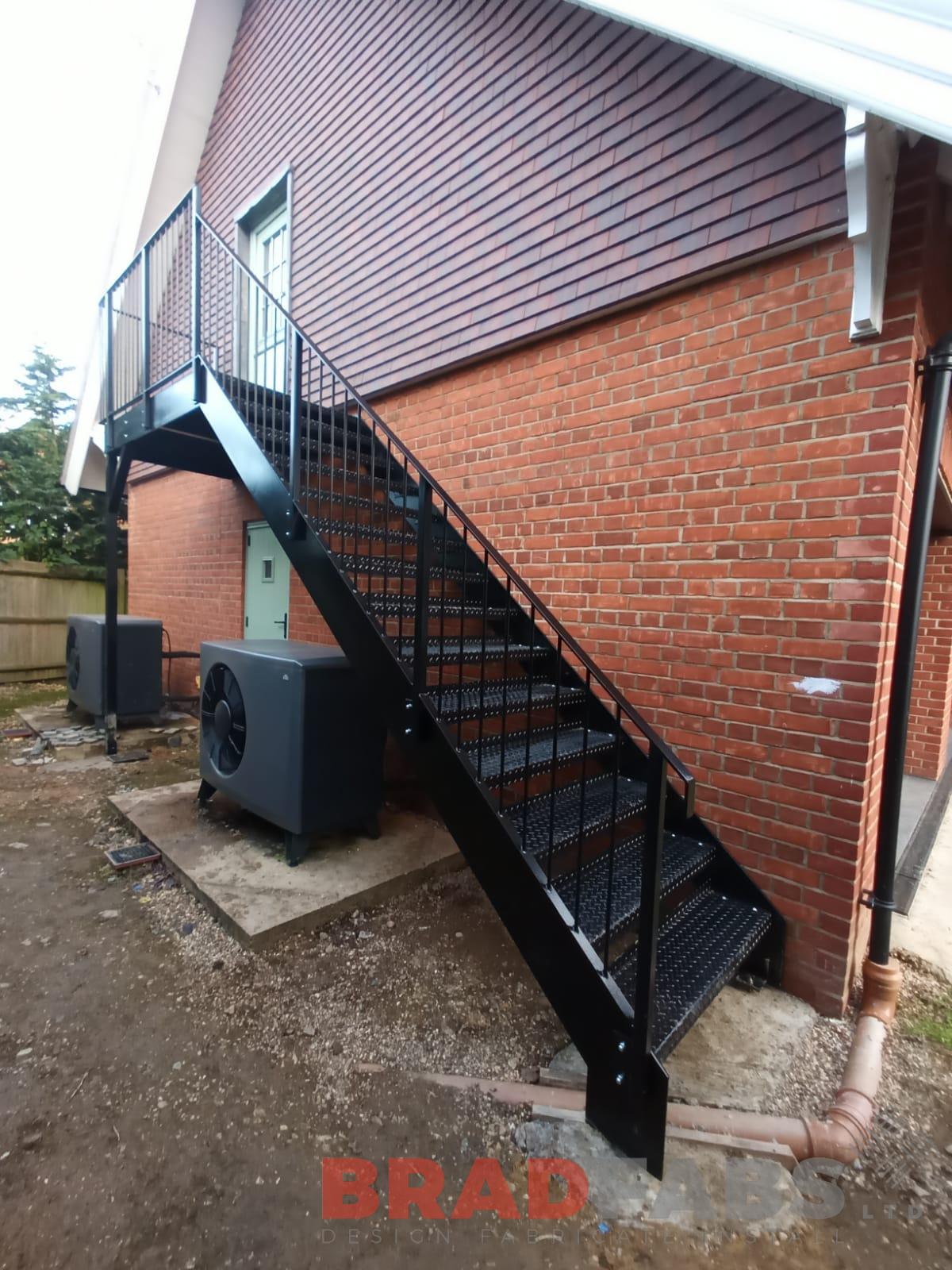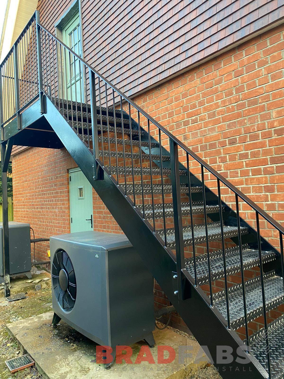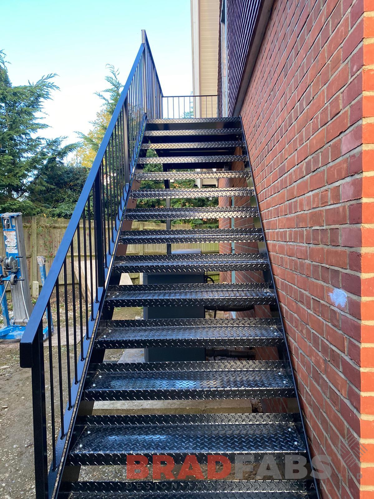 External black staircase, manufactured in mild steel, galvanised and powder coated with vertical bar balustrade and tubular top rail complete with durbar treads