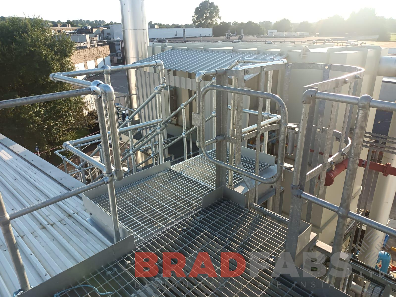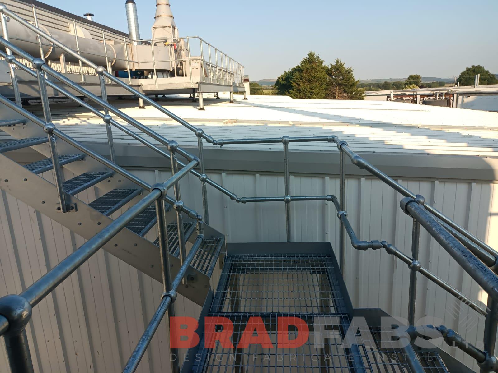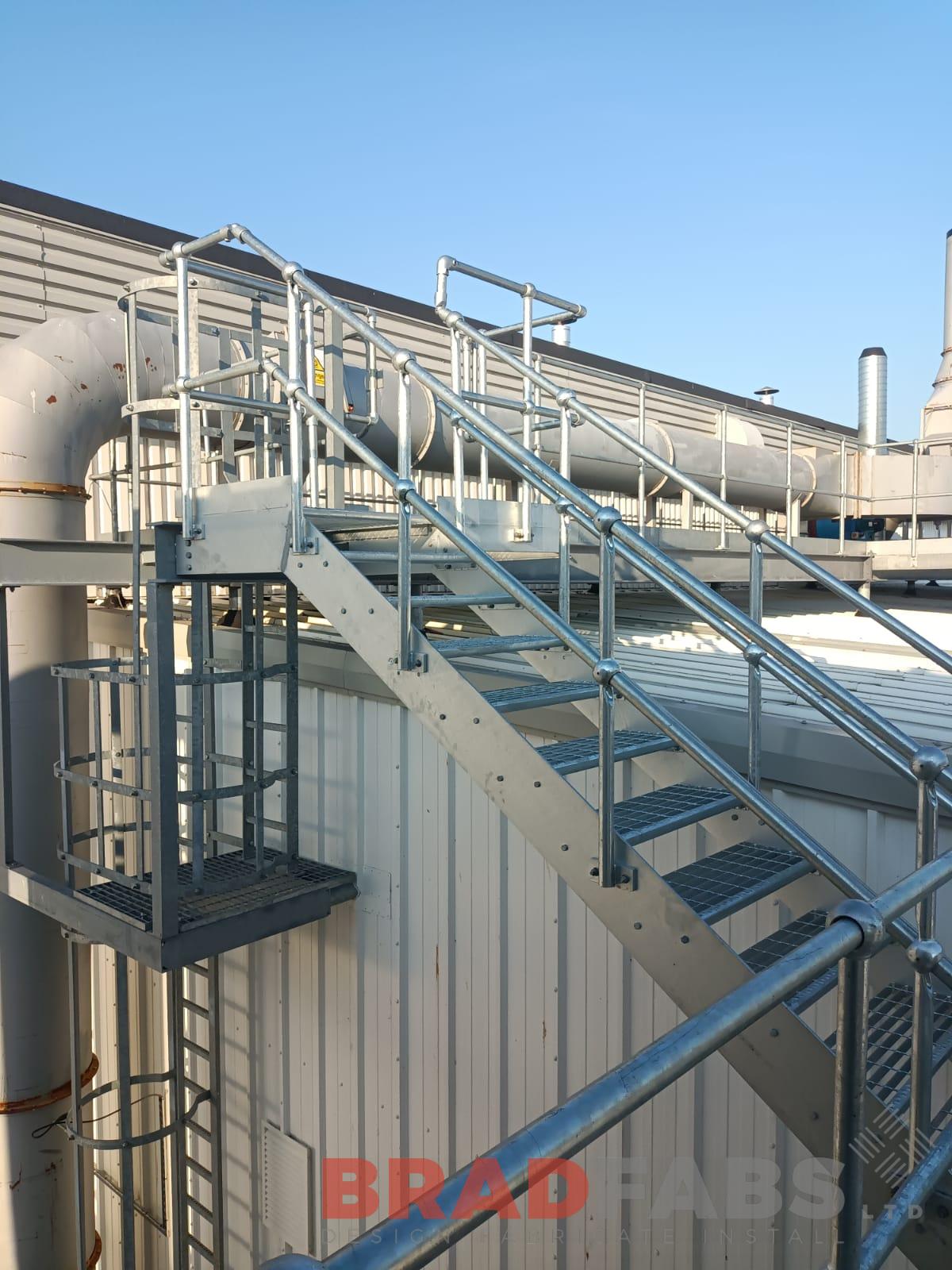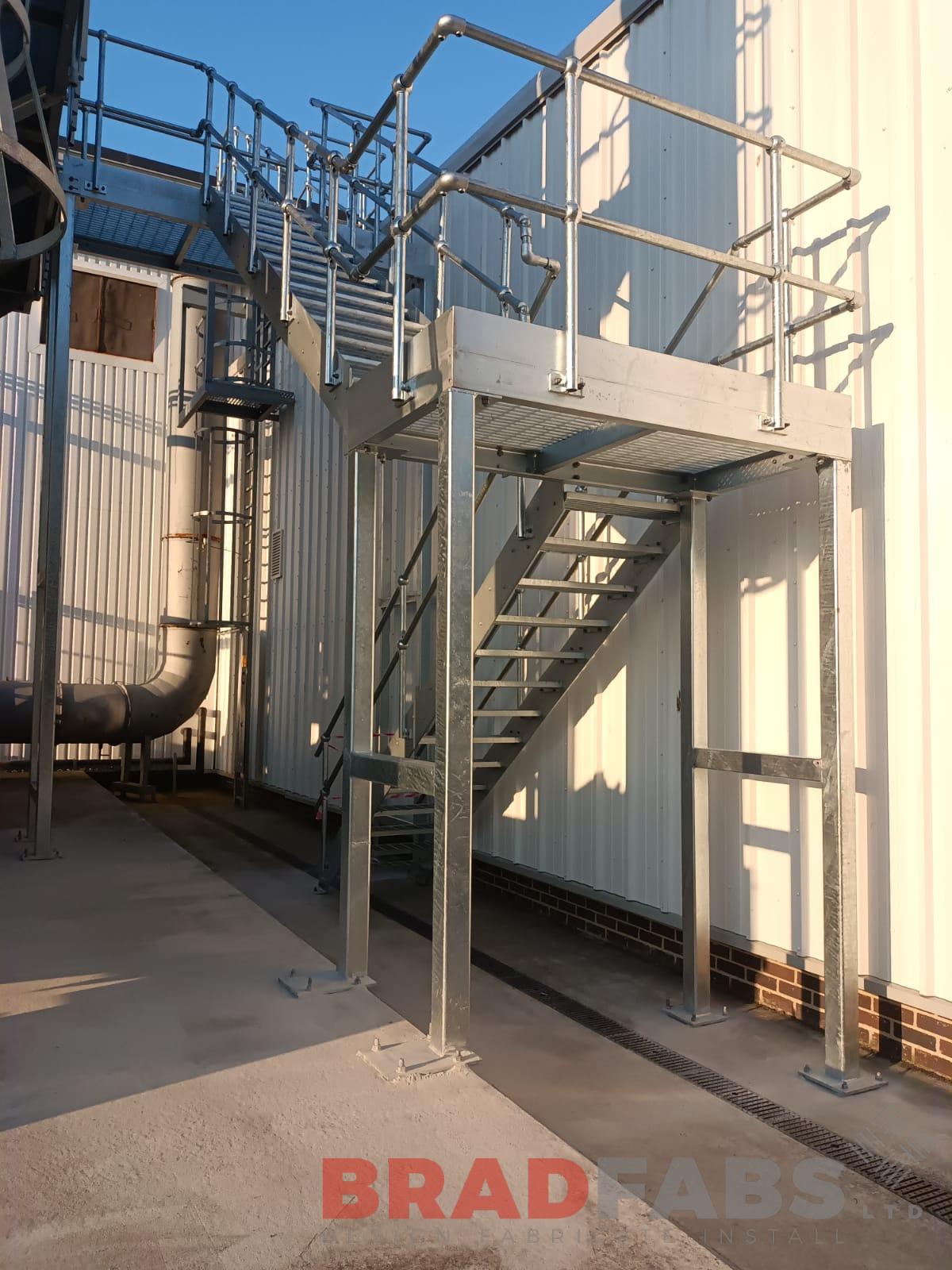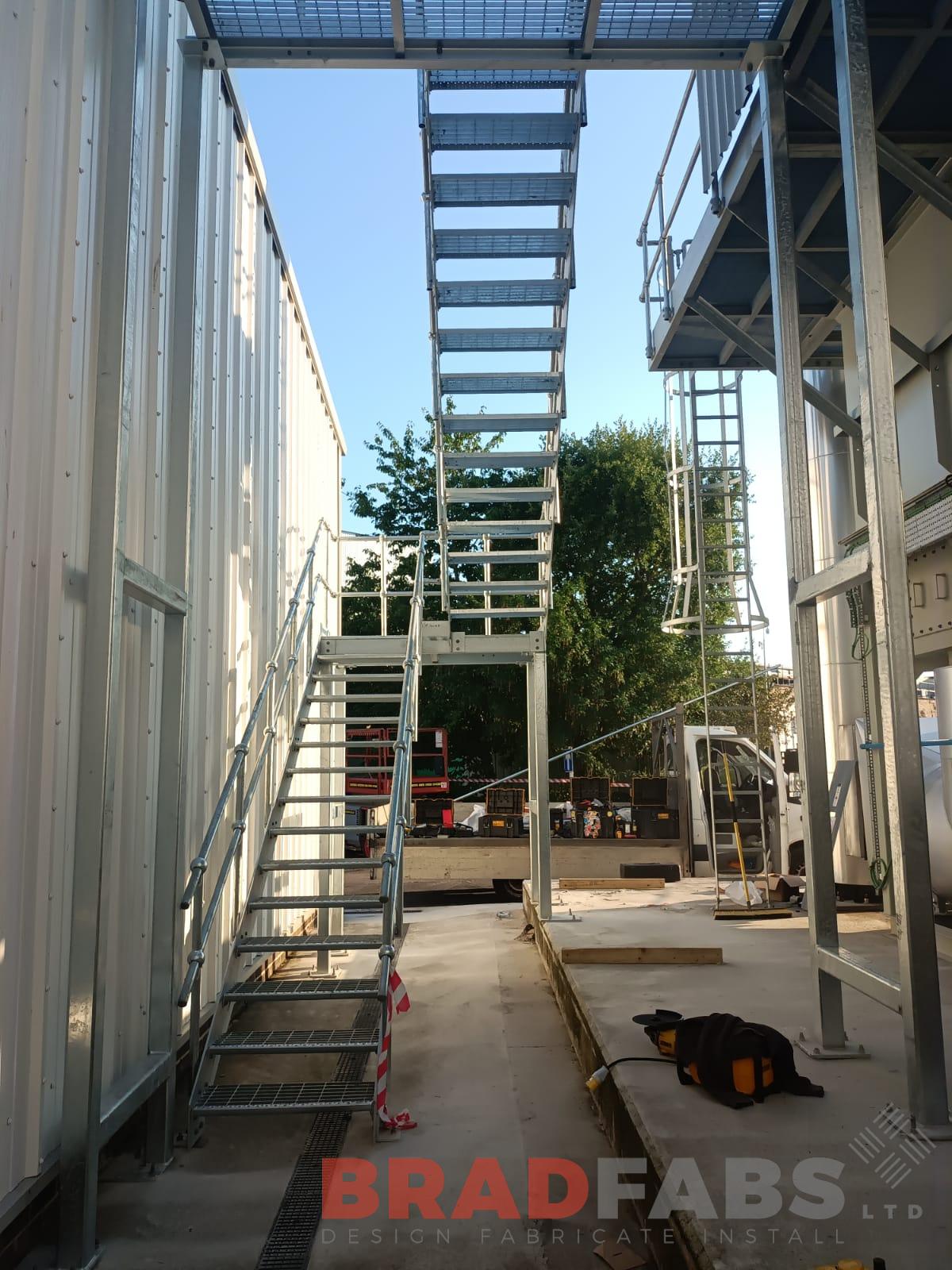 Large external staircase for an industrial building. With top and mid rail balustrade and complete with open mesh flooring