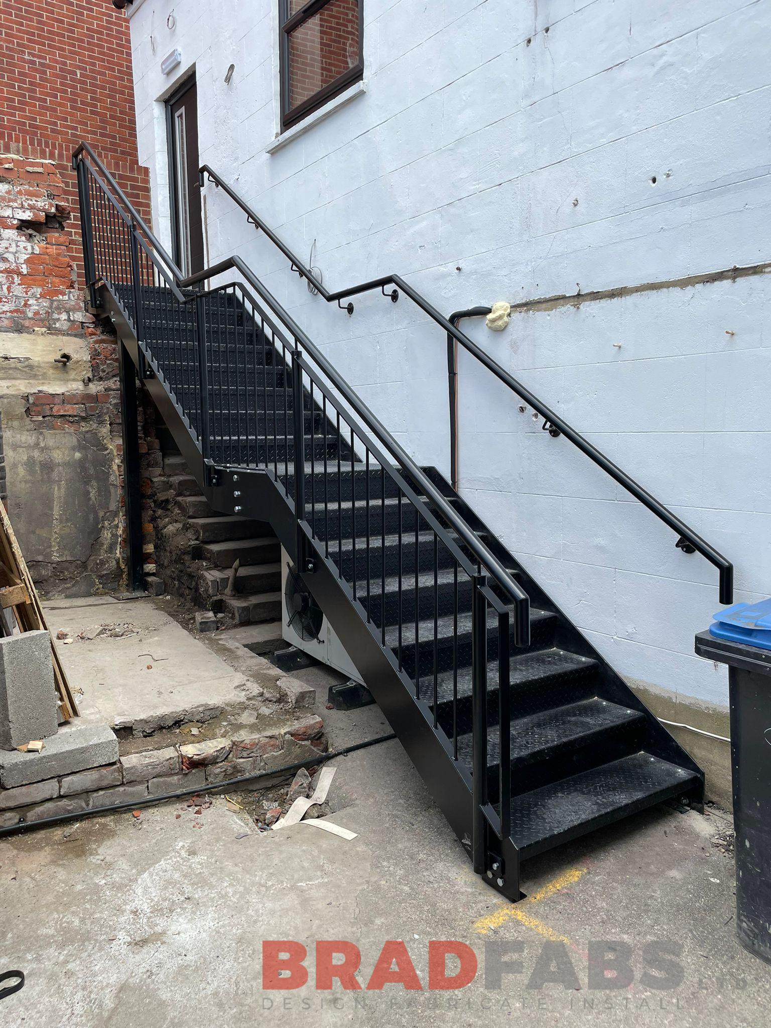 Straight staircase with flat bar stringers, vertical bar balustrade and tubular top rail, in mild steel and powder coated black at customers choice.