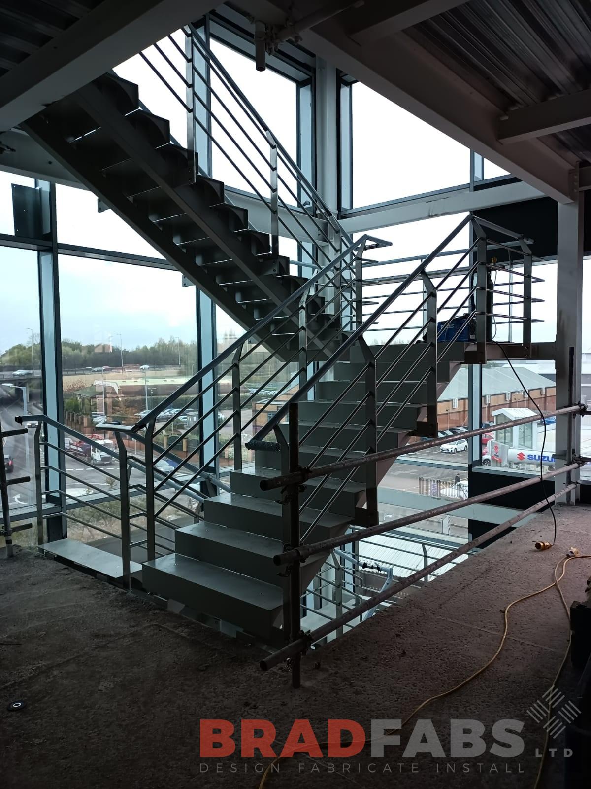 Three flight internal staircase with steel balustrade, with twin spine box section stringers
