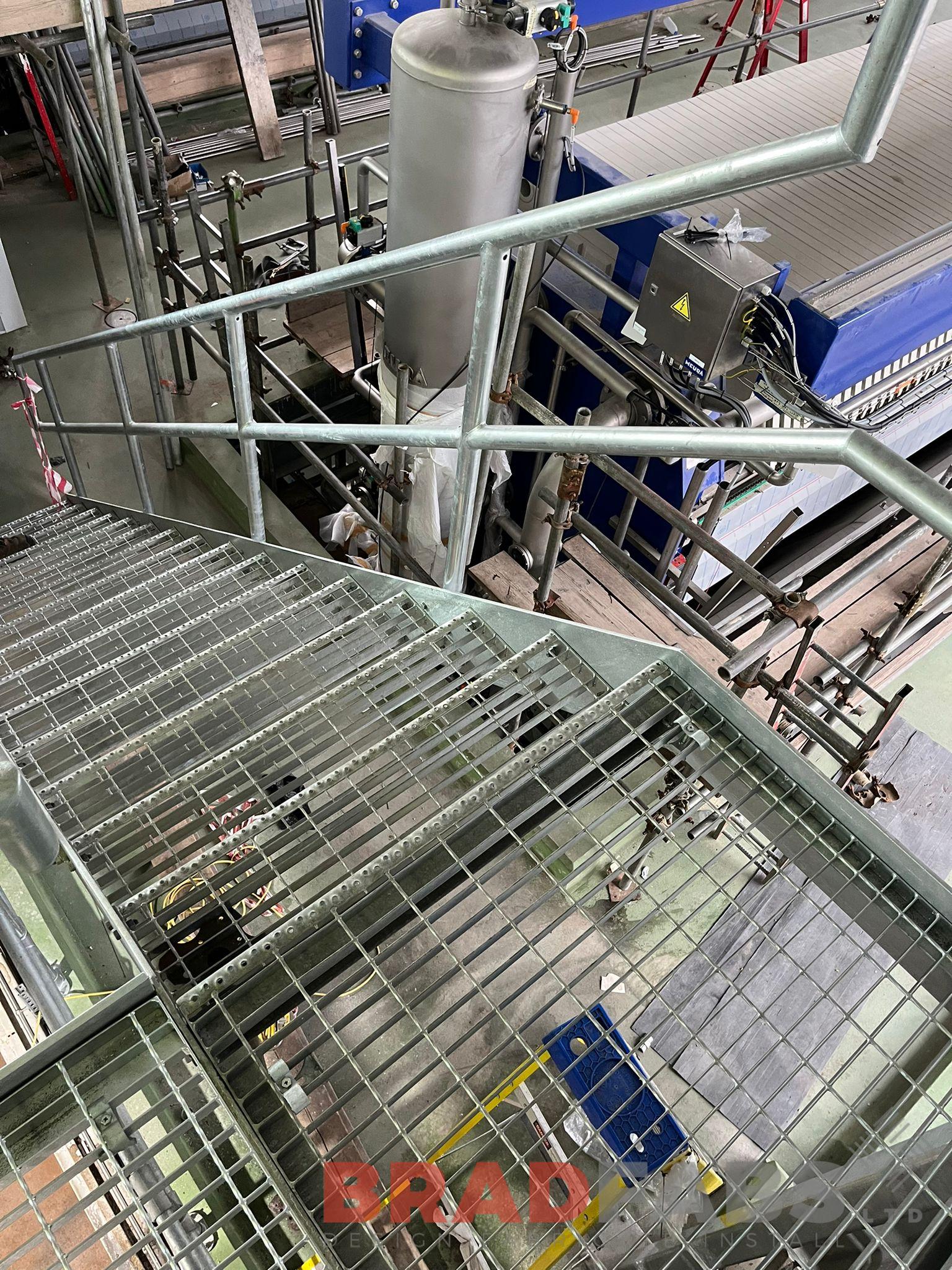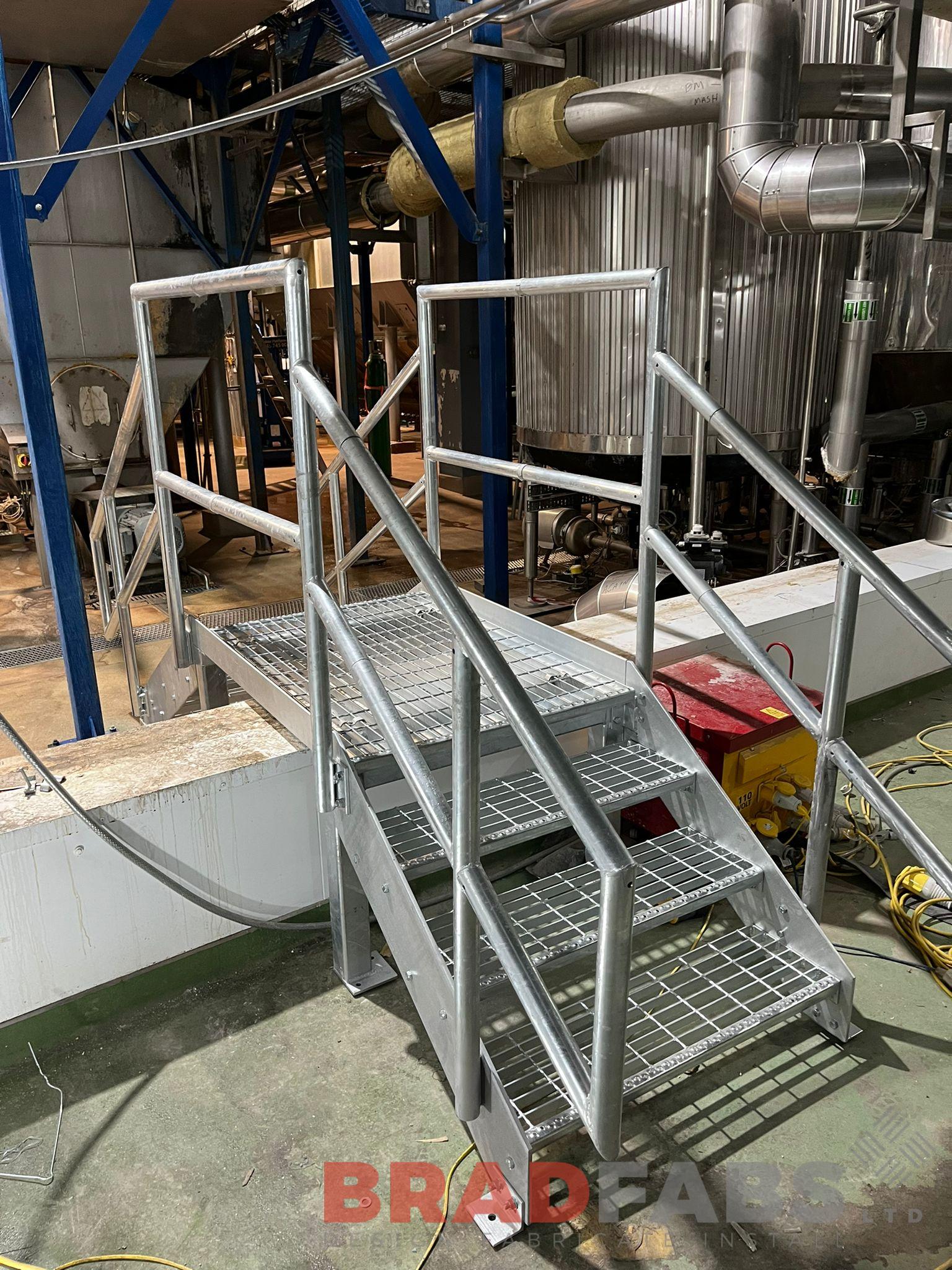 Two staircases for this project including a walkway, all manufactured in mild steel with open mesh treads.