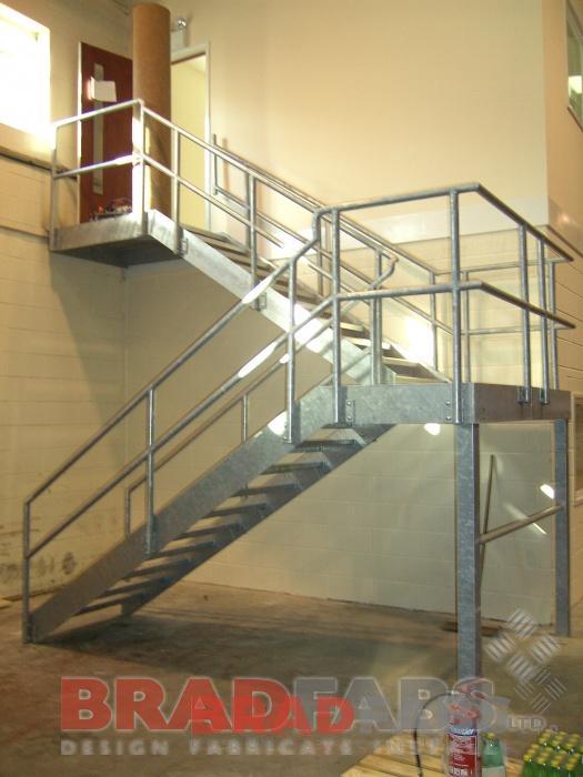 This straight staircase provides access to a mezzanine office floor. This staircase is fabricated in galvanized mild steel with anti-slip treads and steel stair stringers is installed at a food warehouse in Laisterdyke, Bradford, West Yorkshire.