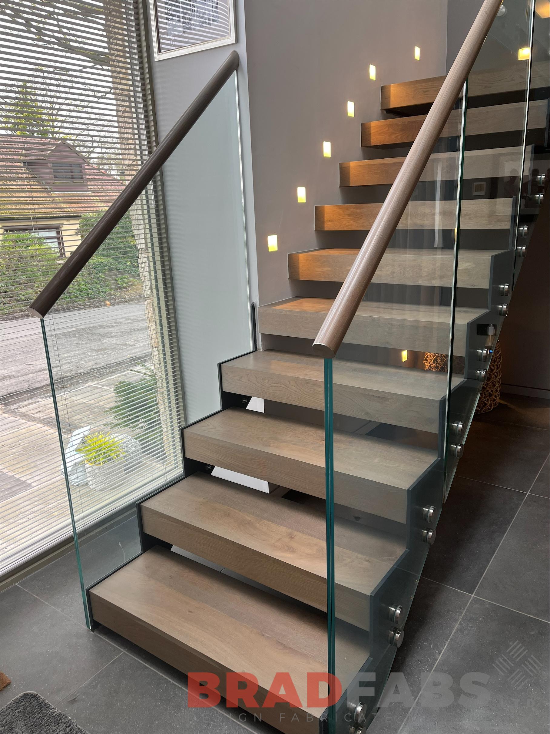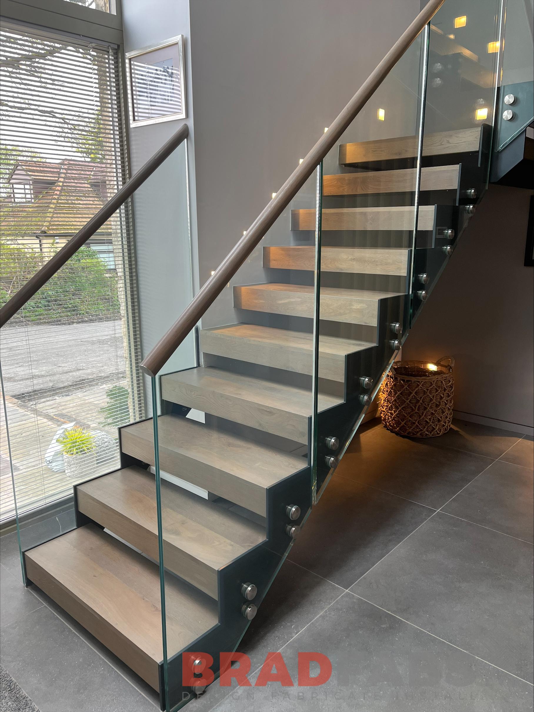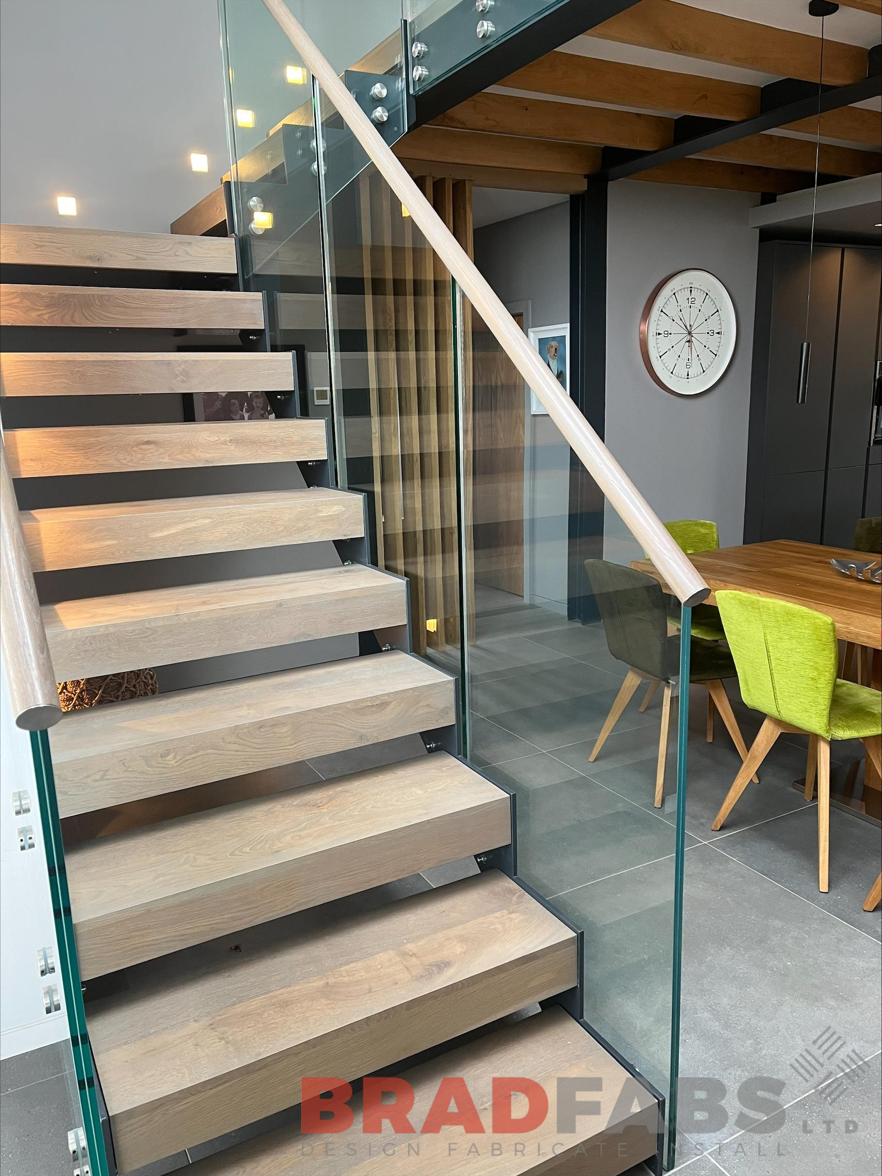 Internal stair with bolt on infinity glass and oak top rail and complete with oak treads