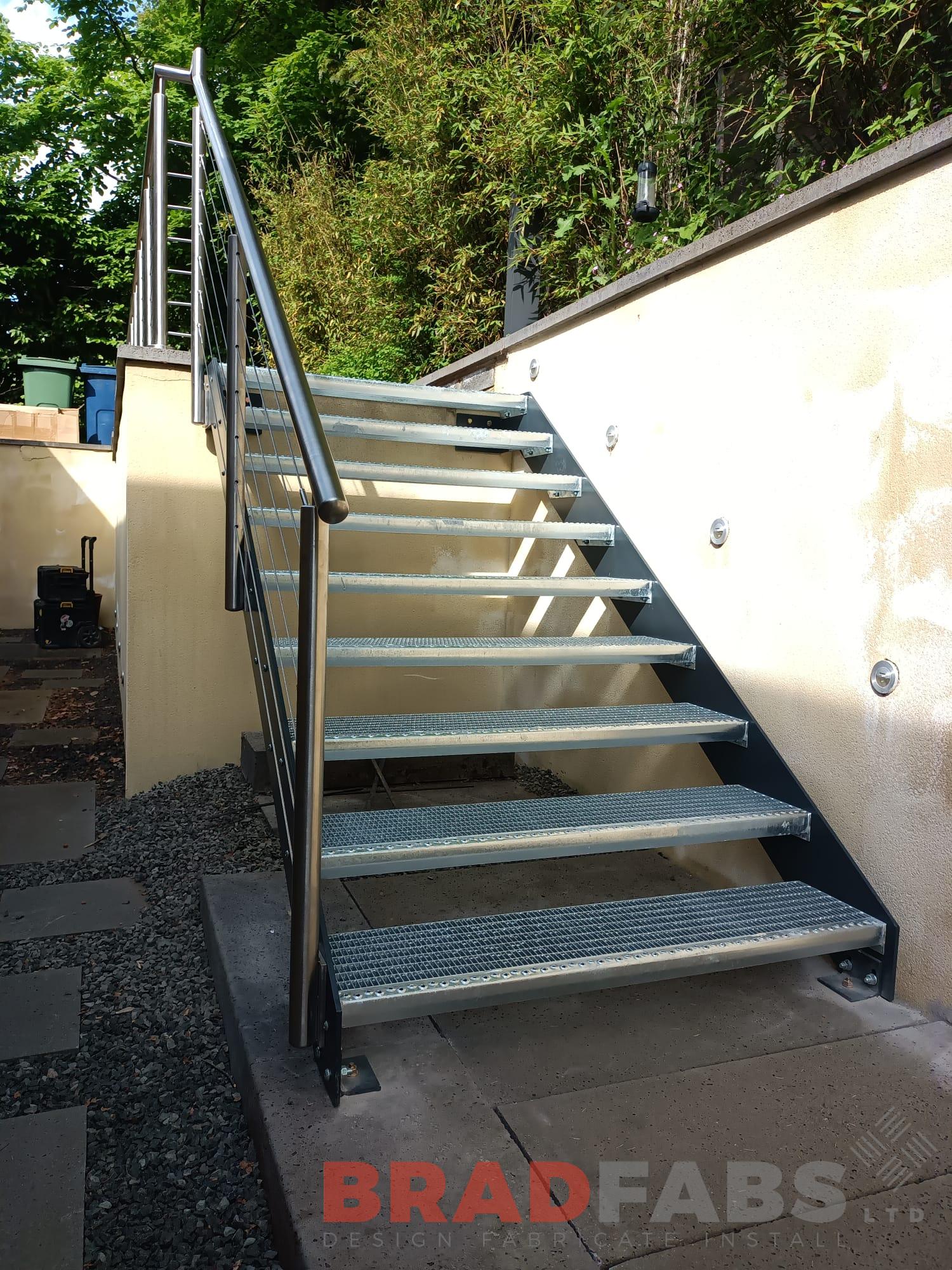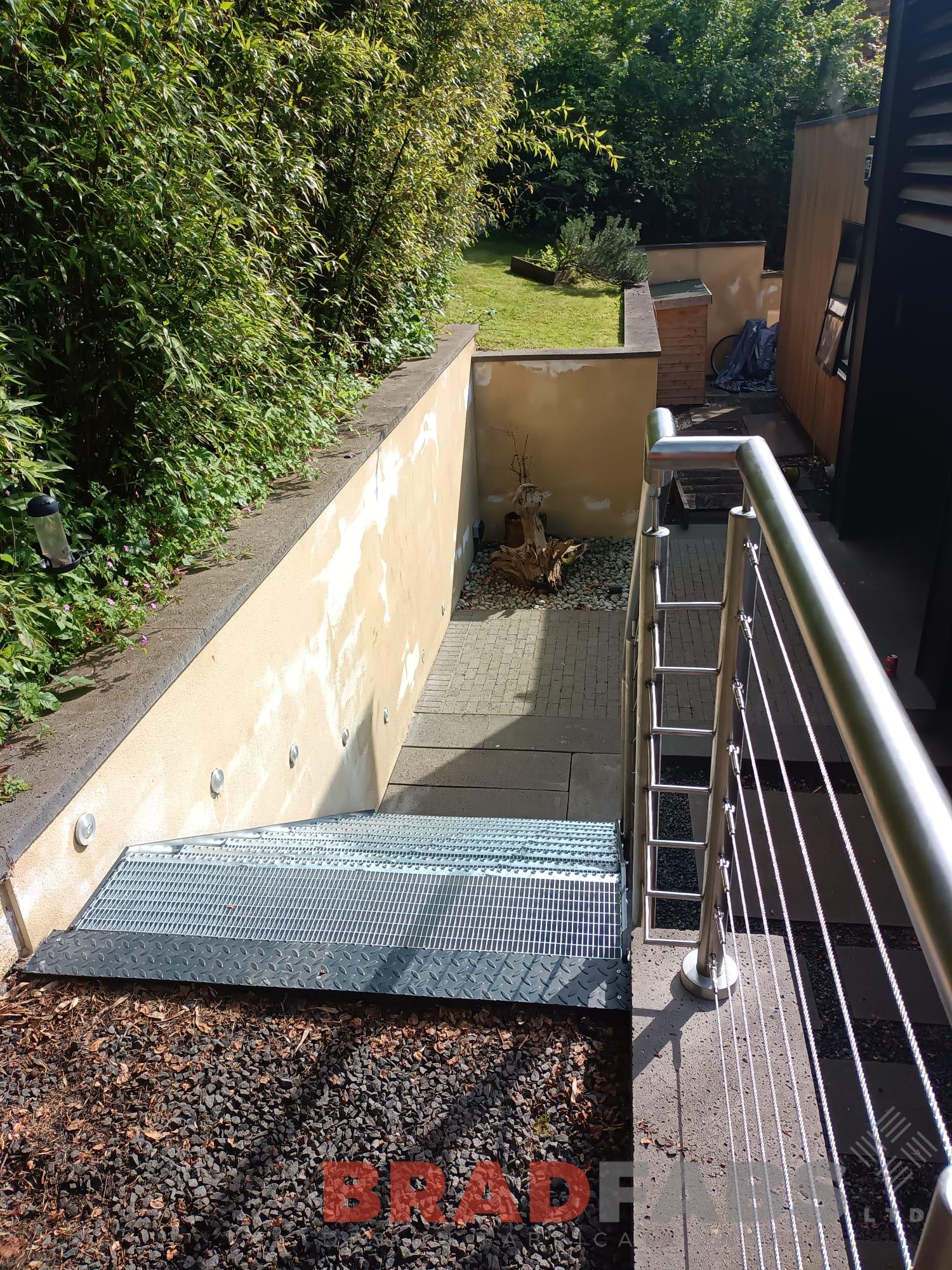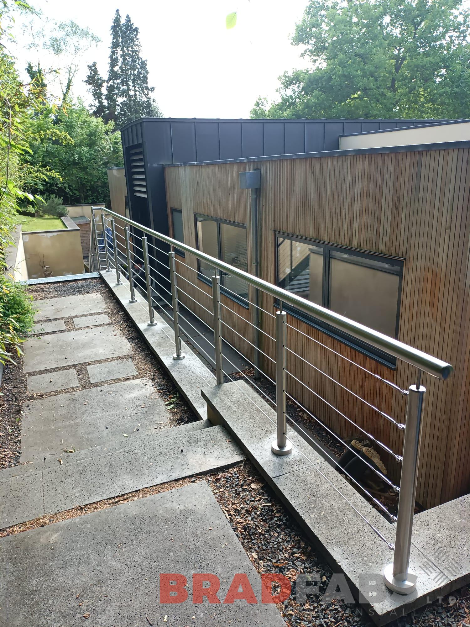 External straight staircase with brushed finish type 316 stainless steel balustrade and tension wires