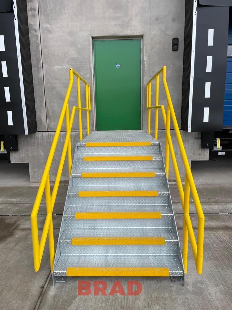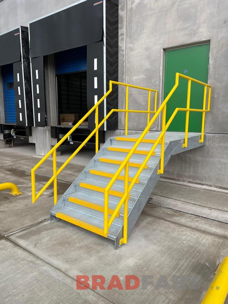 External steel stair with powder coated yellow top and mid rail balustrade and yellow nosings on the durbar treads
