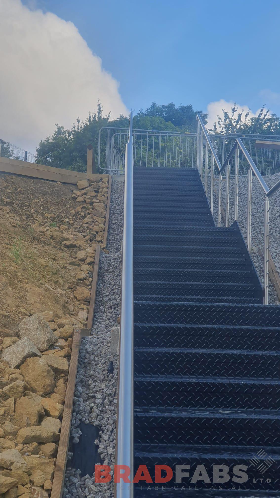 External staircase for a distribution centre. With durbar treads, complete with stainless steel and tension wire balustrade.