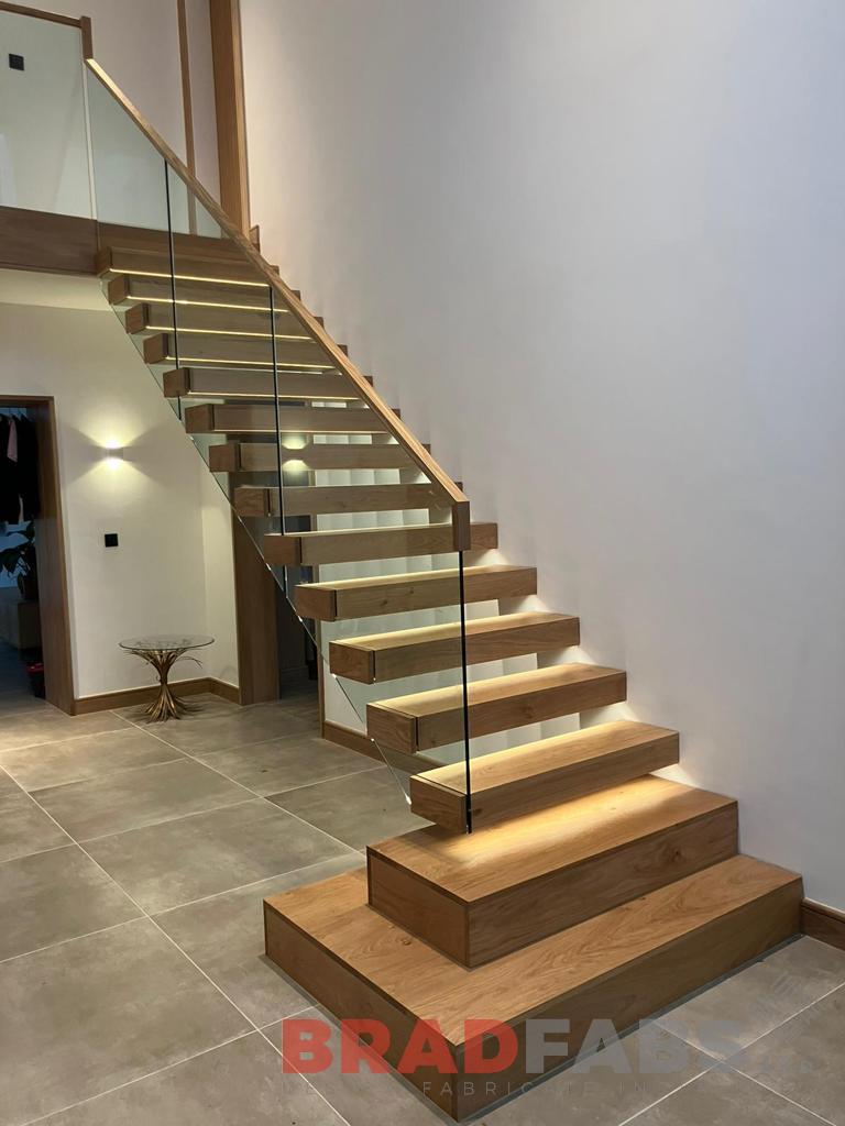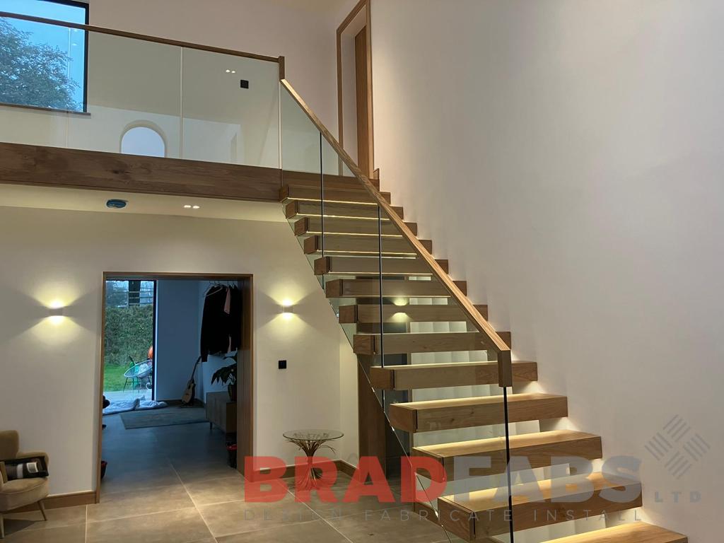 Floating staircase with hidden stringer and oak box treads