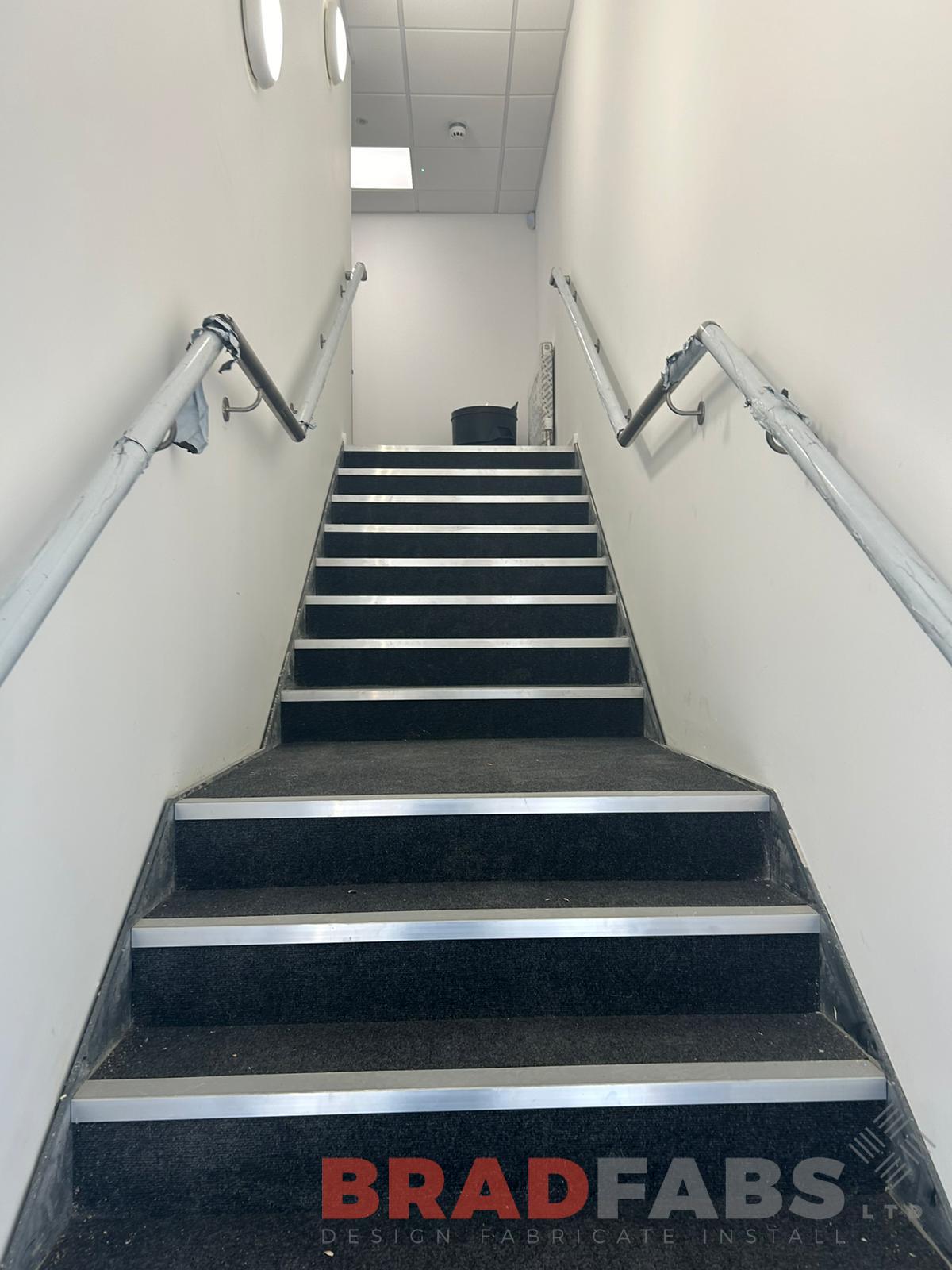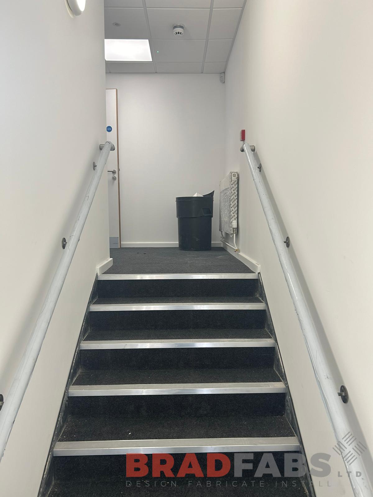 Internal staircase for a new car dealership! With stainless steel tubular wall mounted handrails and complete with pan folded treads