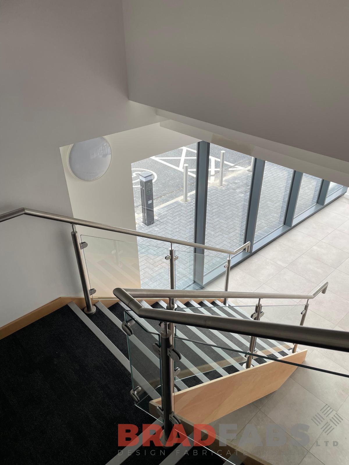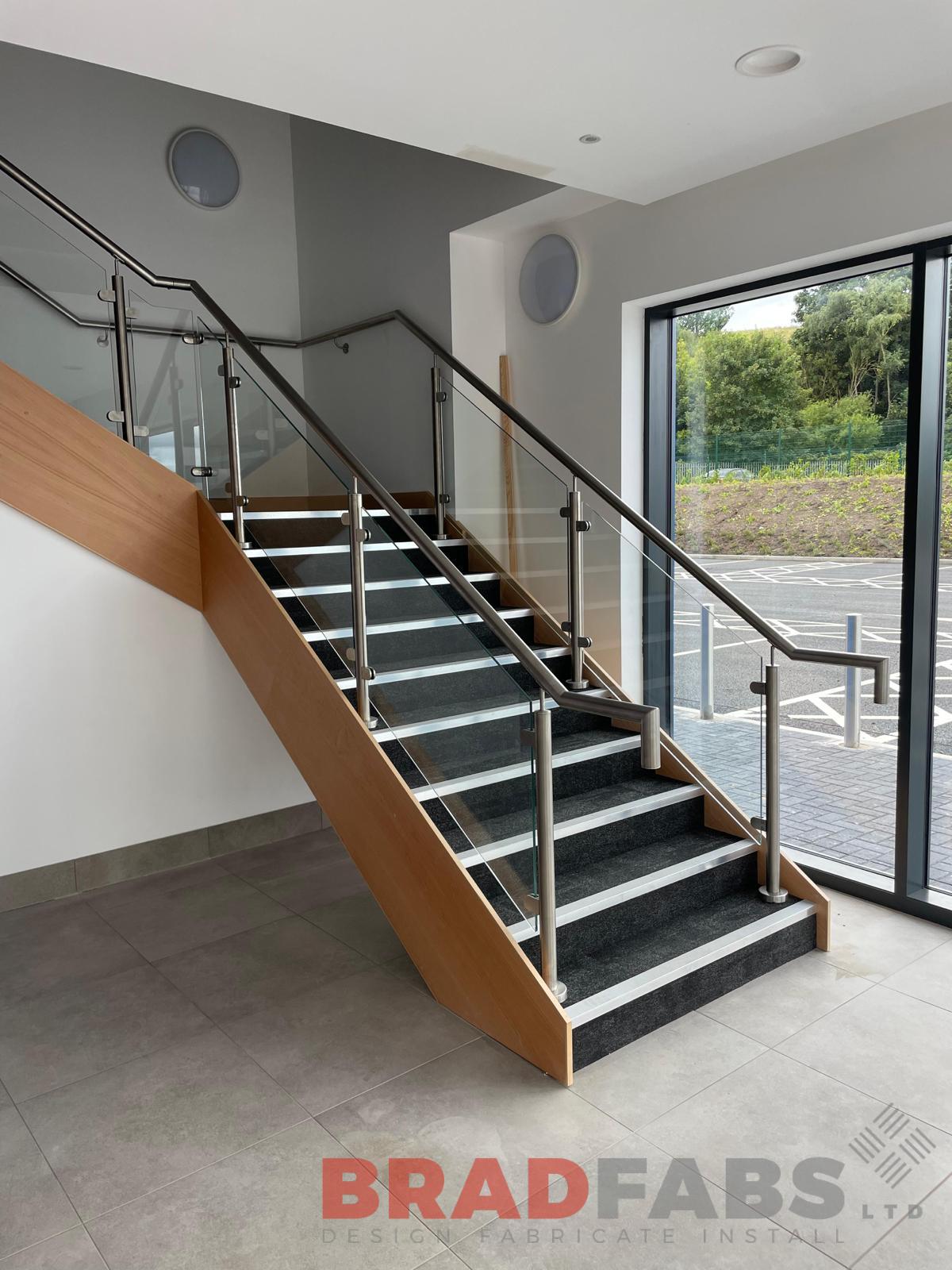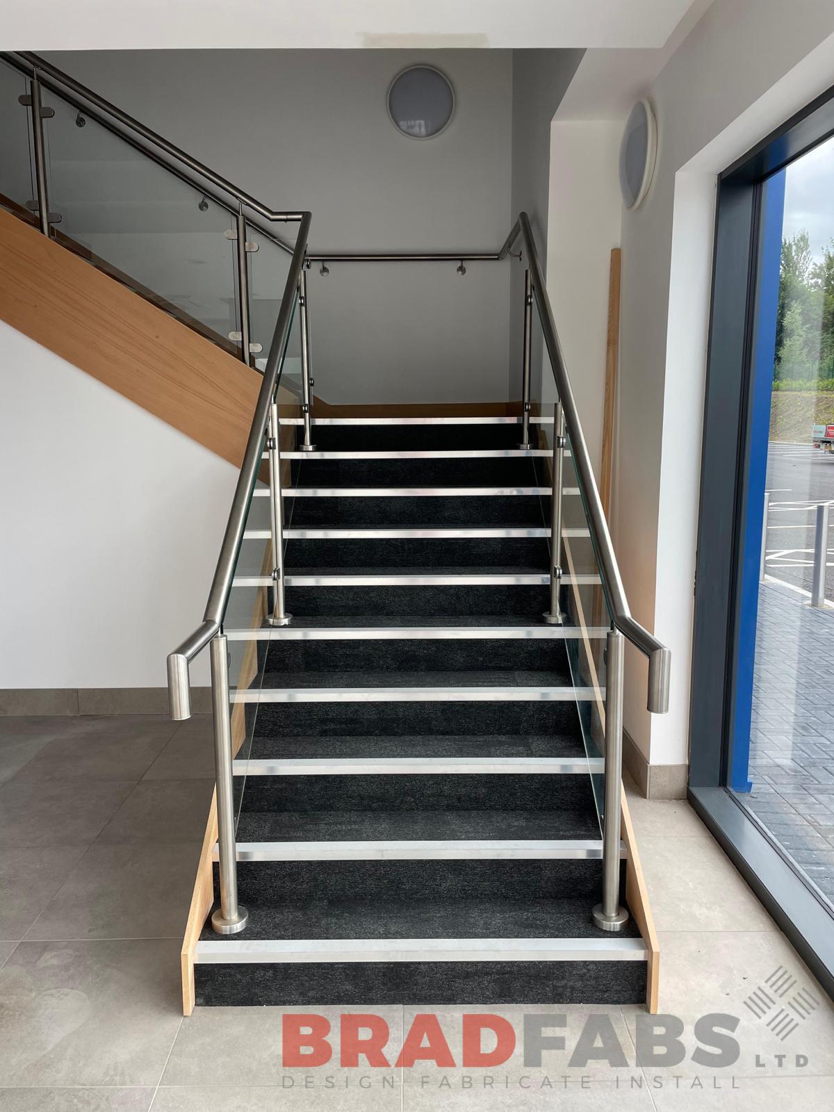 Internal commercial stair with tubular stainless steel balustrade and glass infill panels. Designed, supplied and installed by Bradfabs