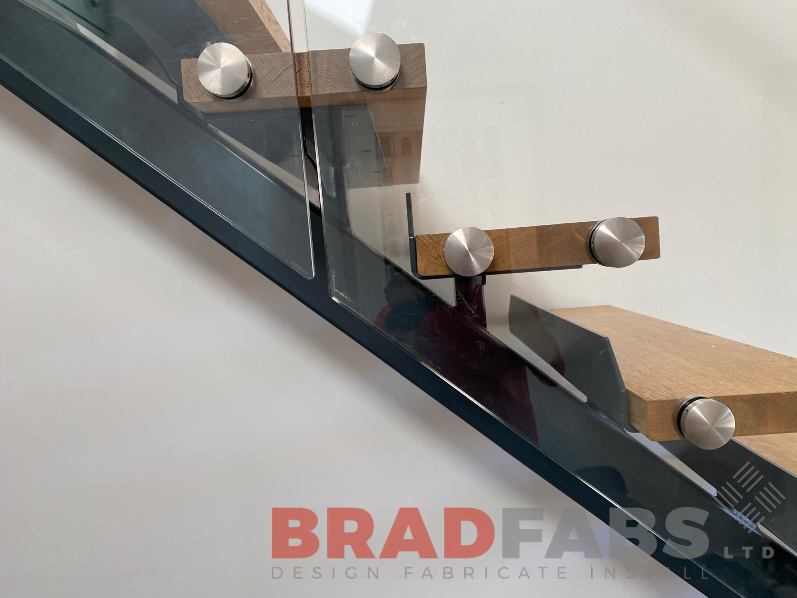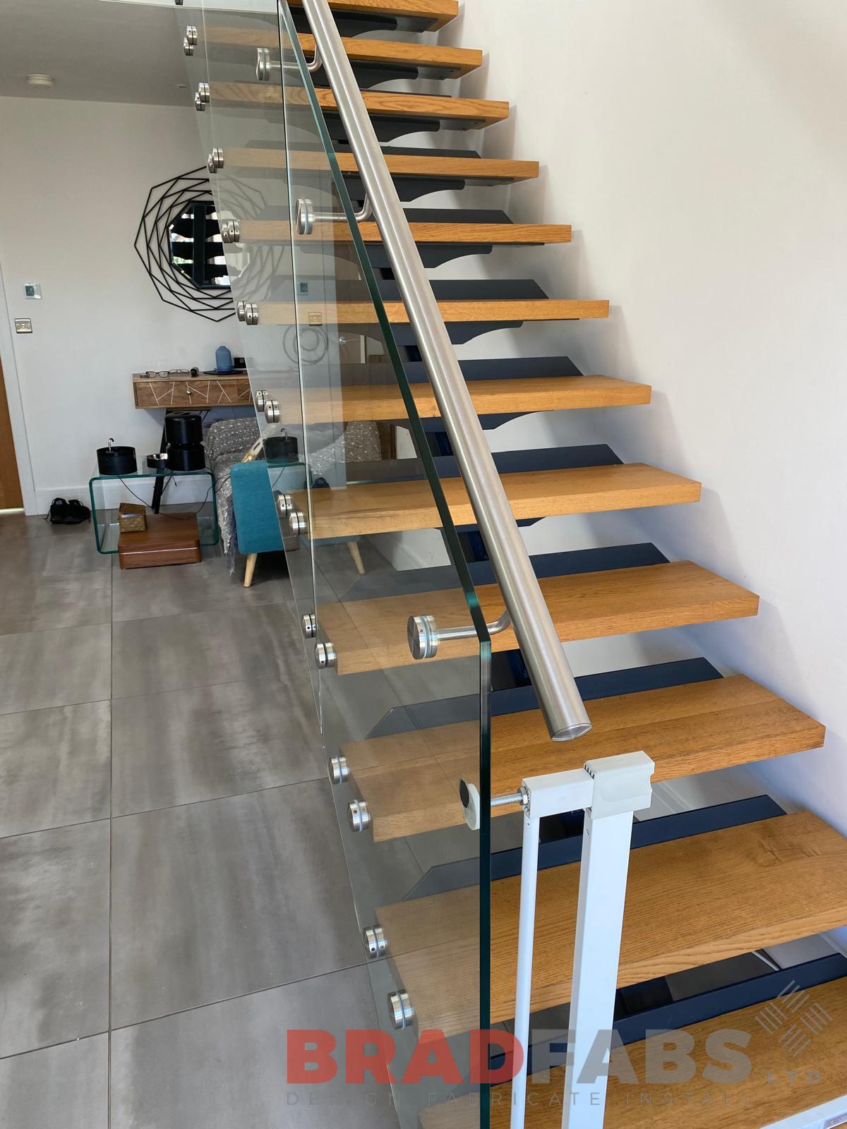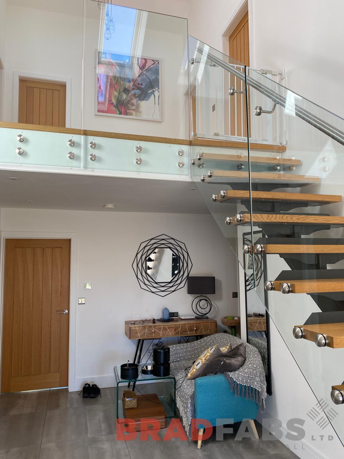 Beautiful straight stairs with bolt on infinity glass and stainless steel handrail with matching landing balustrade complete with oak treads