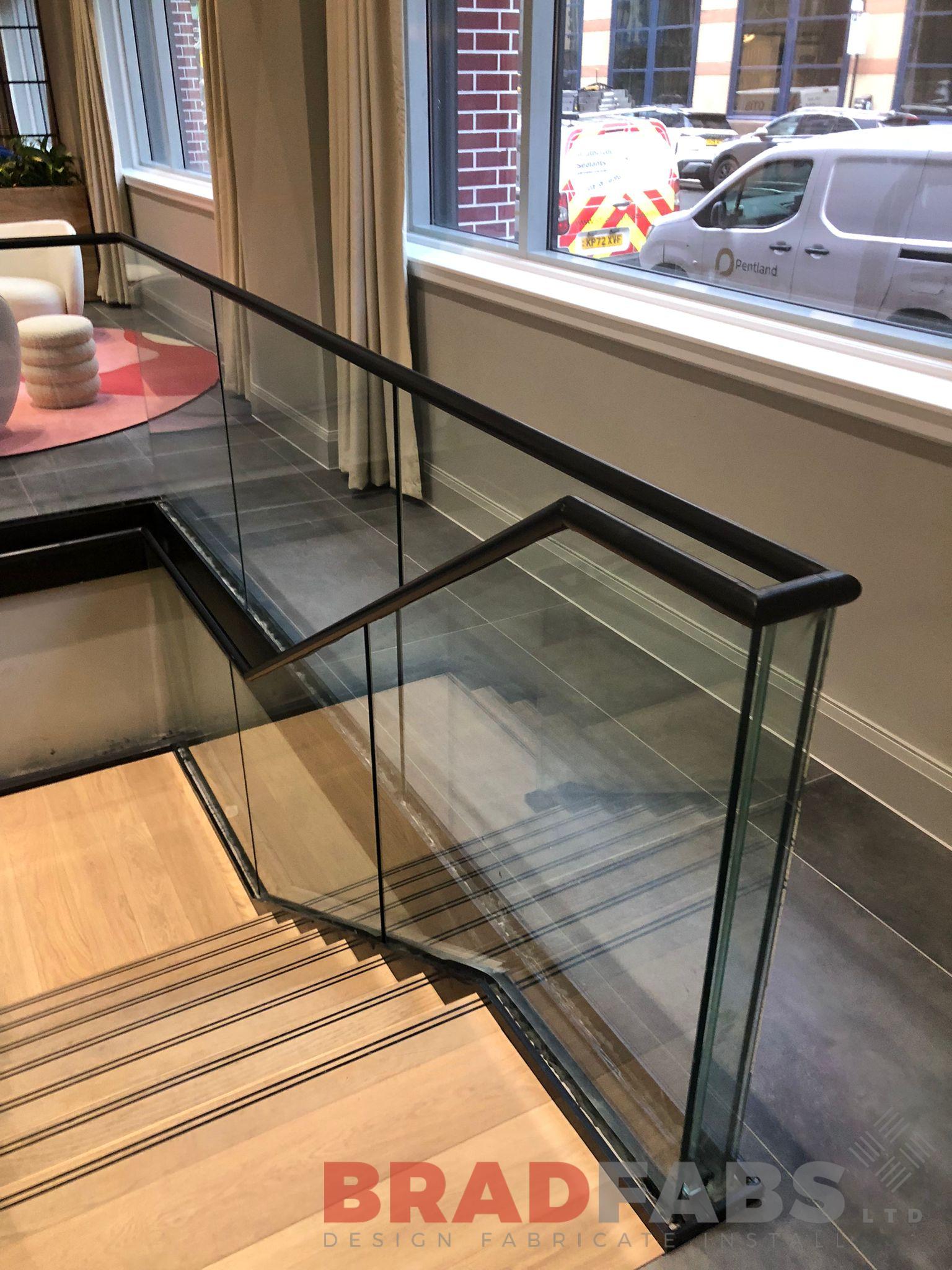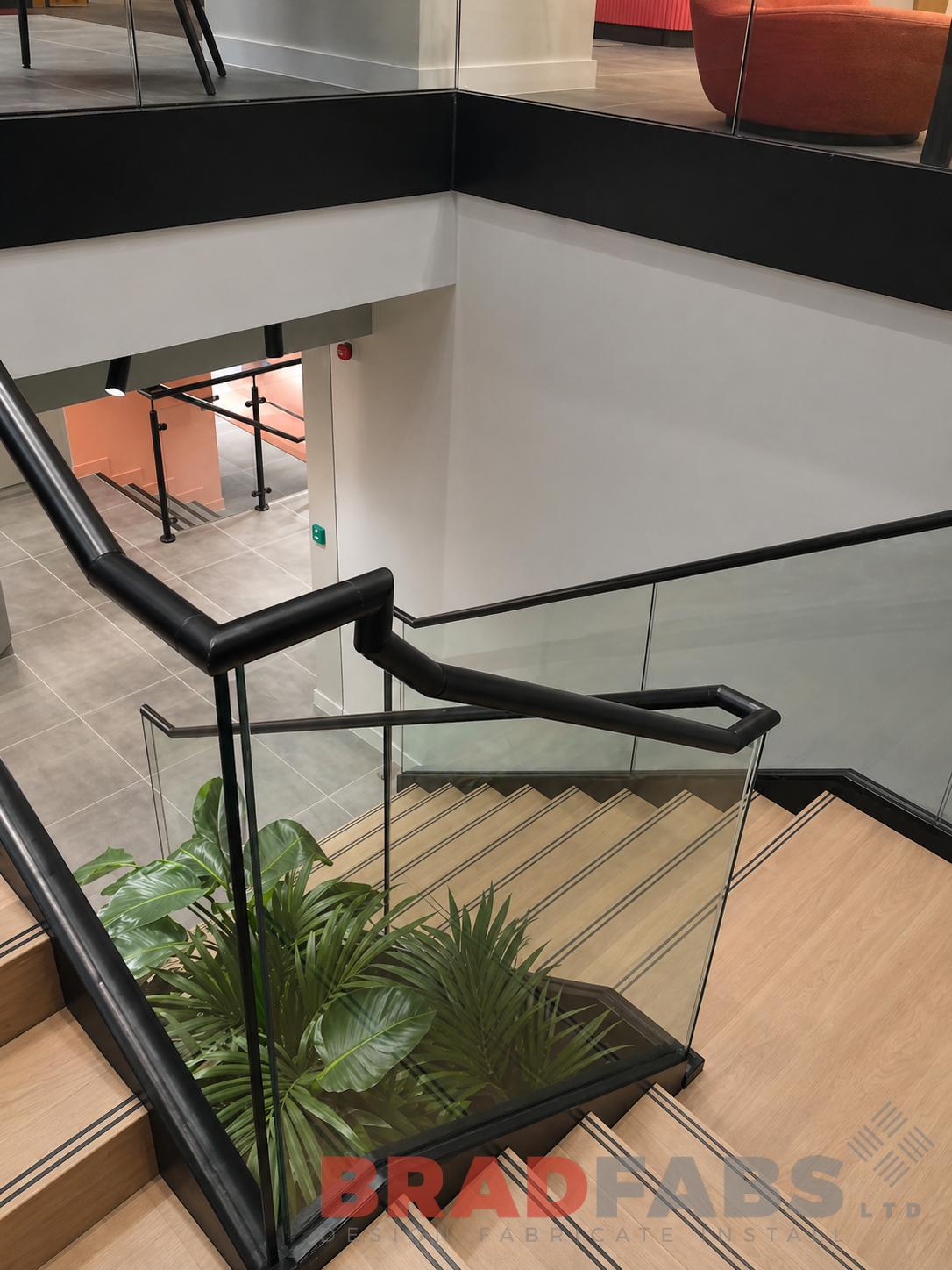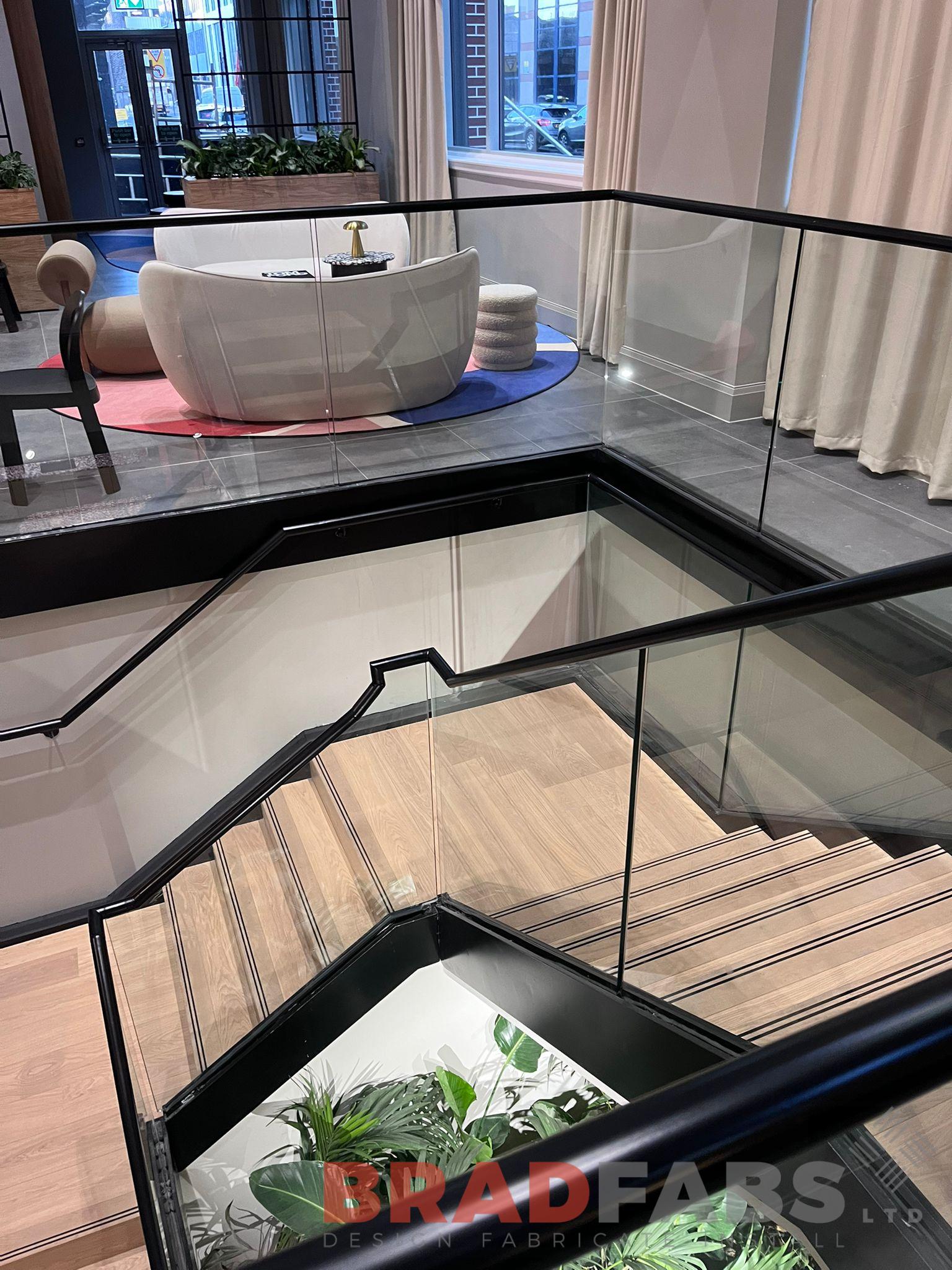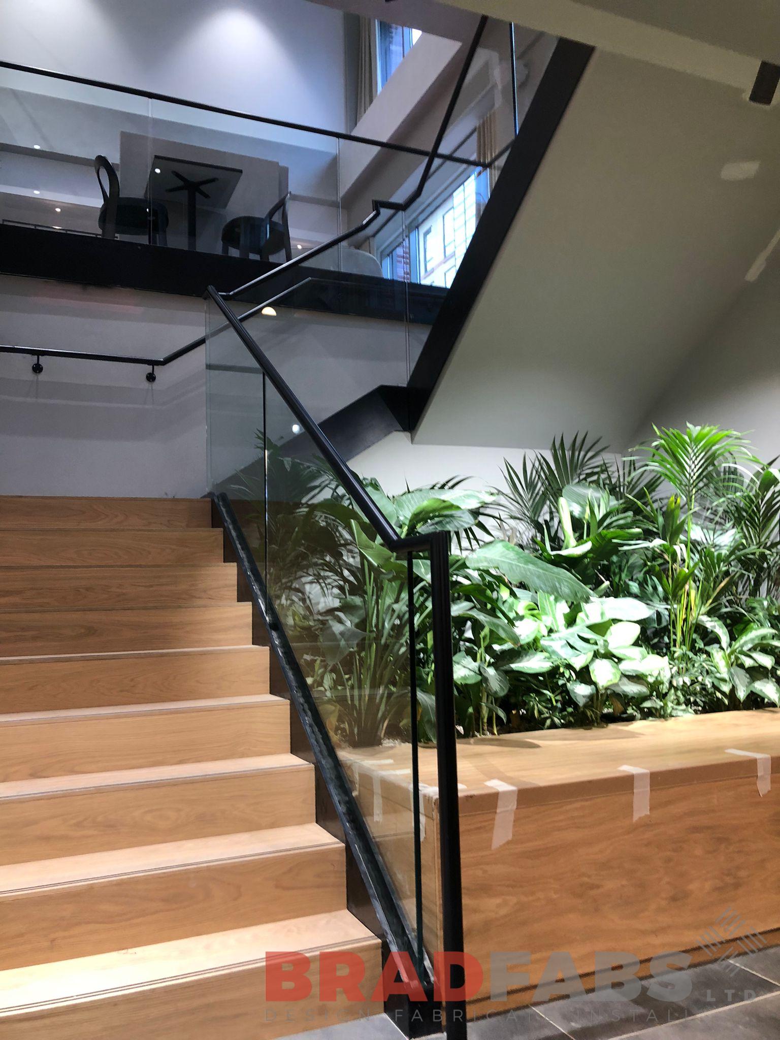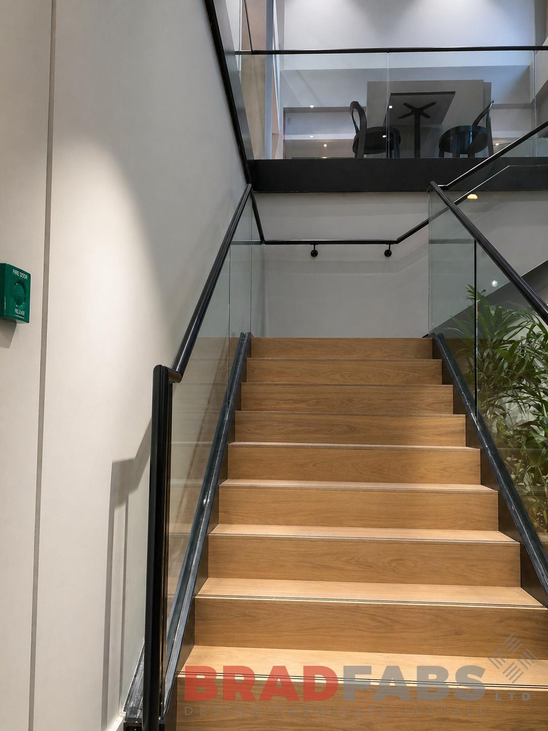 Supply and installation of new, powder coated stairs and bucket stringers to accept glass balustrade, with stainless steel top rail