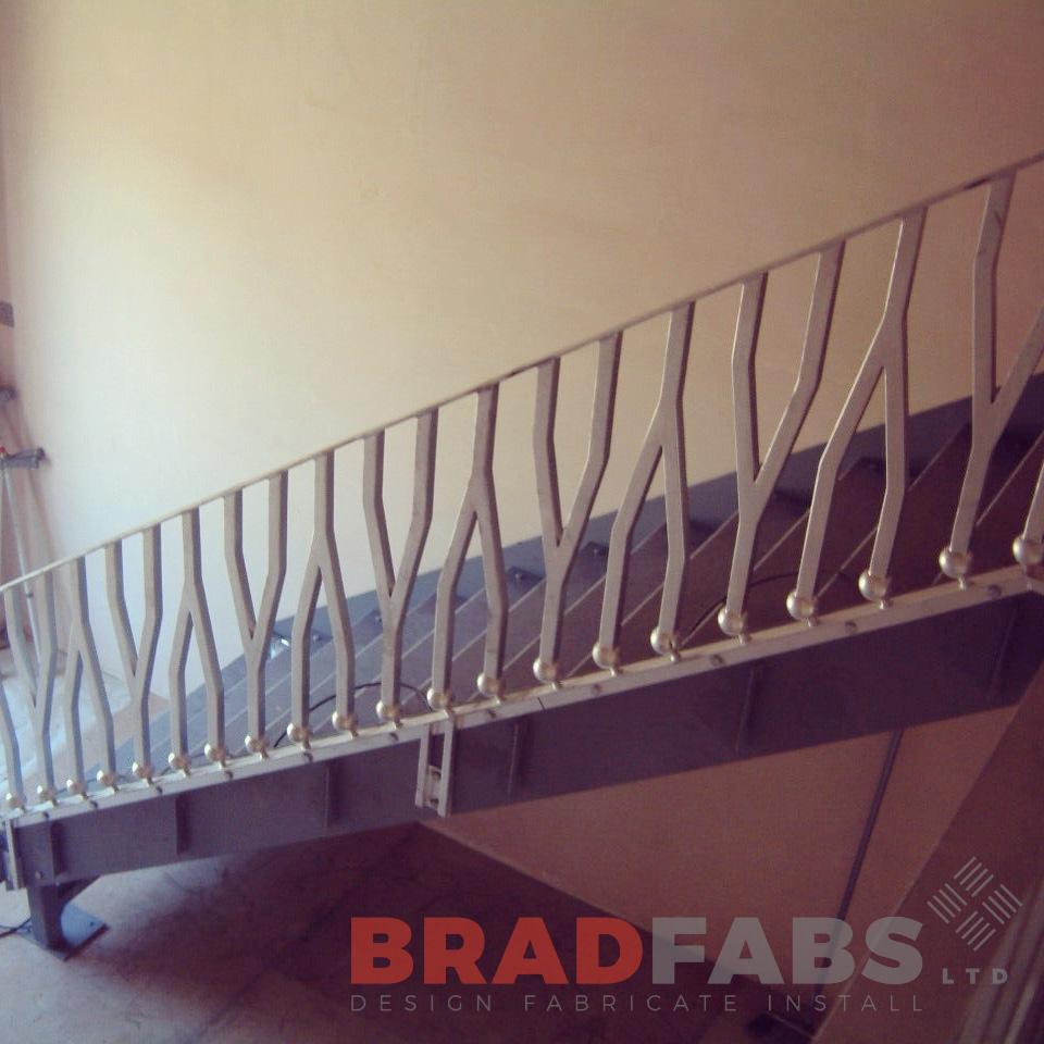 This bespoke steel staircase features decorative balustrading with staircase stringers and risers fabricated in mild steel, powder coated grey installed at public house in Bradford West Yorkshire.