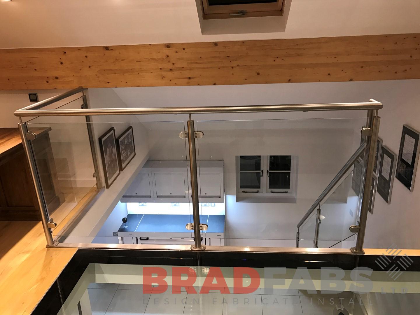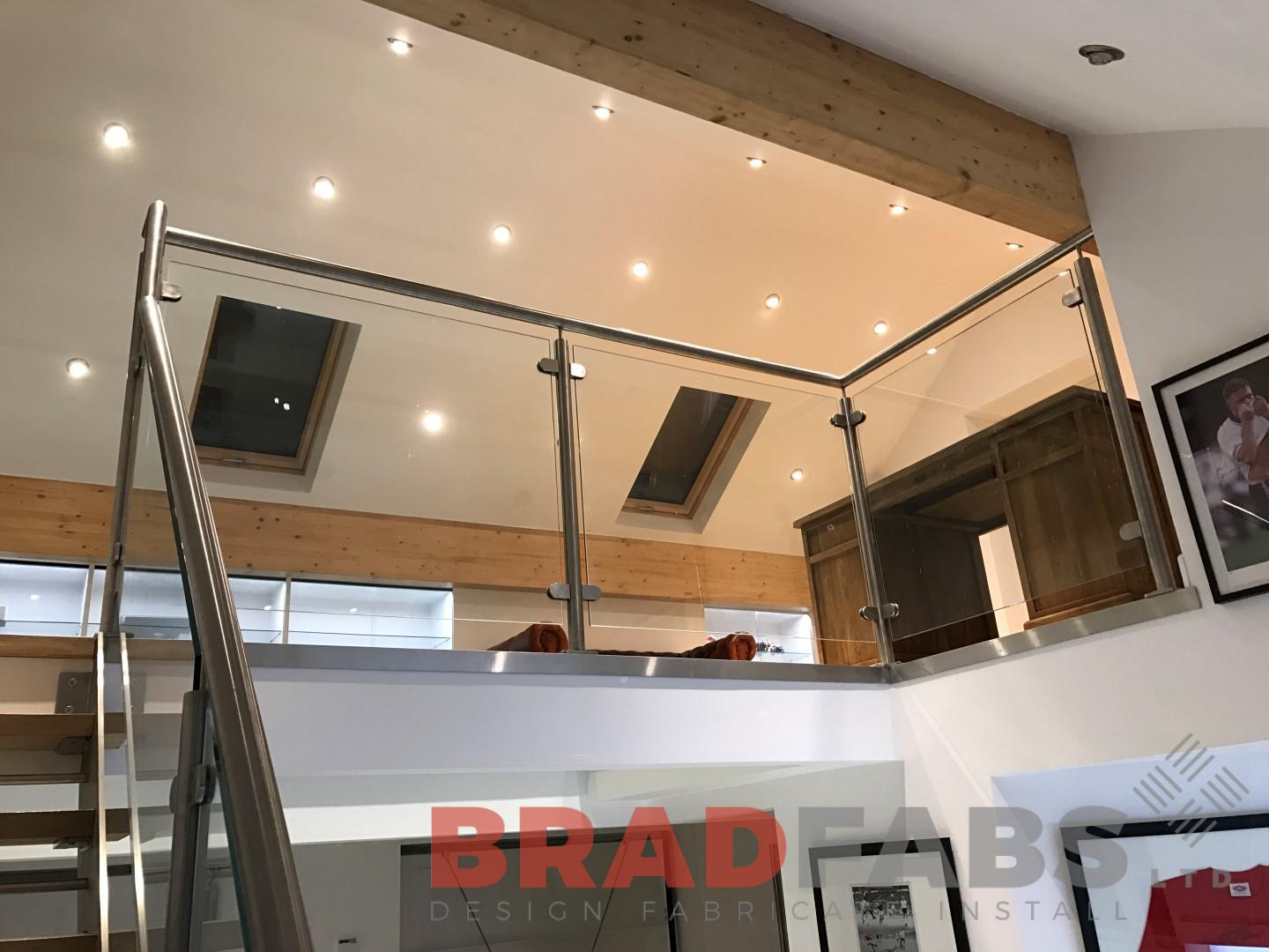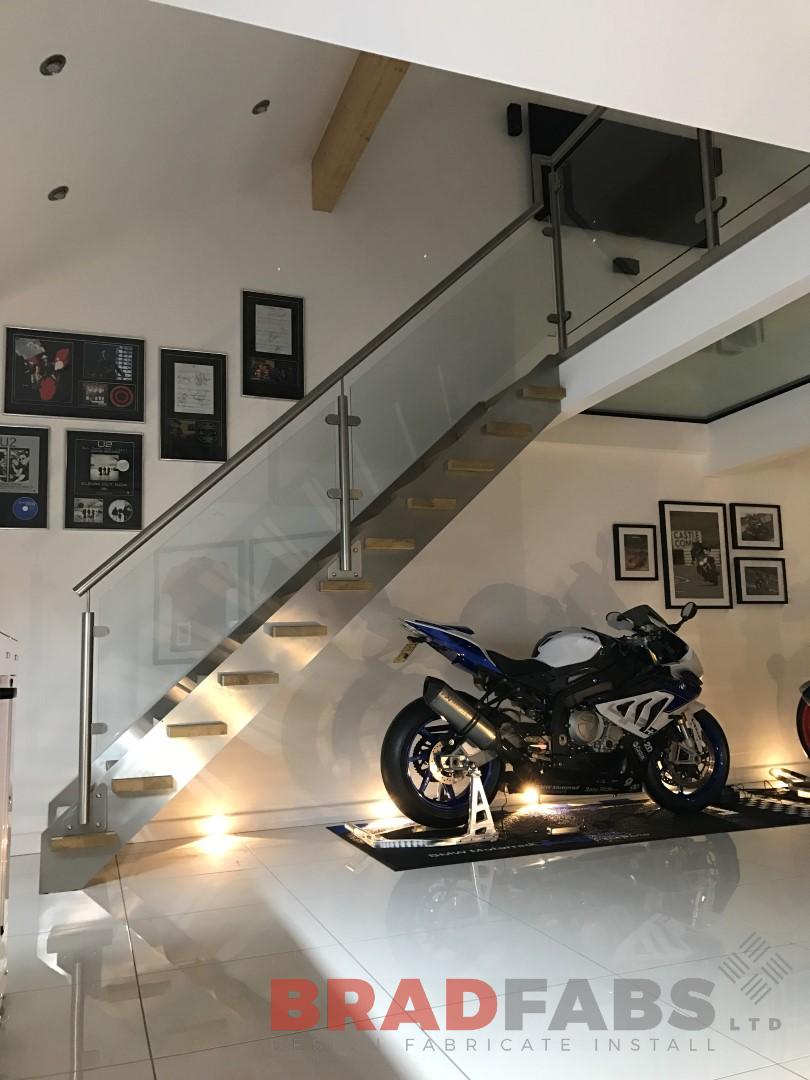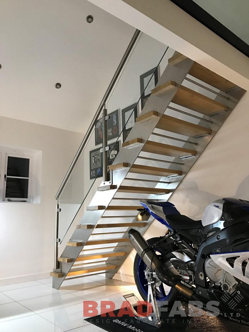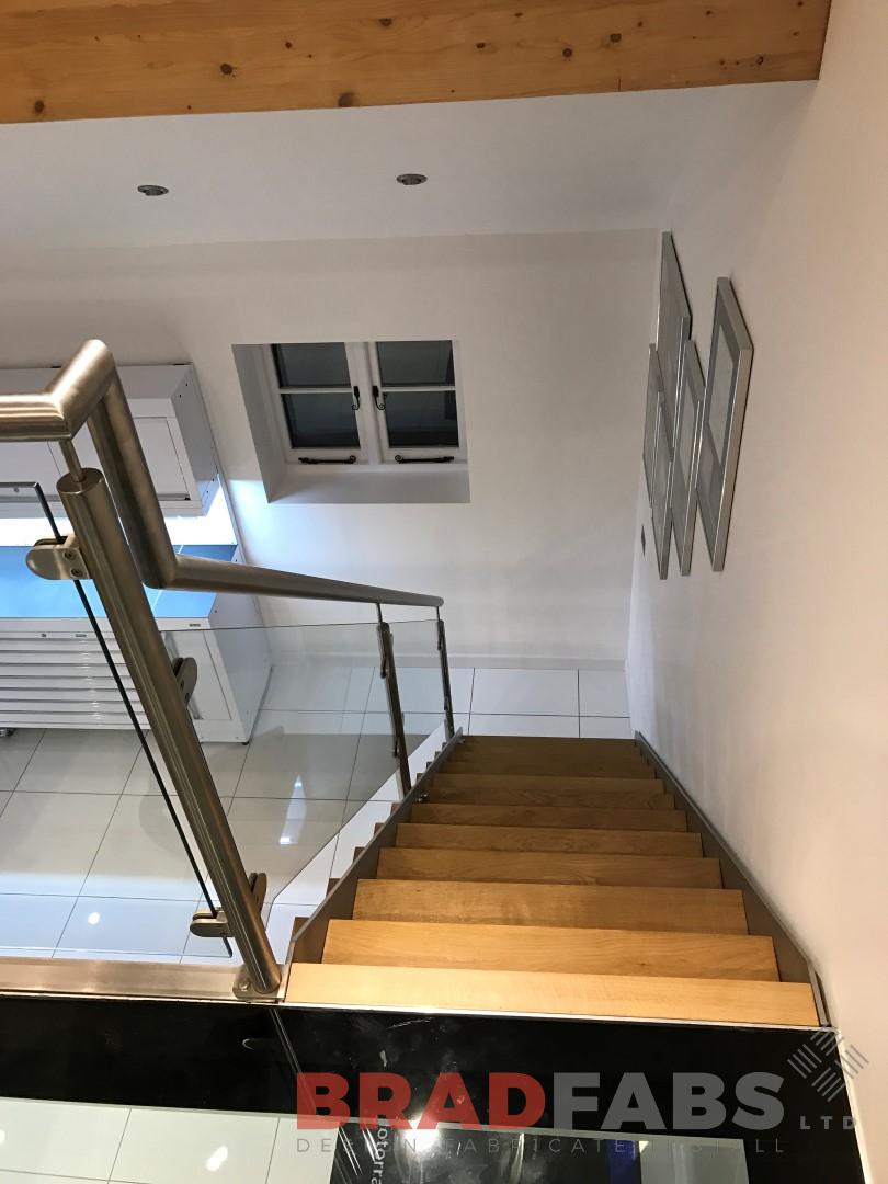 This staircase is made using stainless stee stringersl with oak treads and stainless steel balustrade with glass infil panels