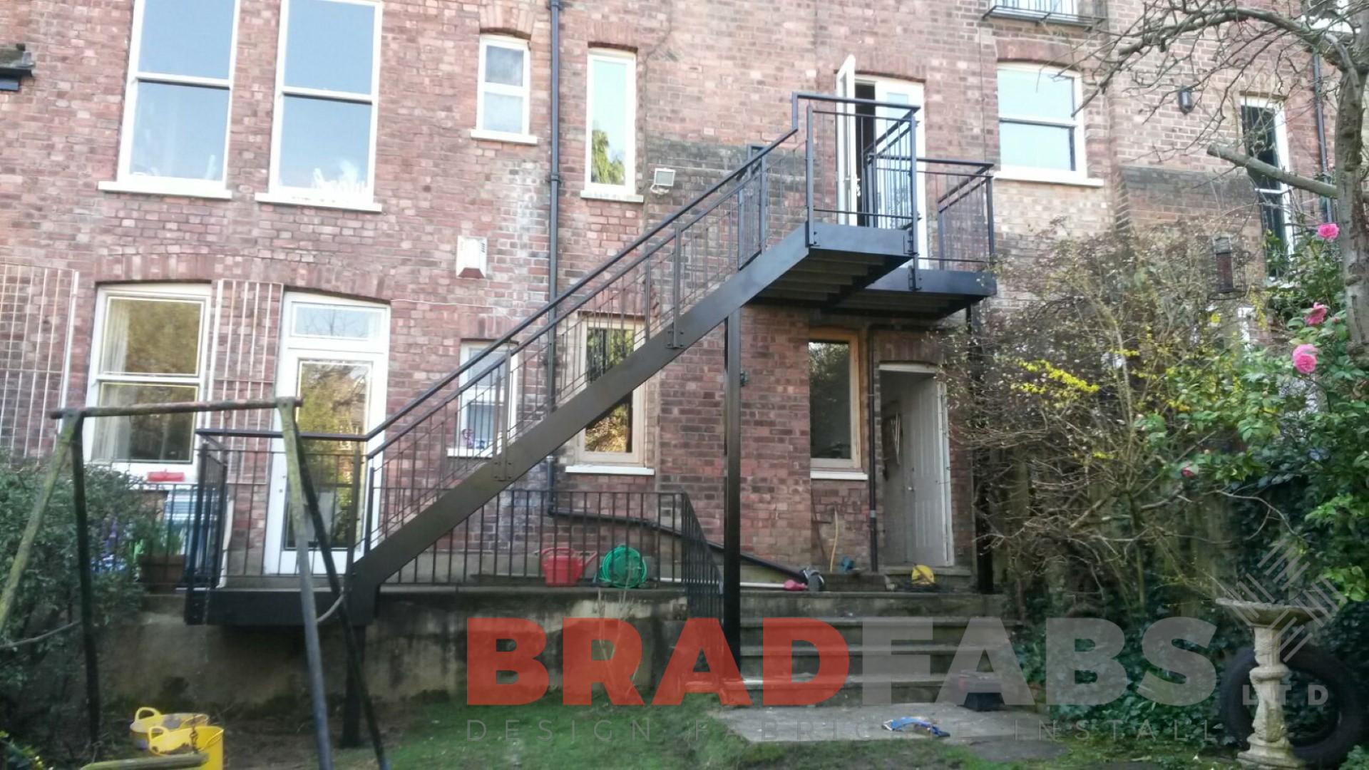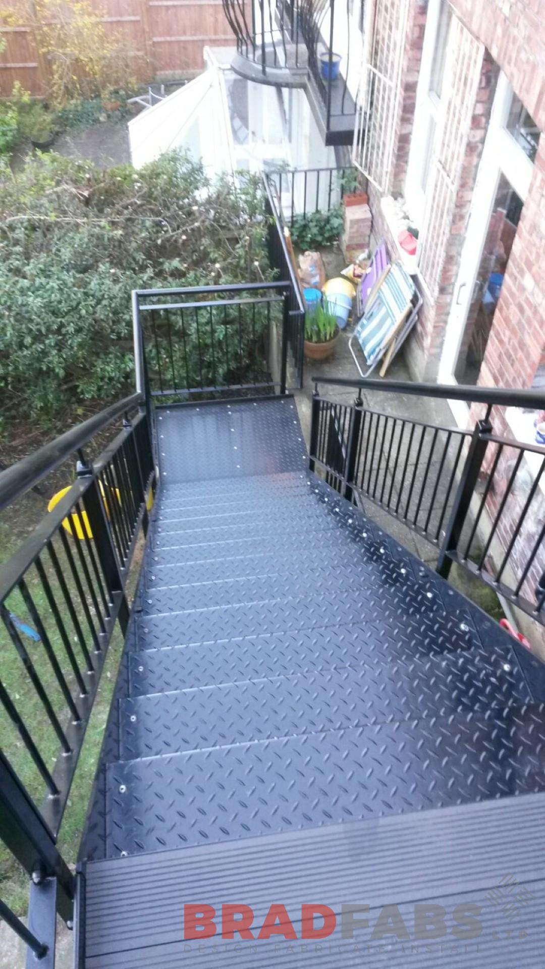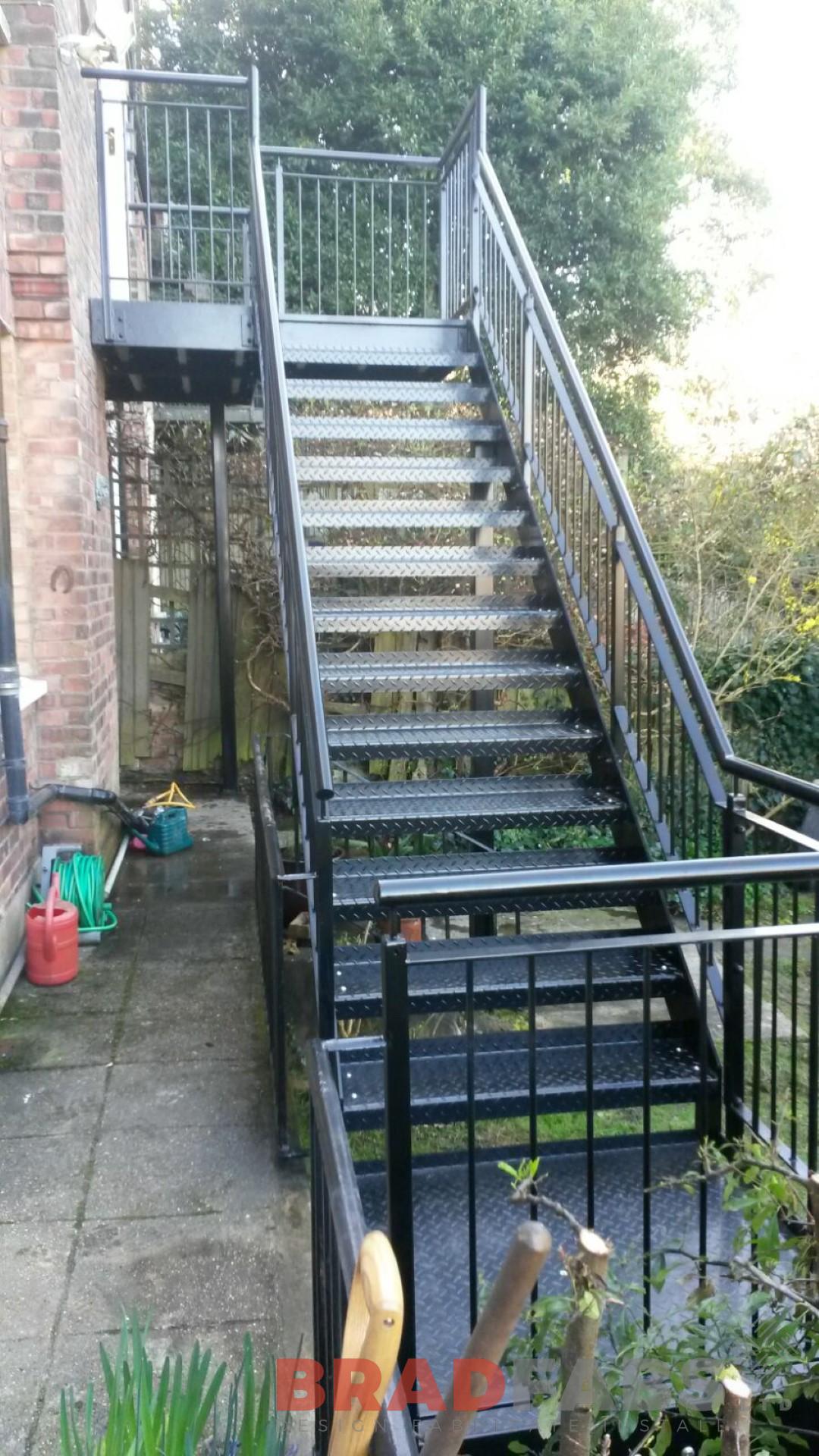 Mild steel, galvanised and powder coated staircase wiht durbar treads and landings. Mild steel, galvanised and powder coated vertical bar balustrding.