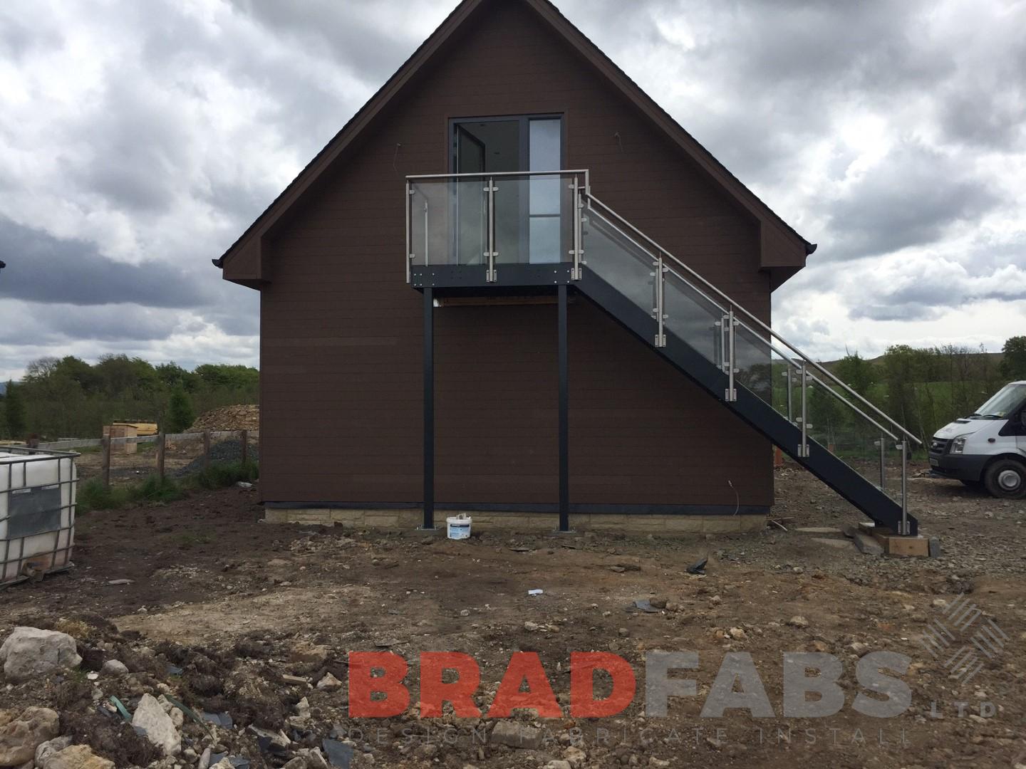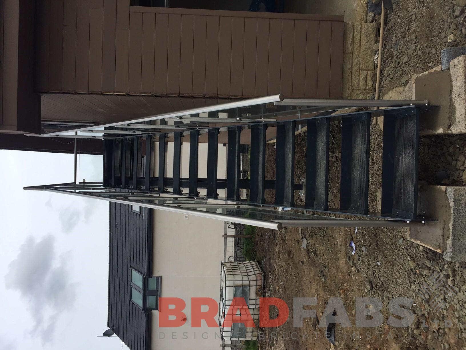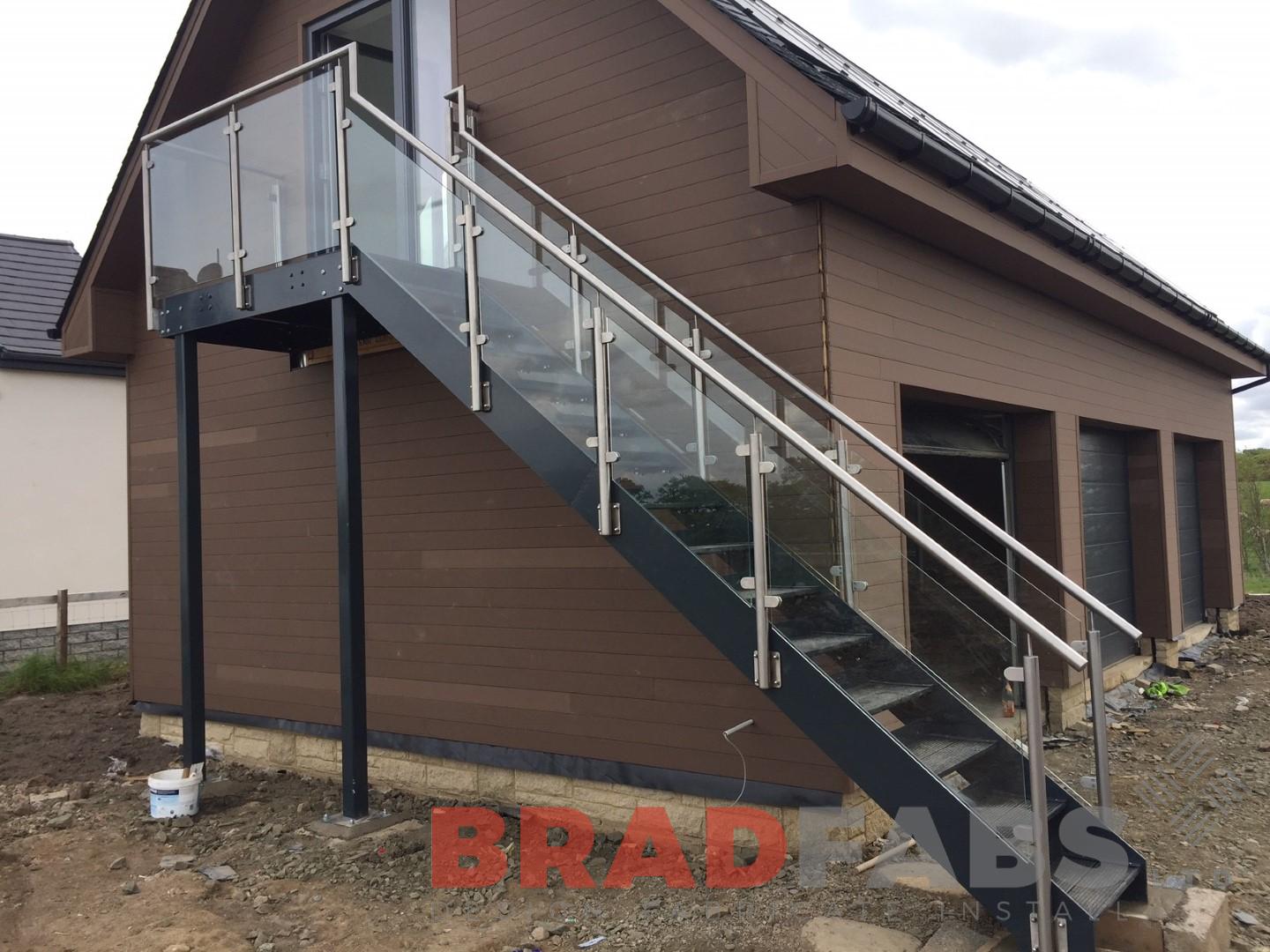 WOW factor mild steel, galvanised and powder coated straight access staircase with stainless steel handrail and uprights, 10mm toughened glass infill panels and composite decked treads.