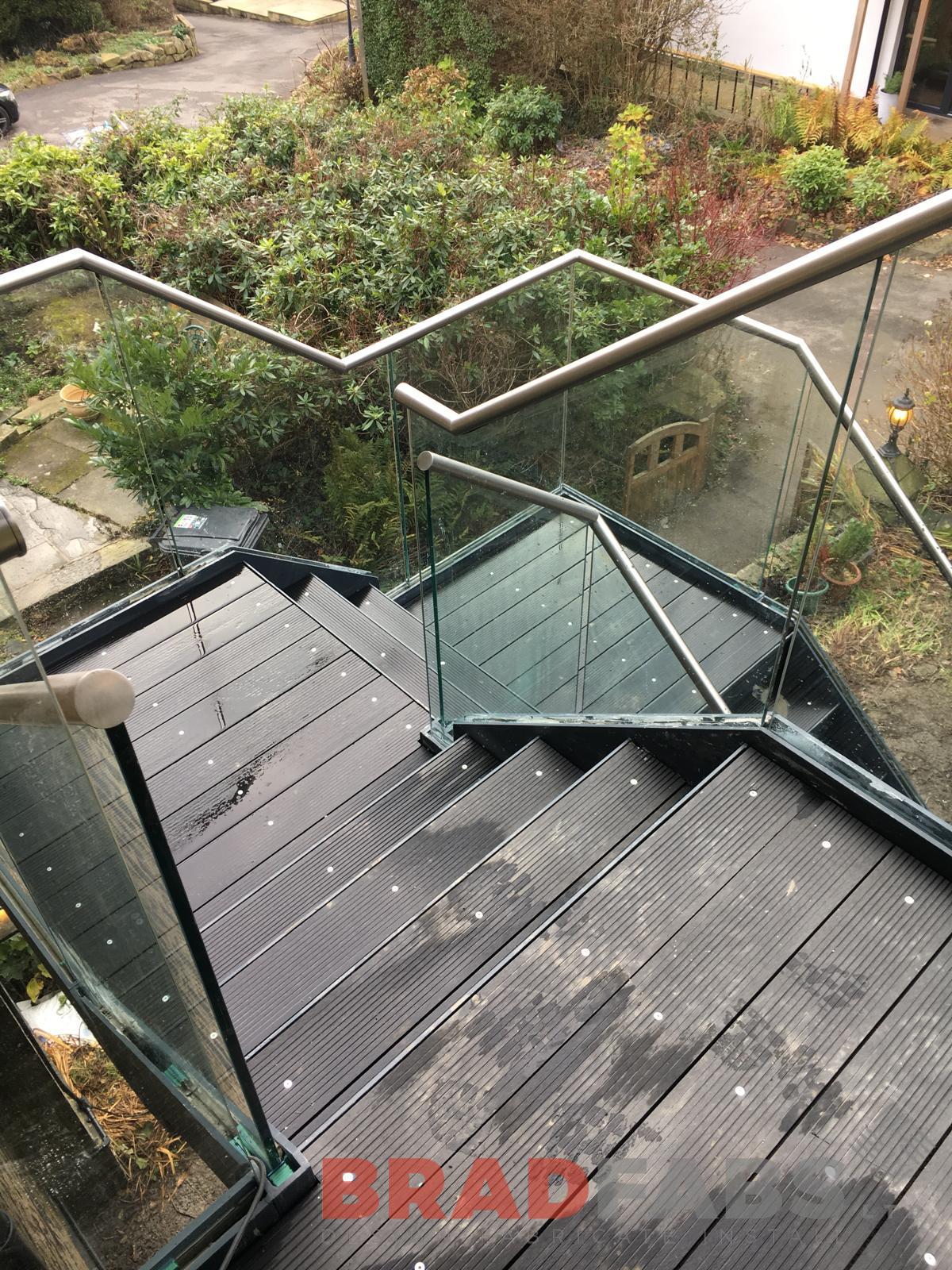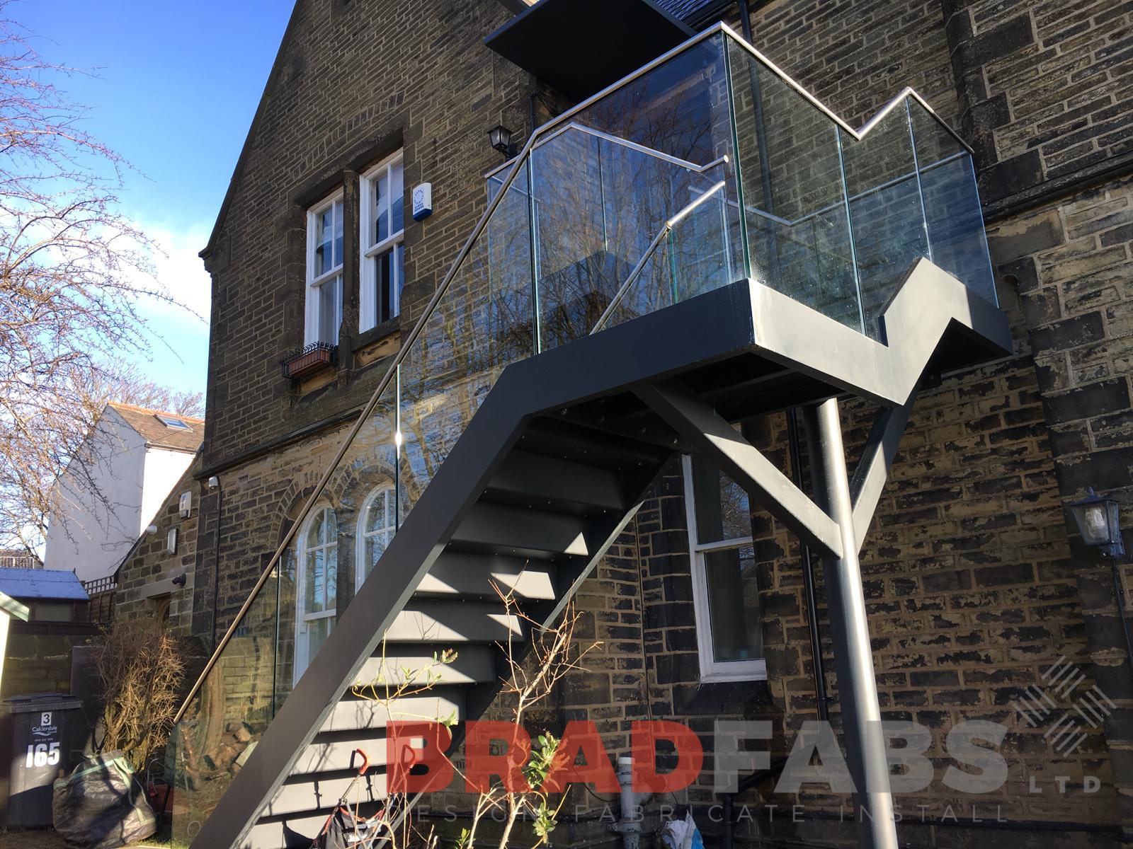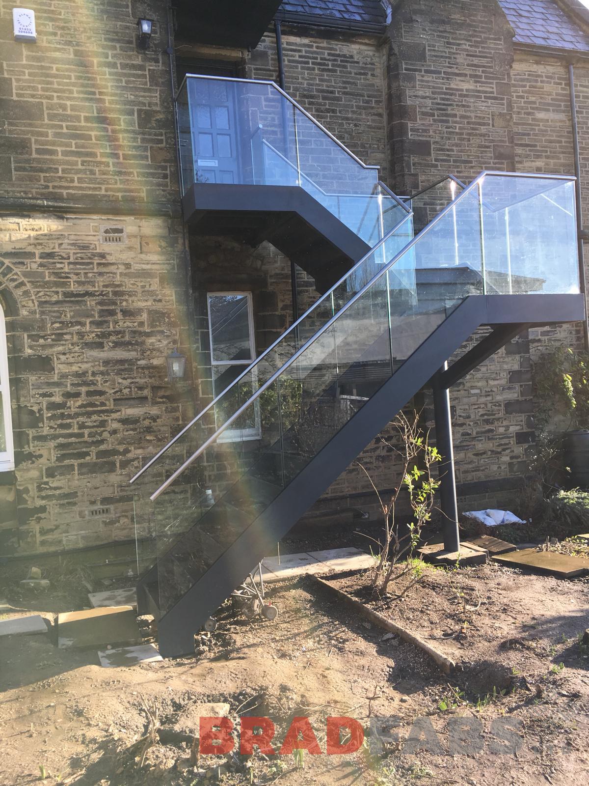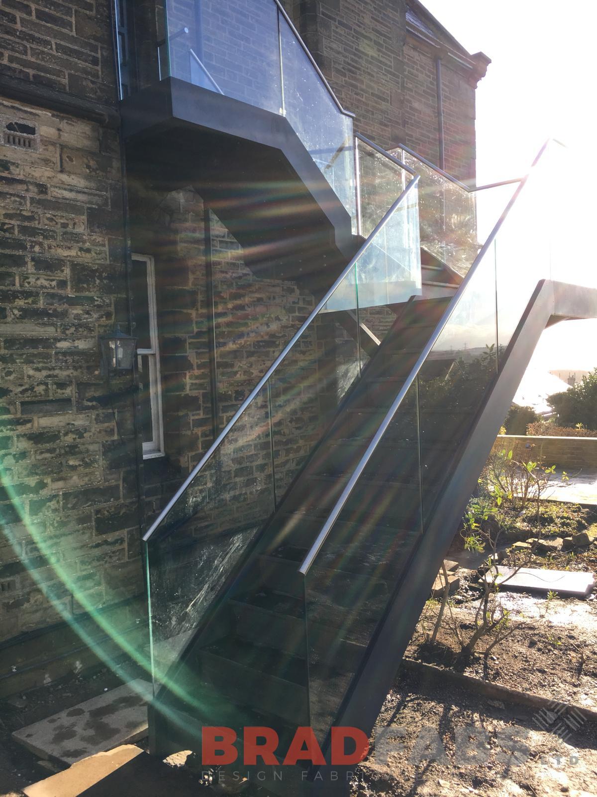 Beautiful bespoke straight external staircase for a residential property. Staircase manufactured in mild steel, galvanised and powder coated with infinity glass balustrade and stainless steel handrail and composite decked flooring