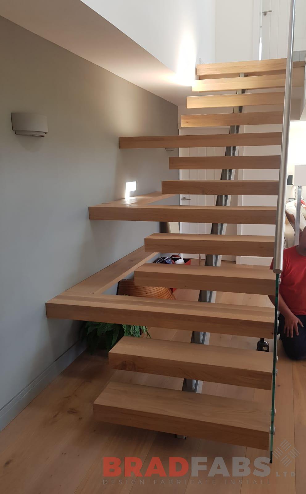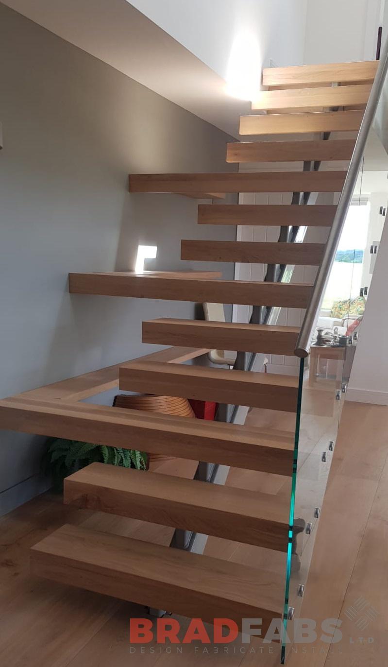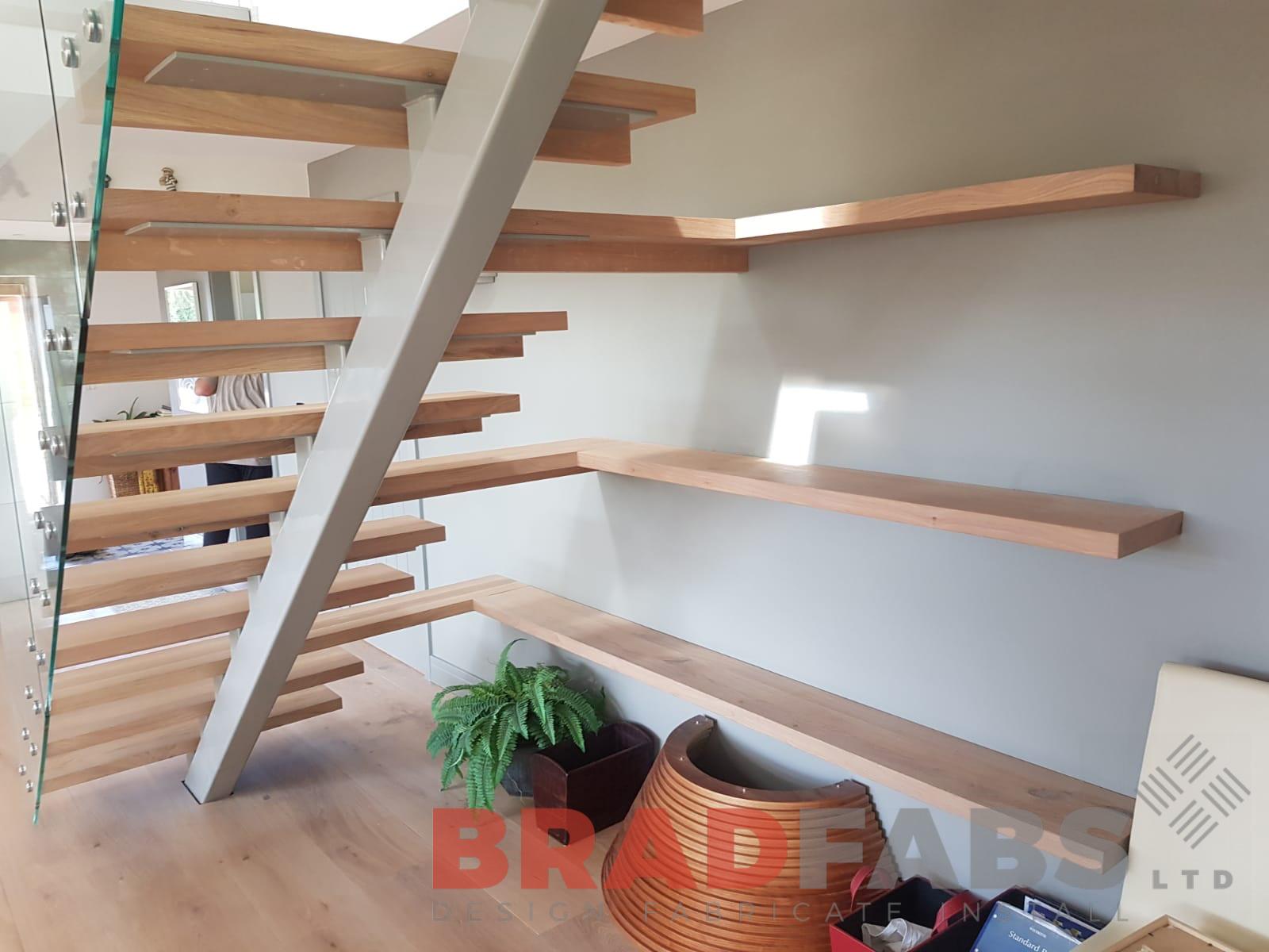 WOW what a beautiful modern staircase!! Oversized oak treads that lead round to book shelves, and infinity glass balustrade to one side with a stainless steel handrail.