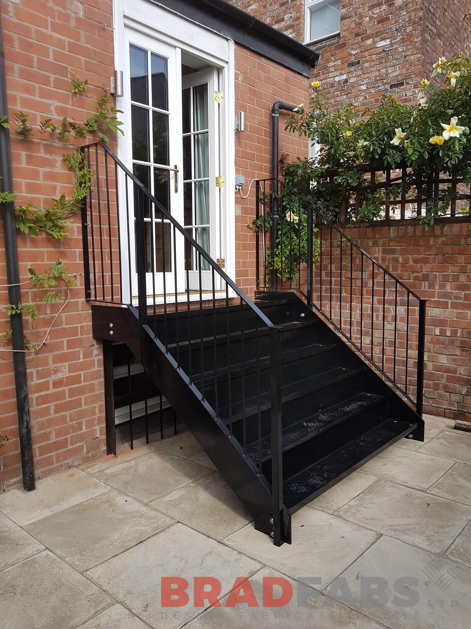 A simple yet elegant way to transform the entrance to your home. Mild steel, galvanised and powder coated black by customers choice, with vertical bar balustrade and complete with durbar treads for extra grip underfoot.
