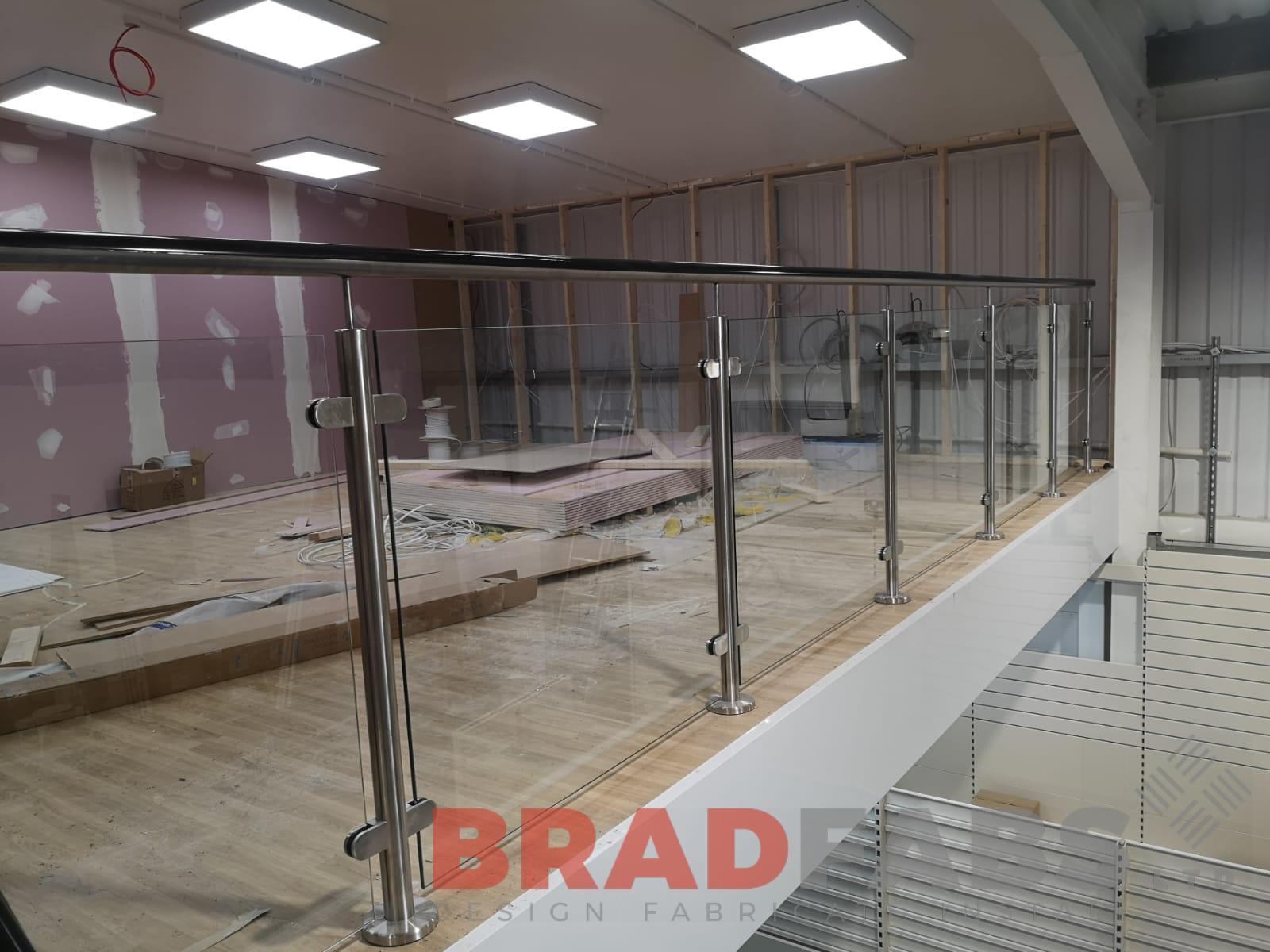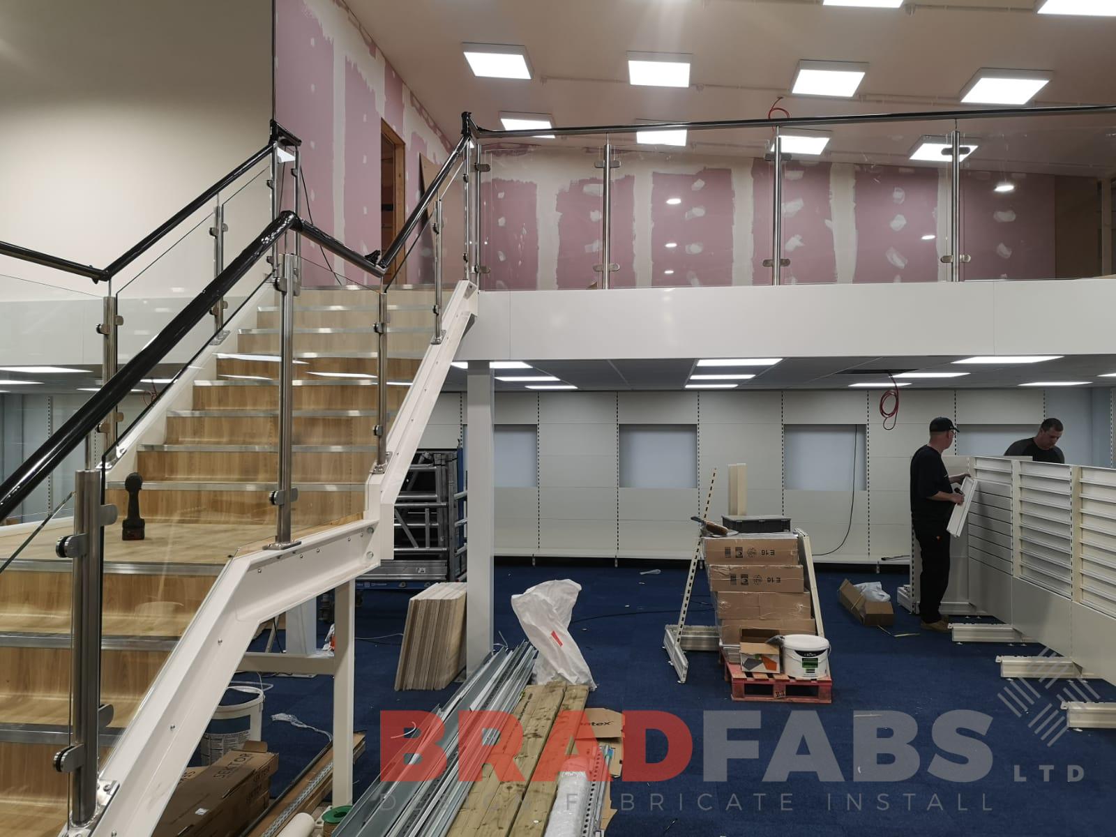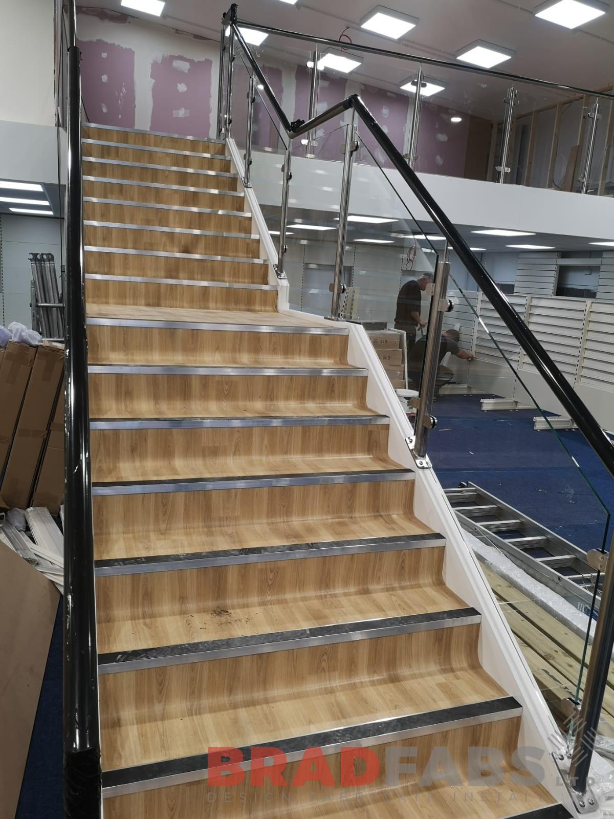 A large staircase for a commercial property done by our team this week! Our team designed, fabricated and installed the mild steel and powder coated frame, with the 48.3 dia stainless steel balustrade and 10mm toughened safety glass infill panels.