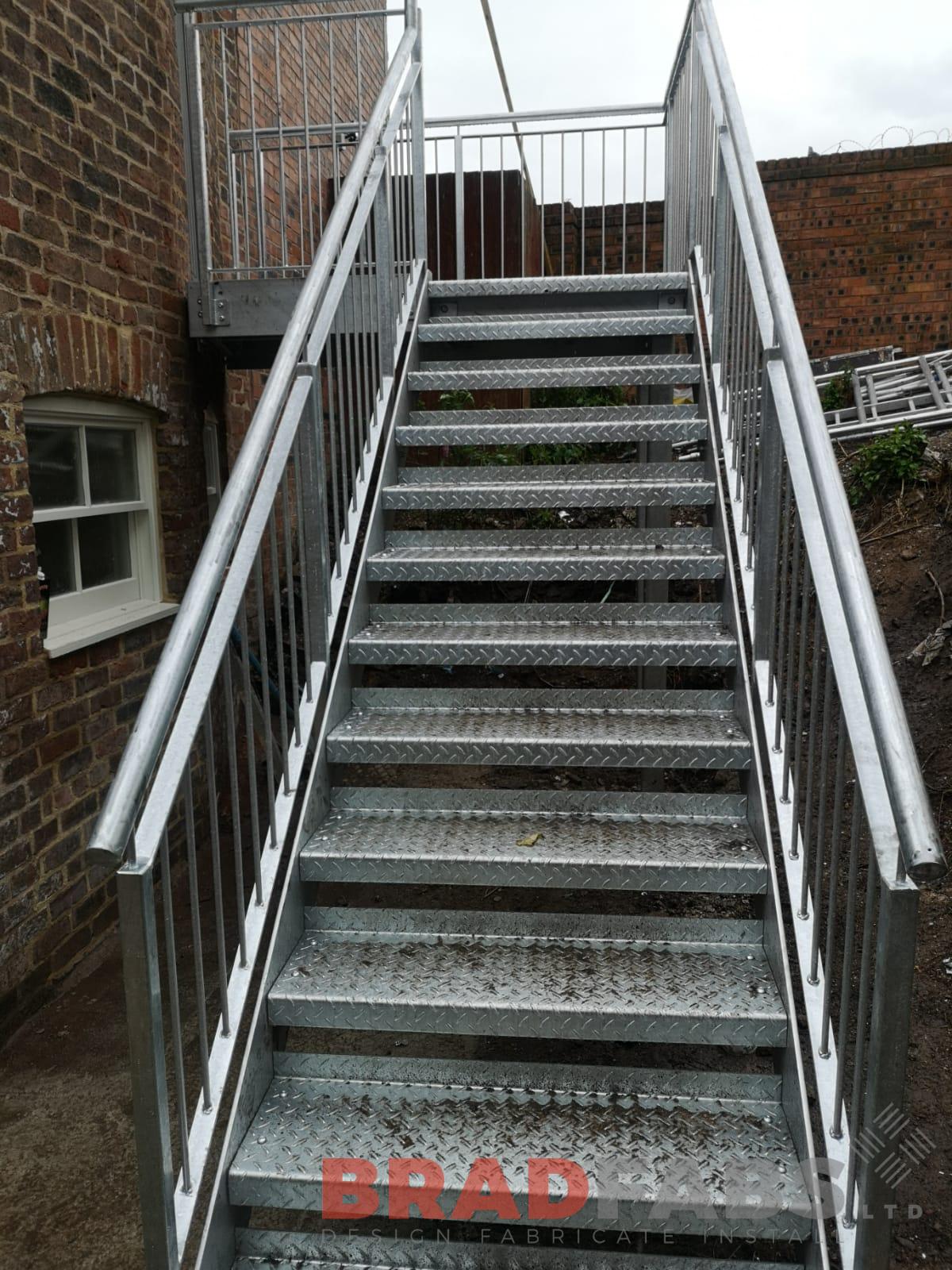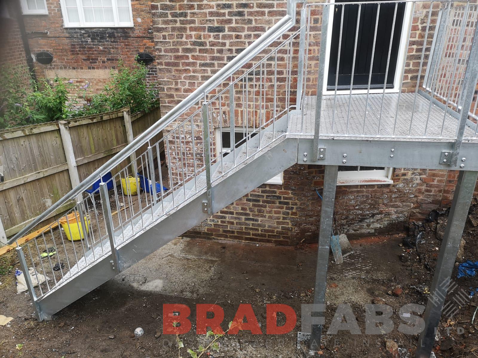 Straight external staircase manufactured in mild steel and galvanised, with vertical bar balustrade and complete with durbar treads