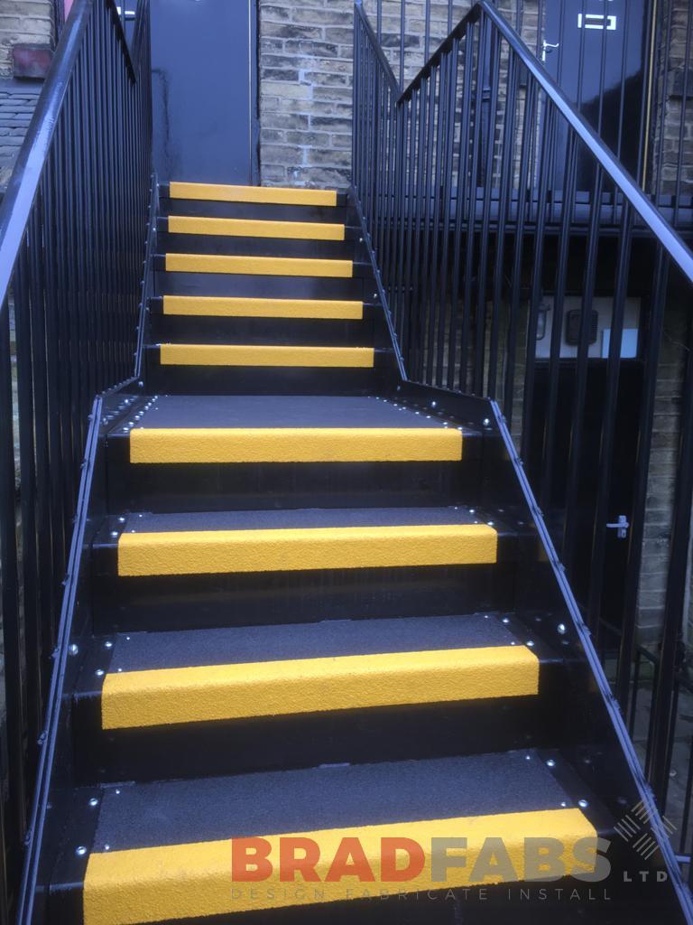Mild steel, galvanised and powder coated finish to RAL colour of our customers choice, with yellow nosings on the treads as an additional safety feature