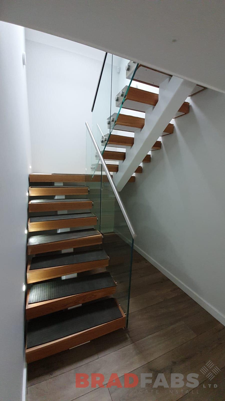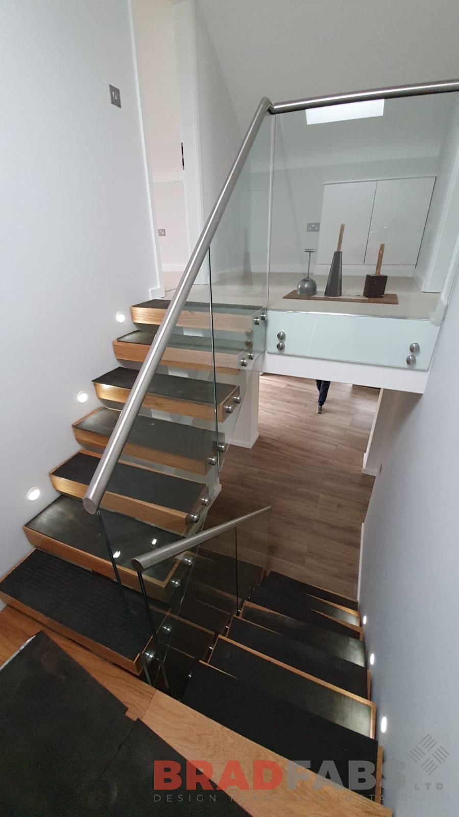 Straight staircase for a domestic property, with 48.3 dia stainless steel handrail and infinity glass balustrade, complete with chunky oak treads