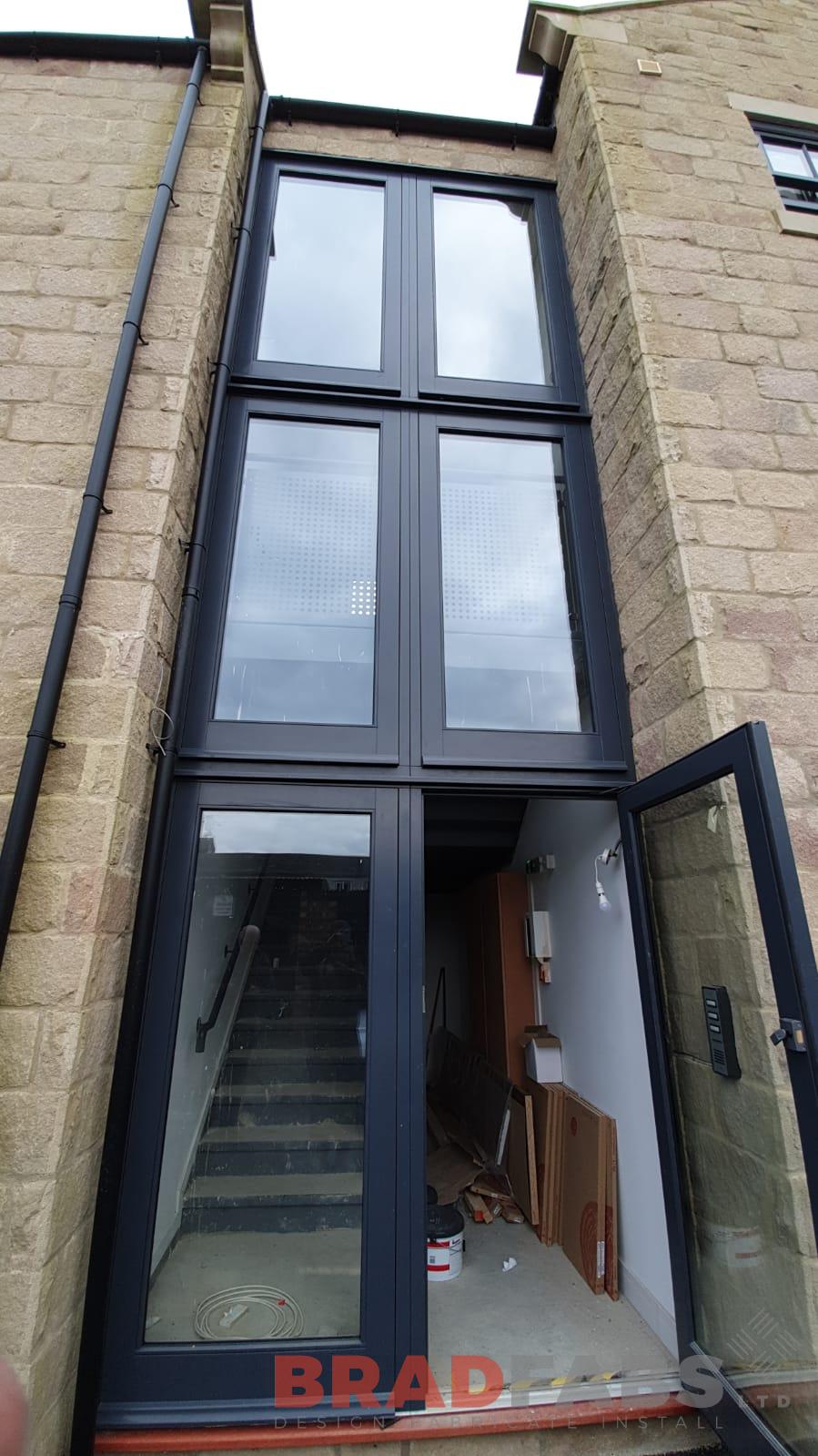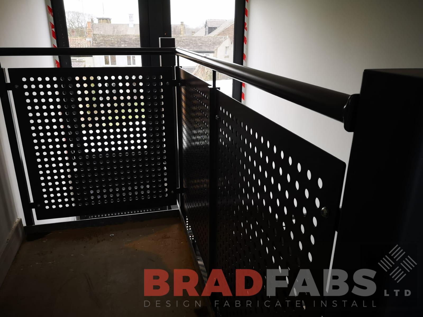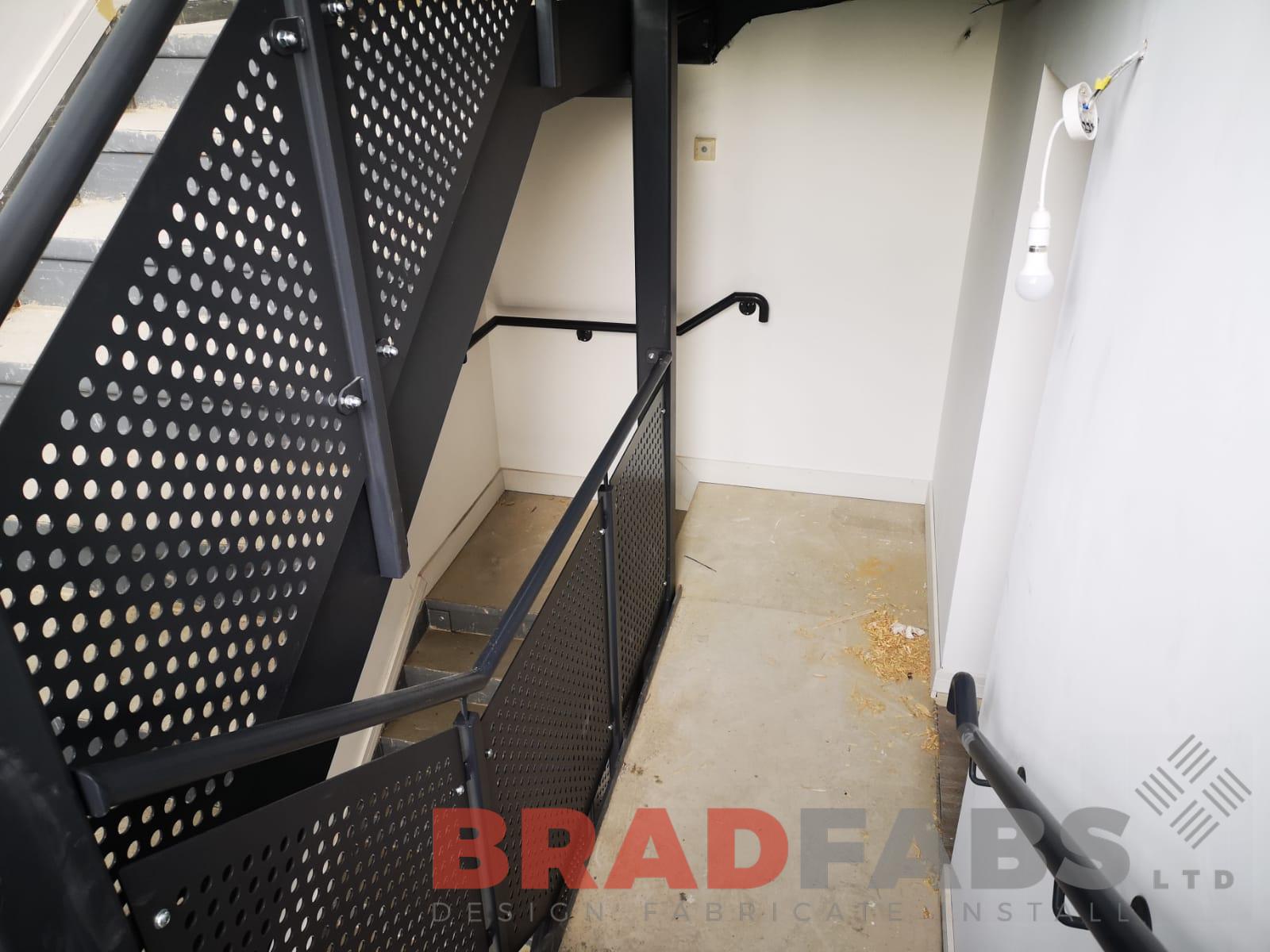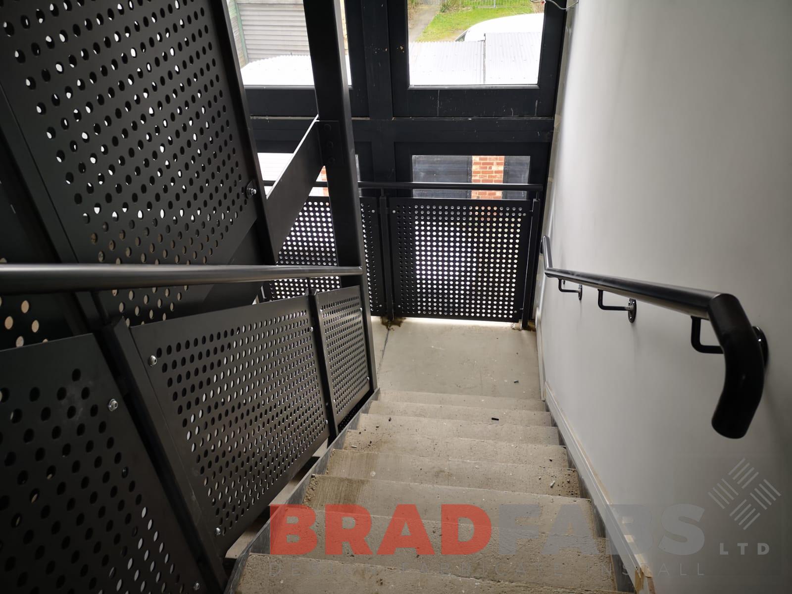 Straight bespoke internal staircase for a residential block of flats, with laser cut infill panel balustrade