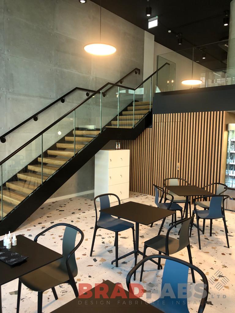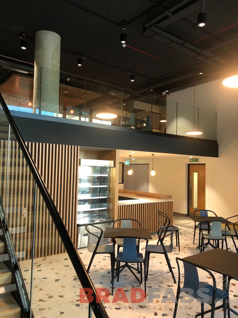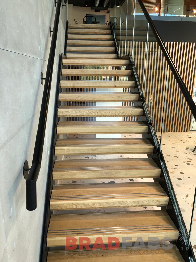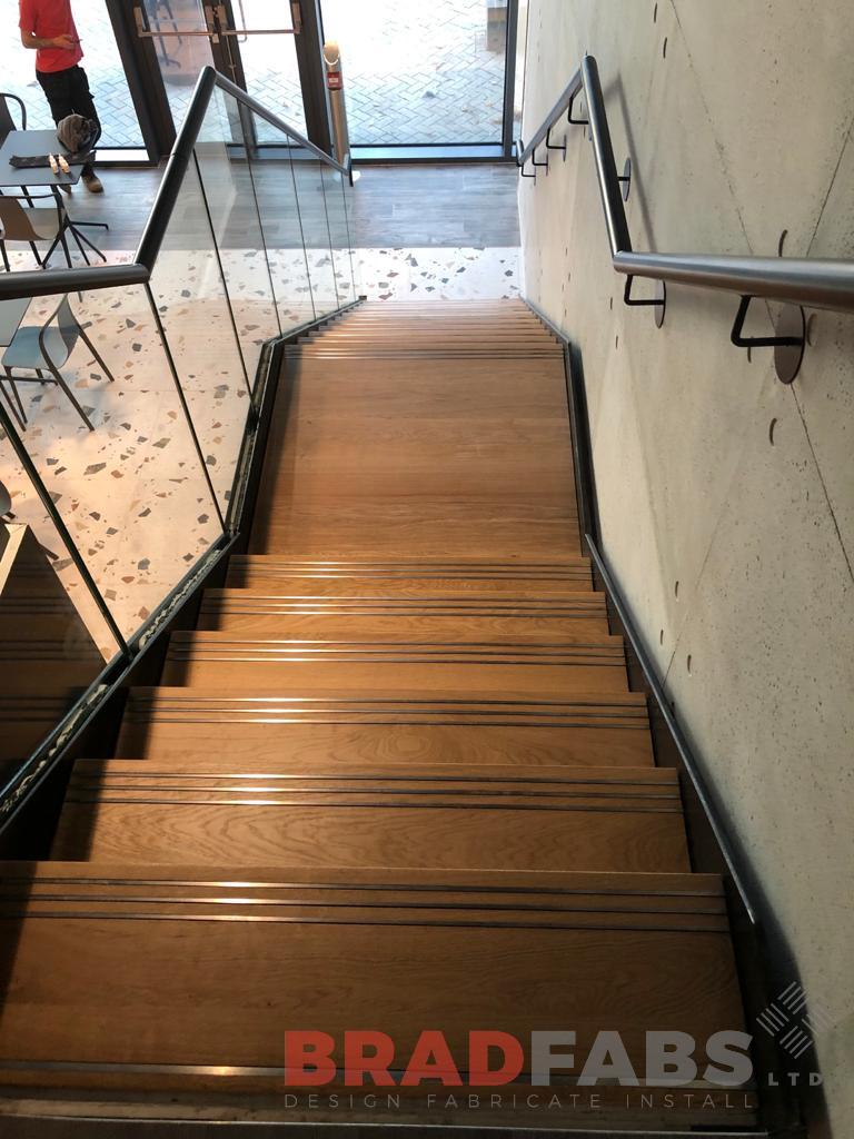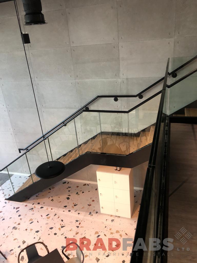 Large internal staircase with box type oak treads and 21.5mm toughened laminated glass, complete with infinity glass leading to atrium