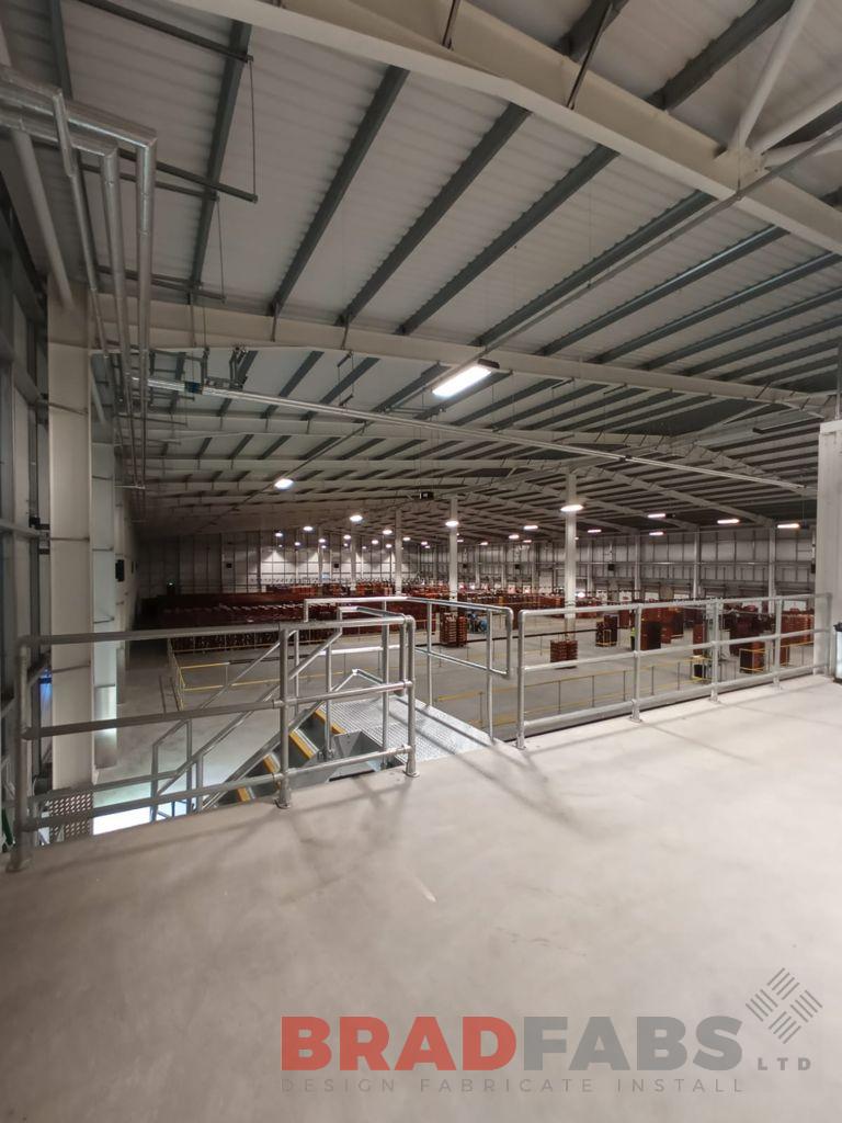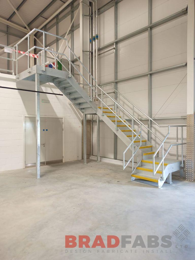 Large internal staircase, manufactured in mild steel, with top and mid rail balustrade complete with durbar treads and yellow nosings