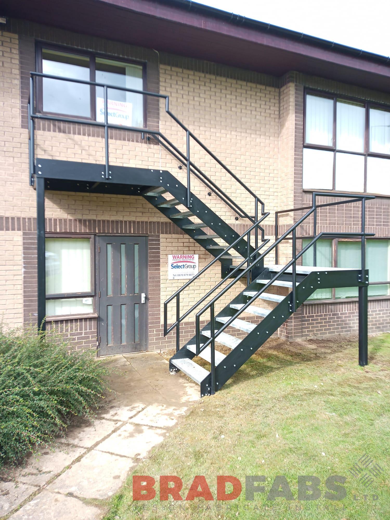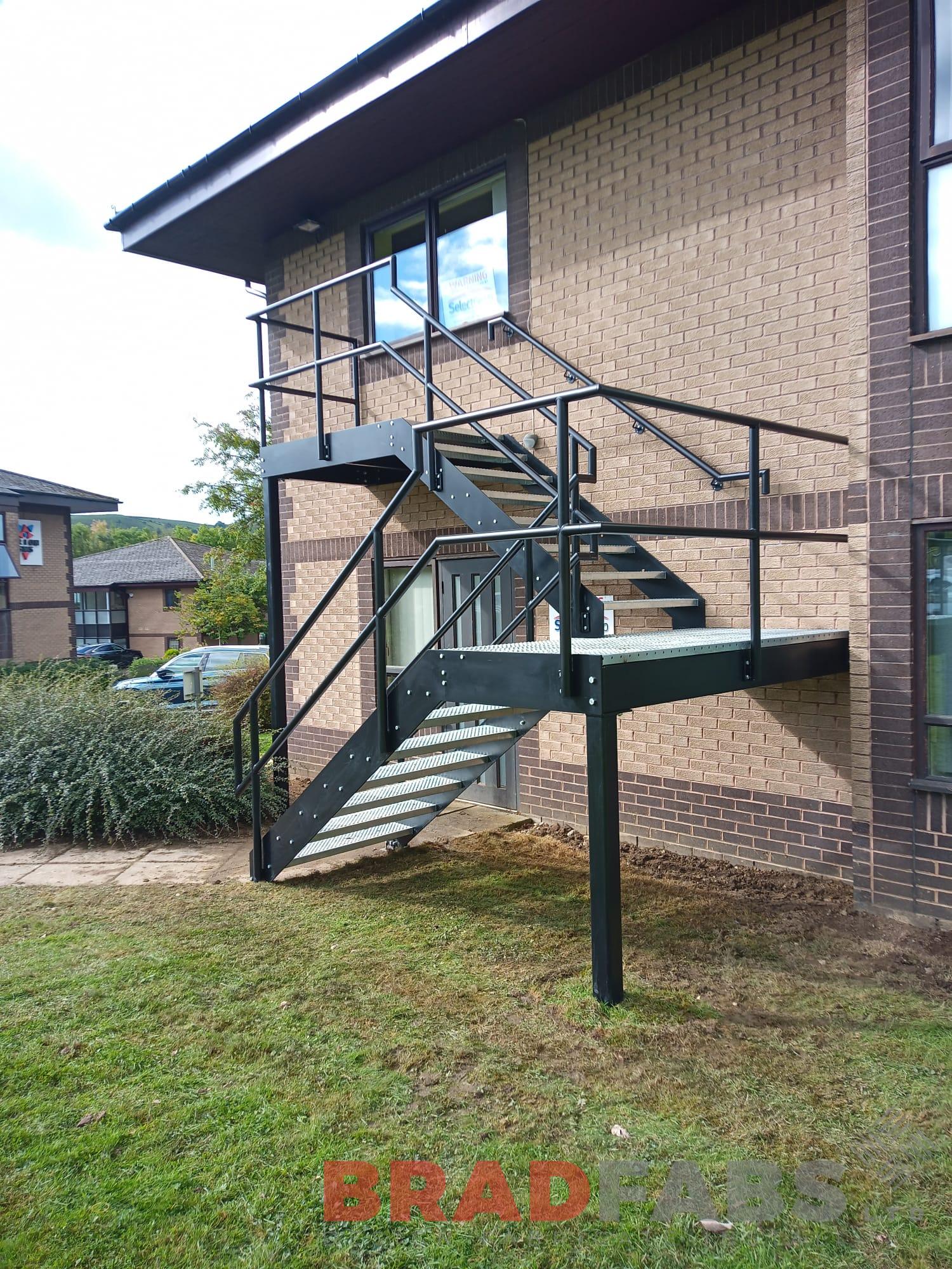 Bespoke external staircase with top and mid landing, top and mid rail balustrade complete with BNOP5 treads and landings