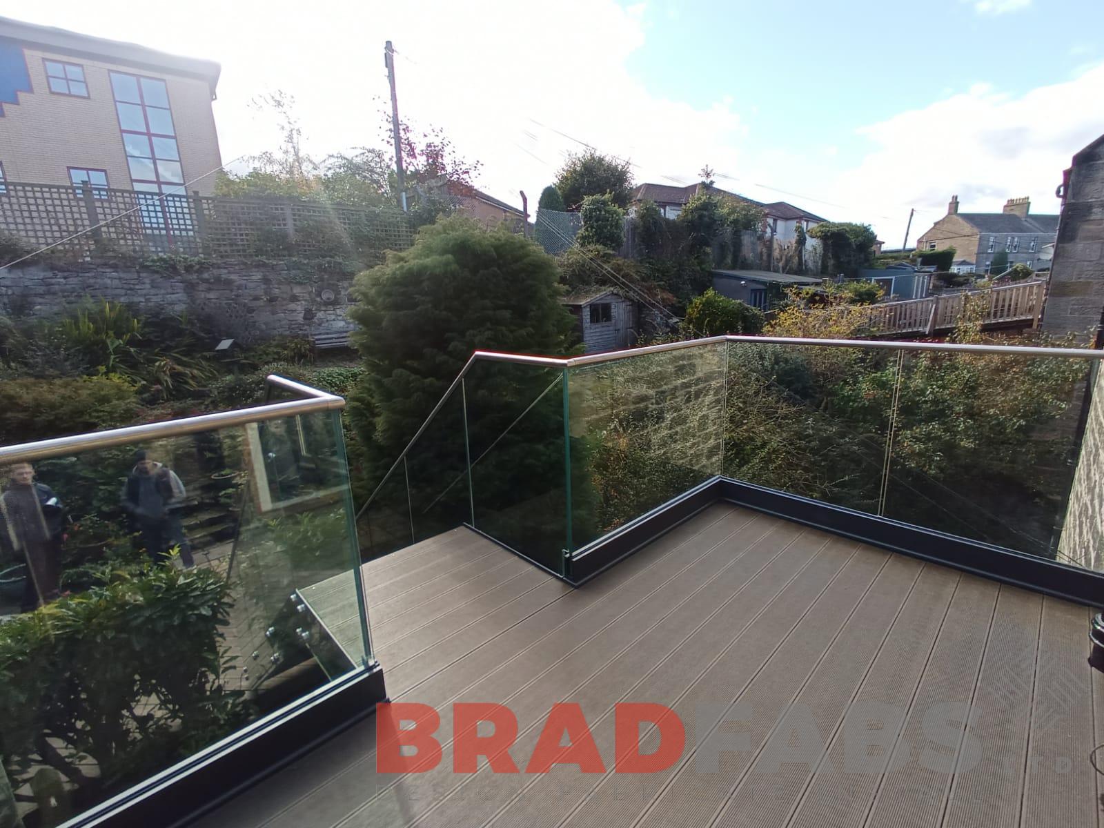 External staircase with balcony, with aluminium channel system and 21.5mm laminated glass infill panels bolt on with stainless steel top rail
