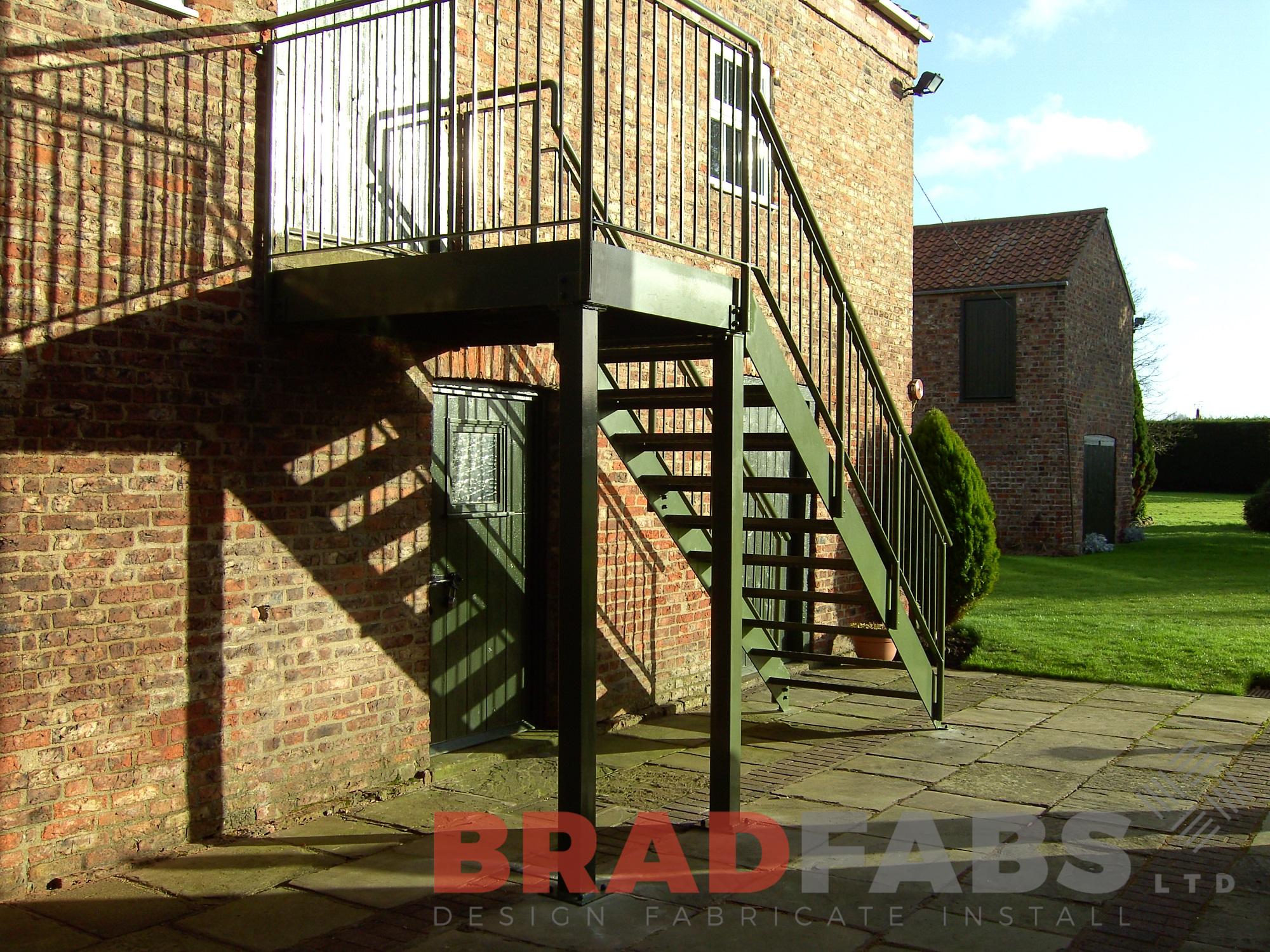 Bradfabs designed and fabricated this straight staircase with landing , the existing timber one was rotten. It was fabricated using galvanized mild steel with anti slip treads, powder coated green. Installed in Yorkshire.
