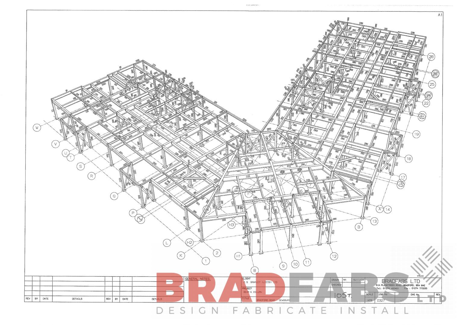 The working engineering drawings of the structural engineering site, which was later fabricated with steelwork and installed 173 apartments at Joshua Ellis Mills in Dewsbury West Yorkshire (1).