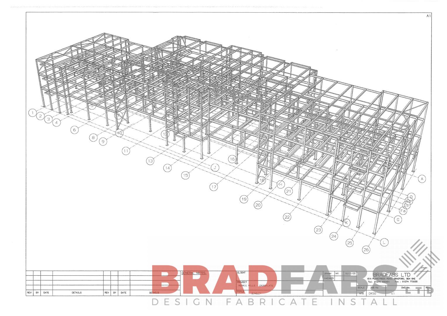 The working engineering drawings of the structural engineering site was later fabricated with steelwork and installed for the refurbishment of 125 apartments at King Cole Mills in Crossflats, West Yorkshire (7)