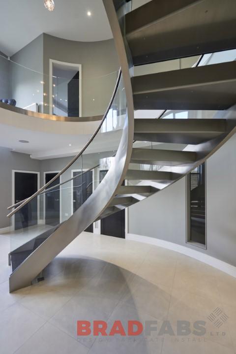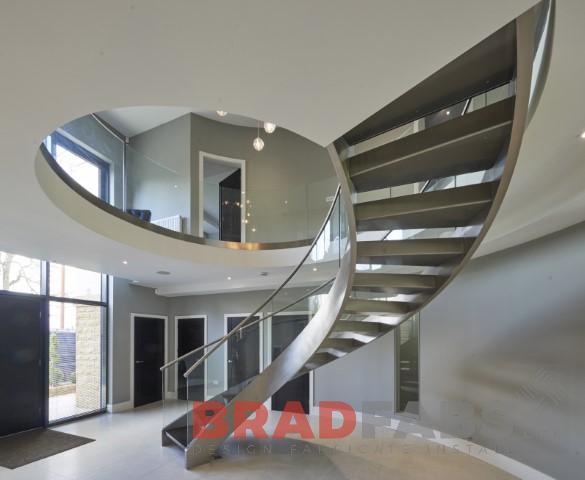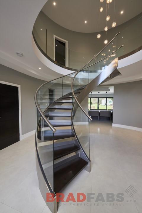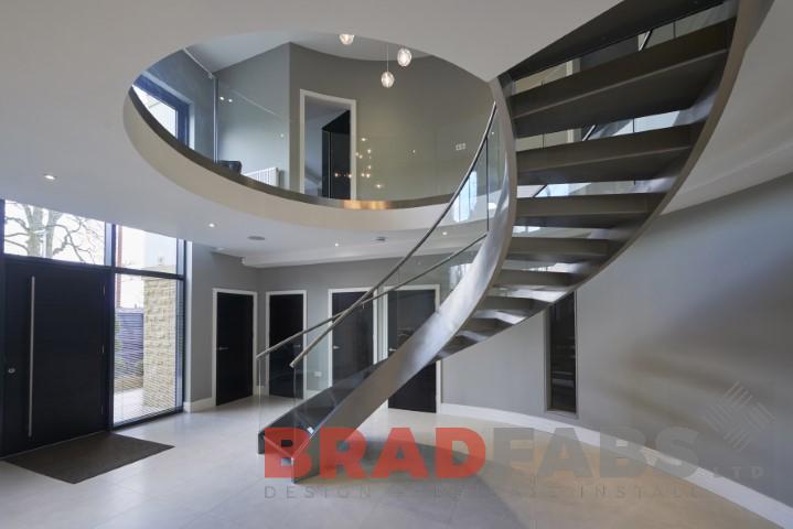 Bradfabs was commissioned to make this spectacular staircase. Not many companies possess the skills to make a curved steel staircase, this staircase was manufactured with polished stainless steel stringers and solid oak treads.