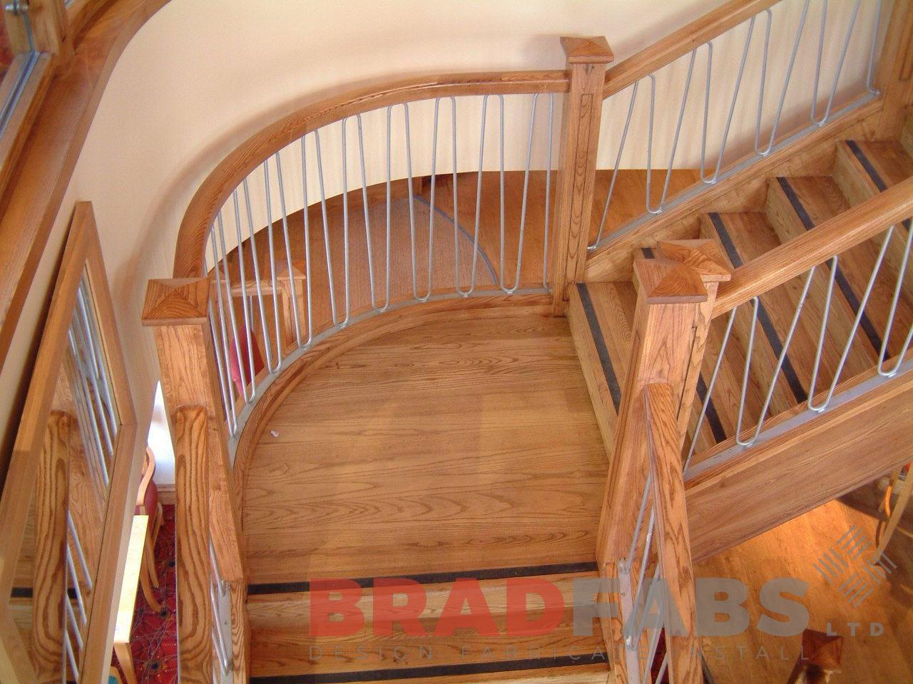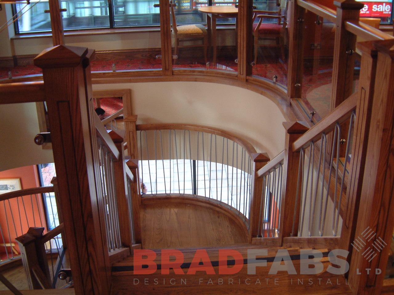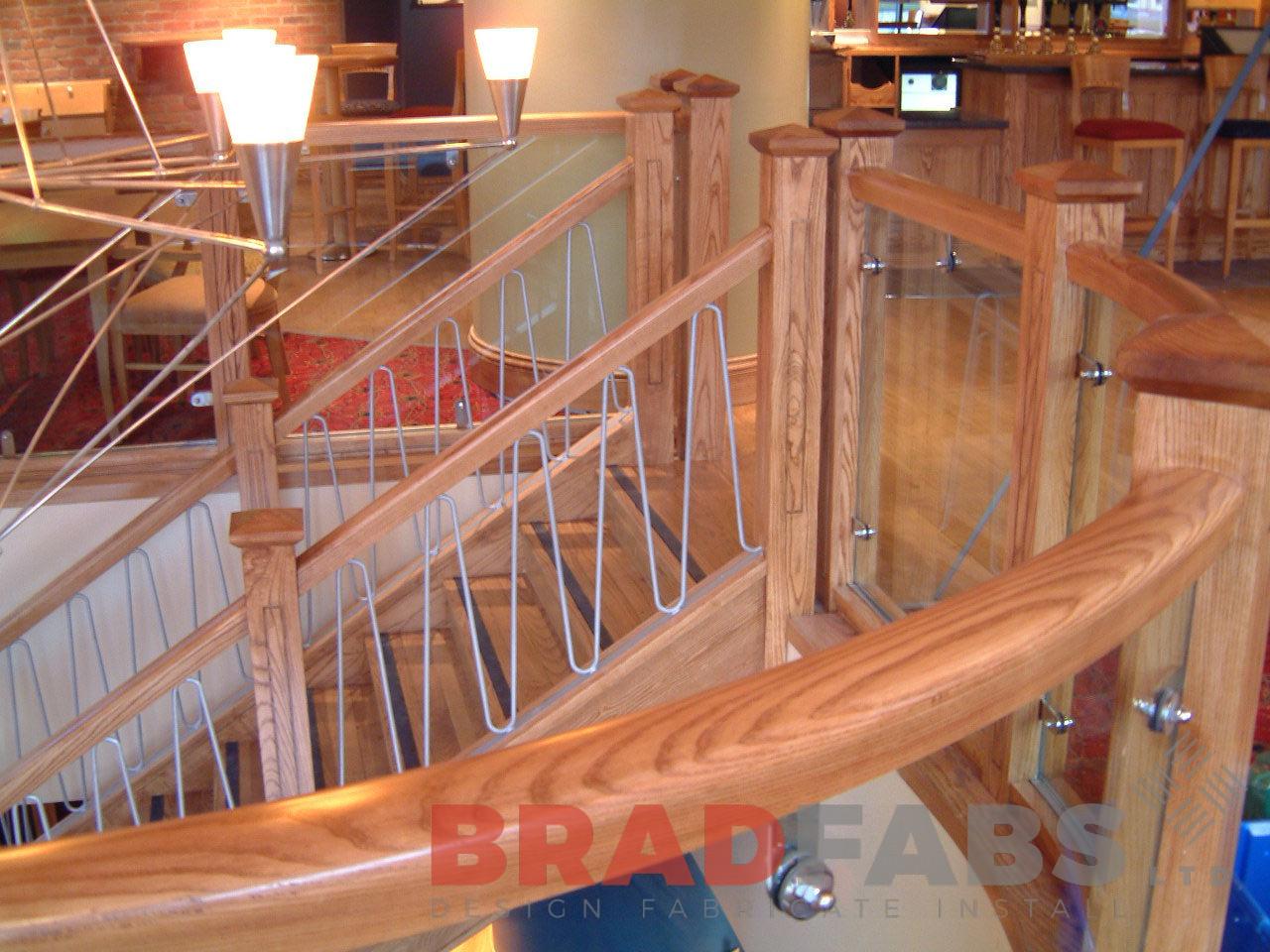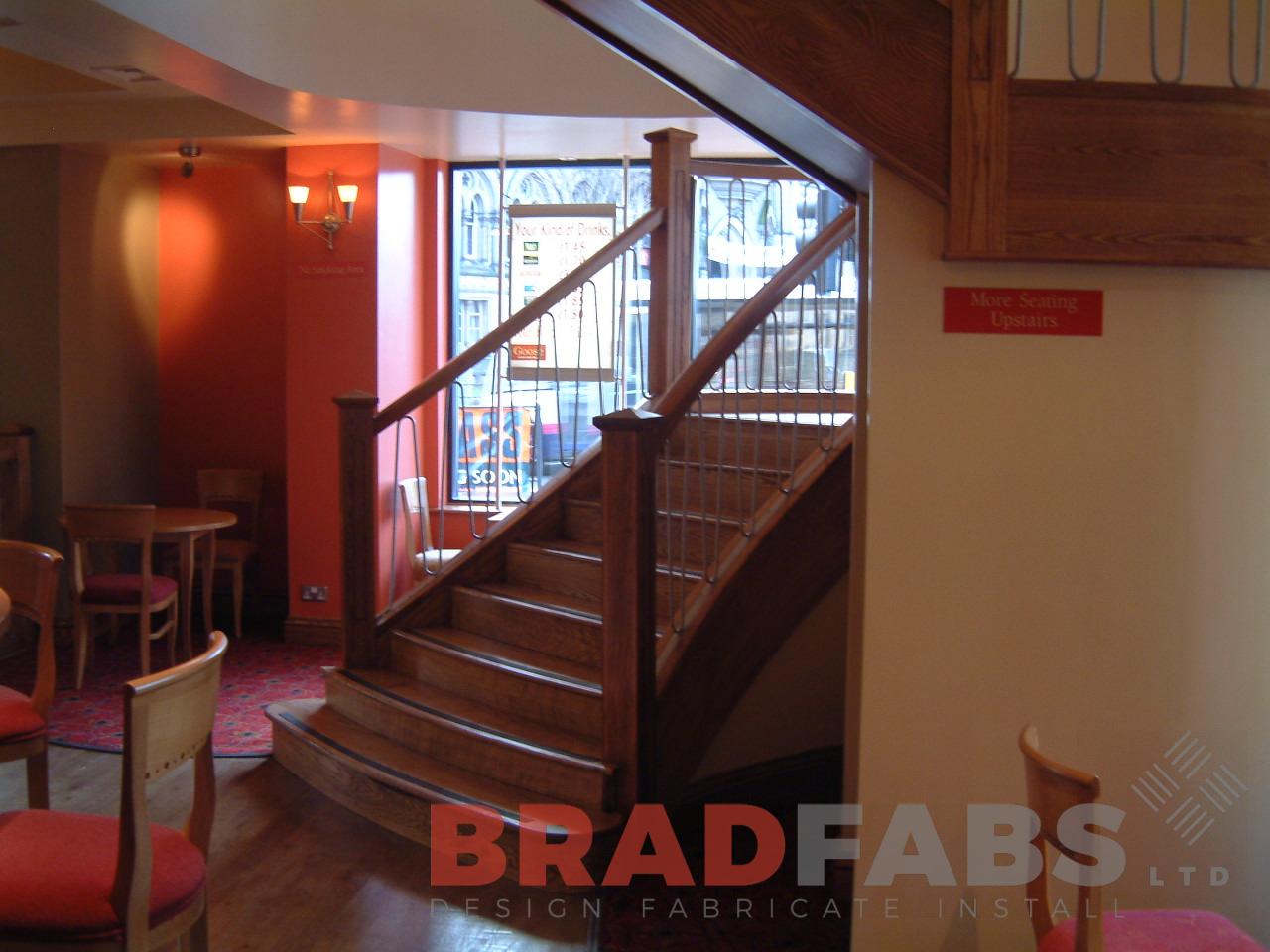 Helix staircase fabricated using mild steel, clad in timber and installed at a public house in Bradford, West Yorkshire.